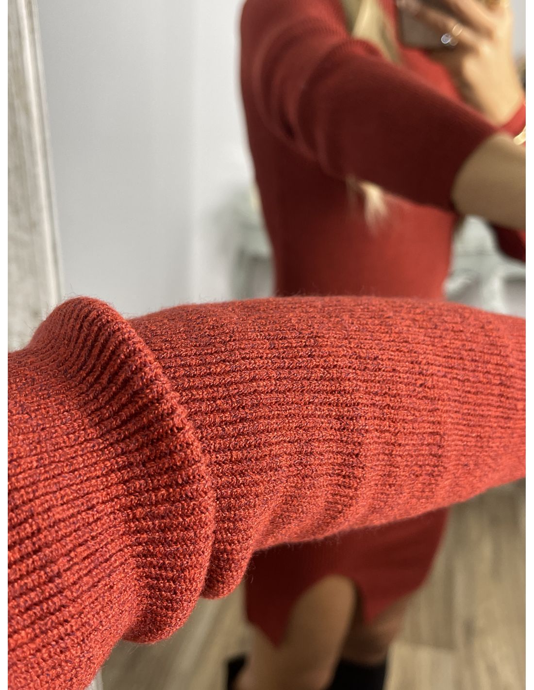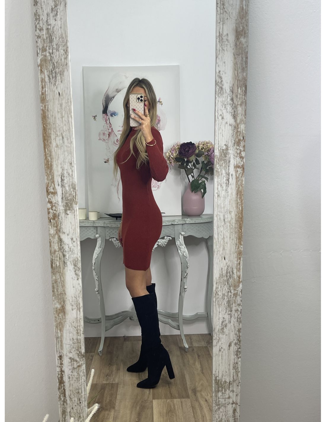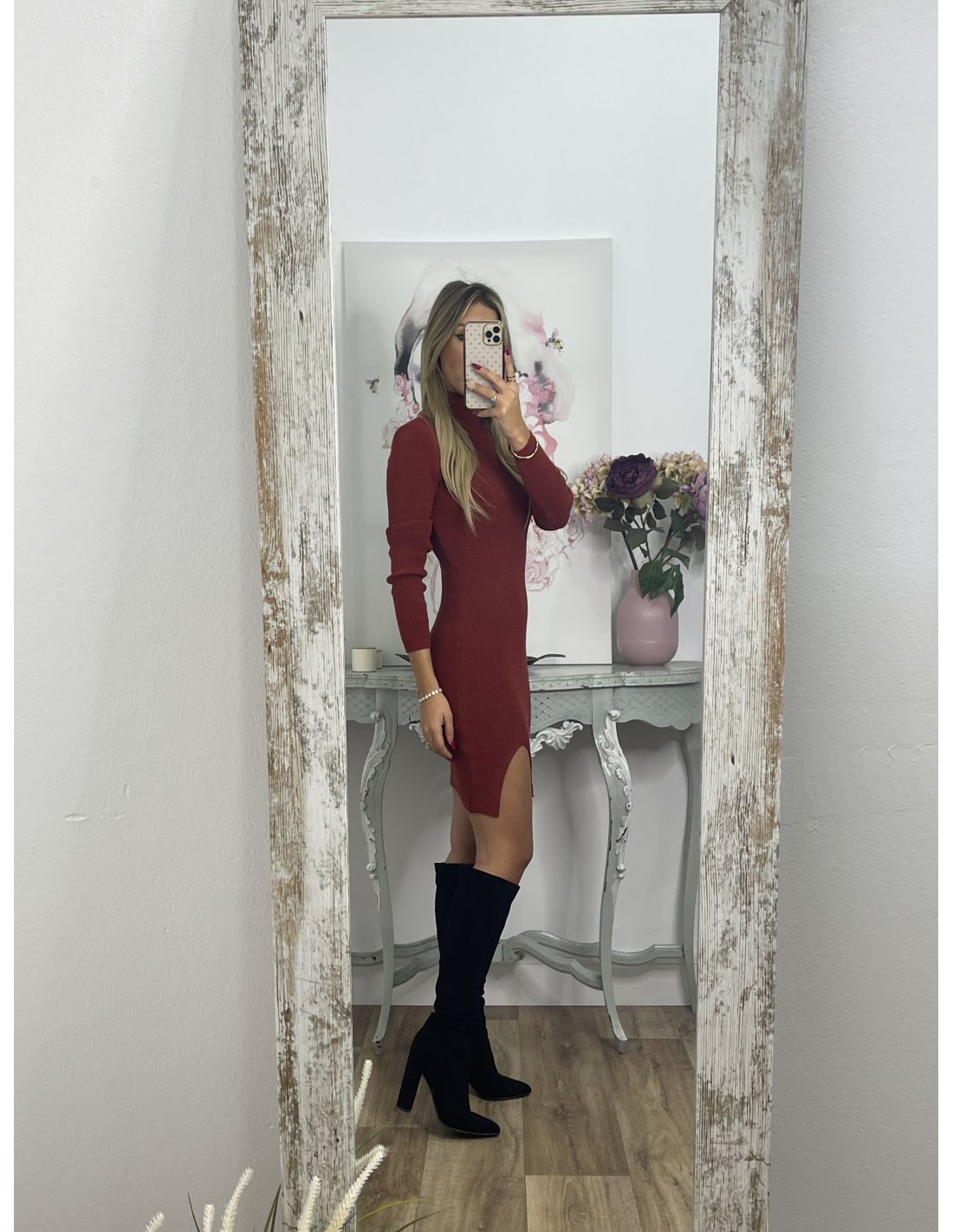 Vestido de punto ajustado, con cuello chimenea, con raja en la zona de la falda.