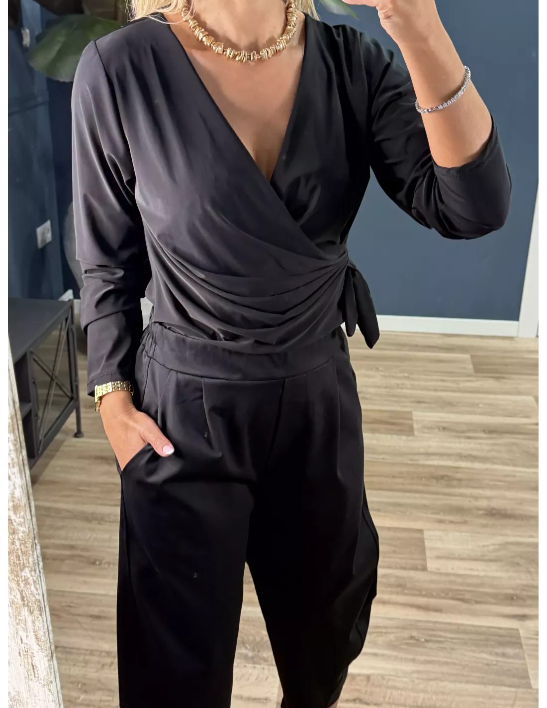 Blusa de punto de seda. De escote cruzado.