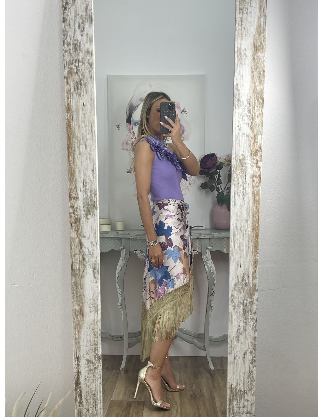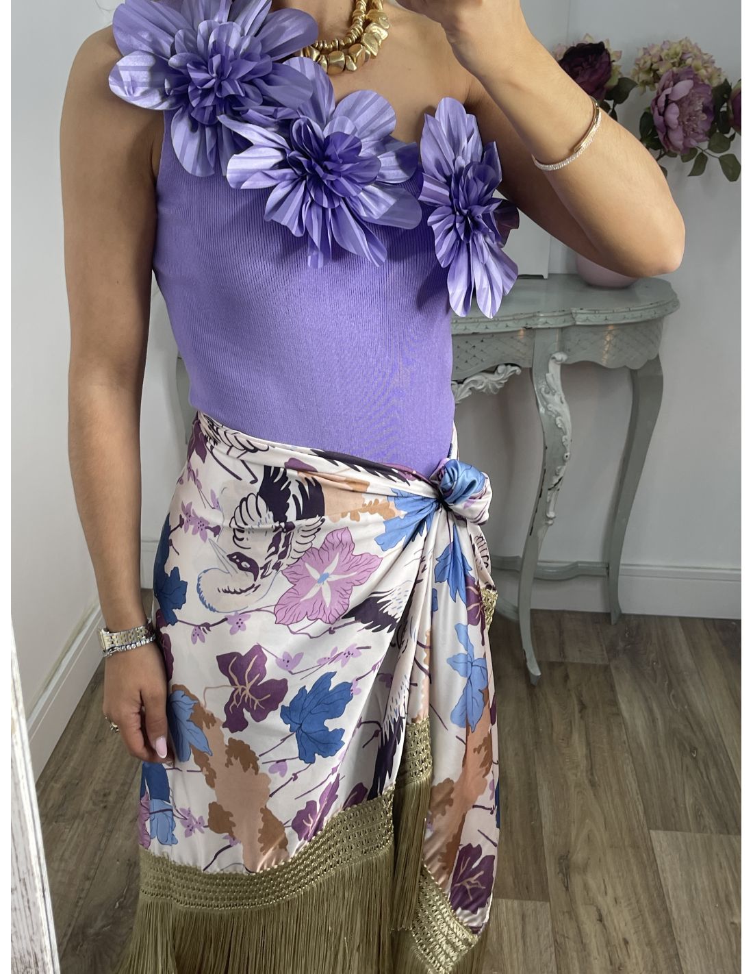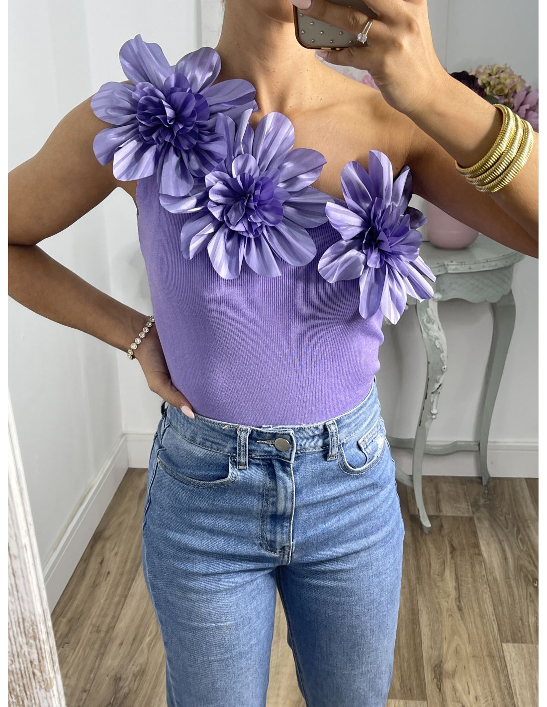 Body asimétrico, con detalle de flores en la zona delantera. El tejido es punto.