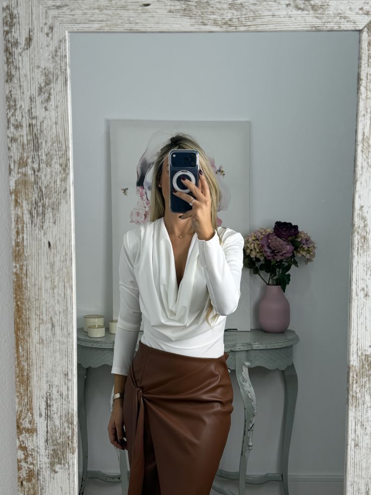 Body negro de licra con hombreras. La zona del culete es tipo tanga. El escote es en cascada.