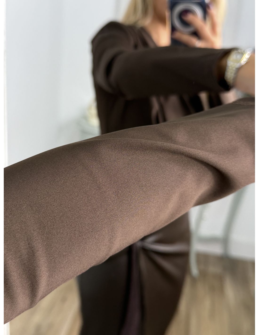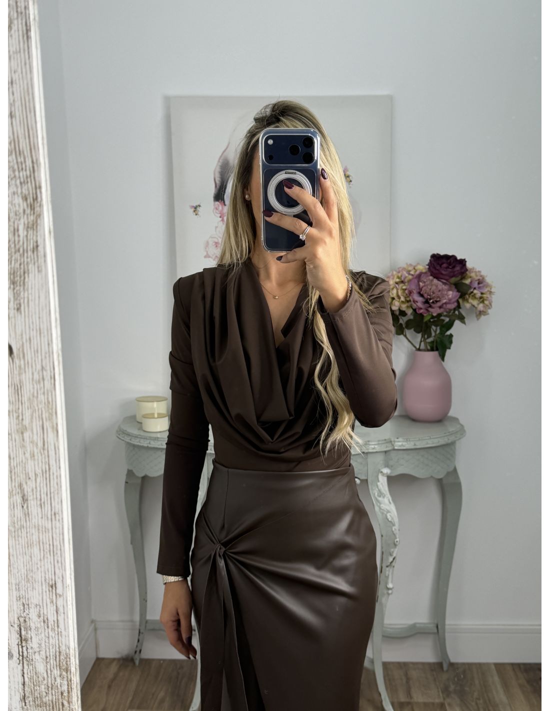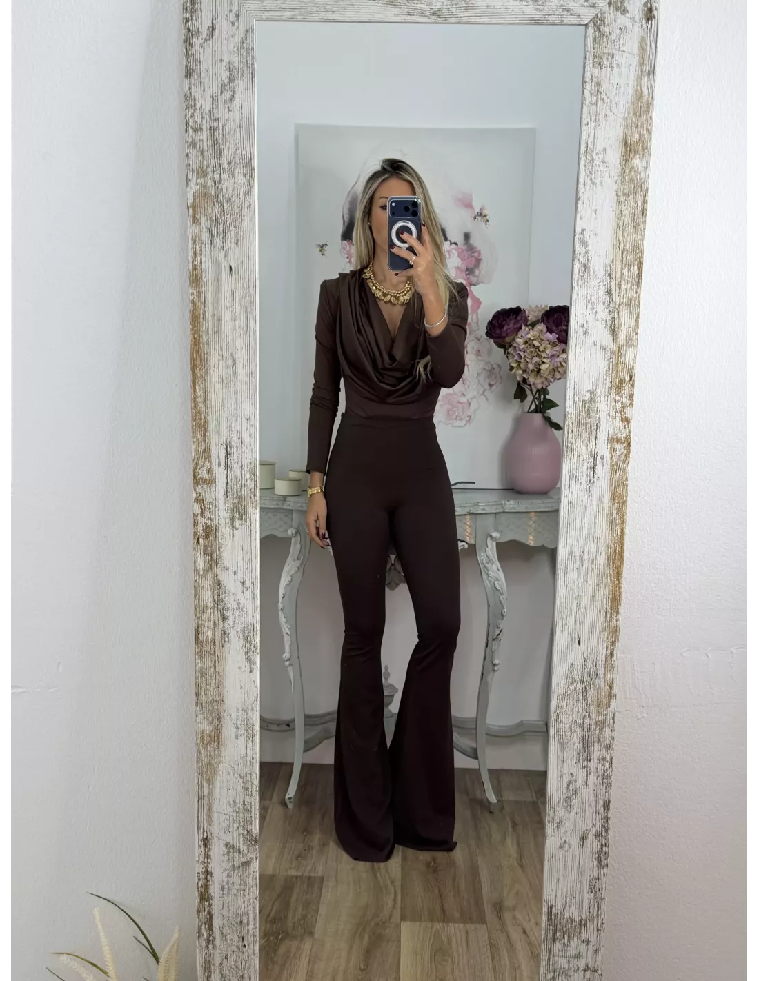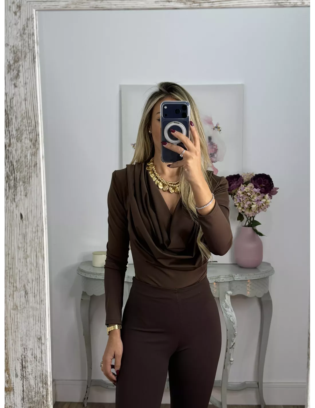 Body negro de licra con hombreras. La zona del culete es tipo tanga. El escote es en cascada.