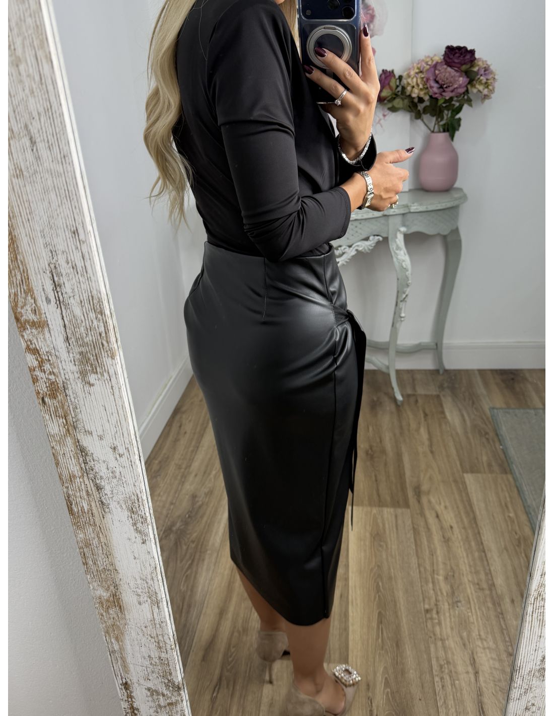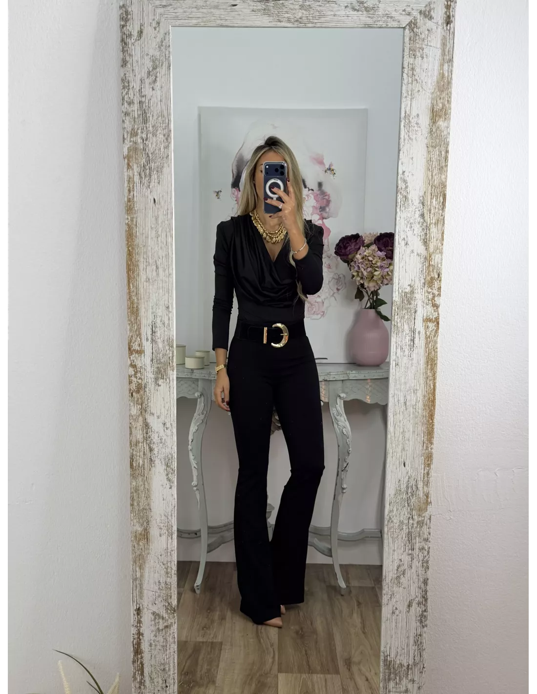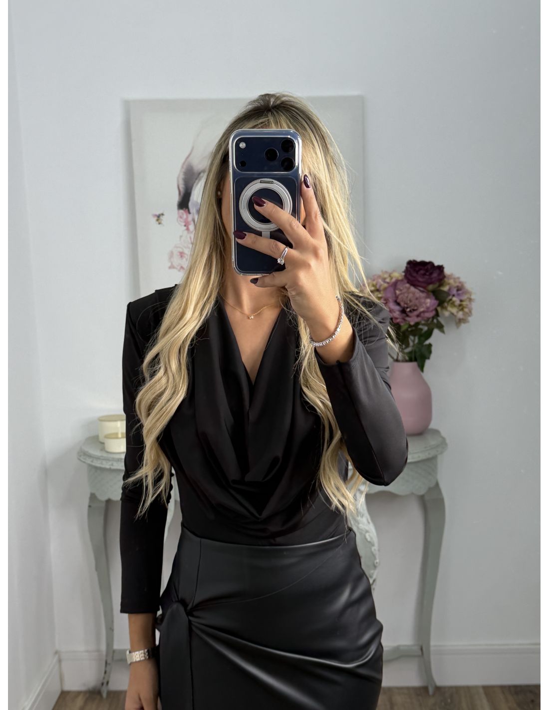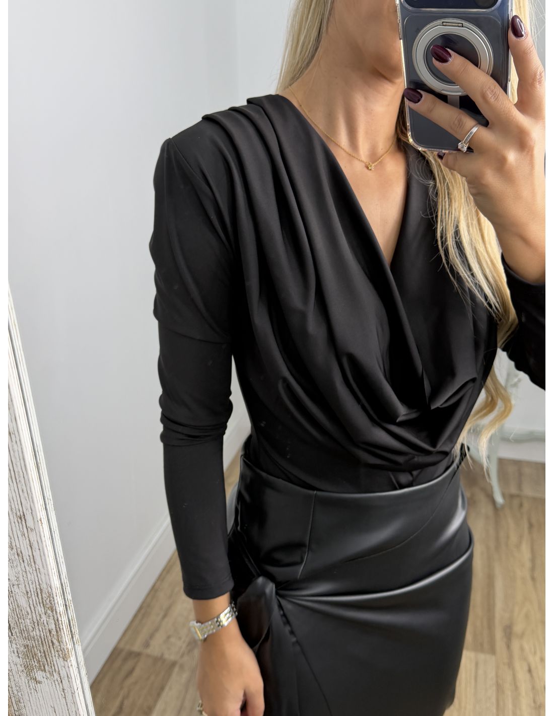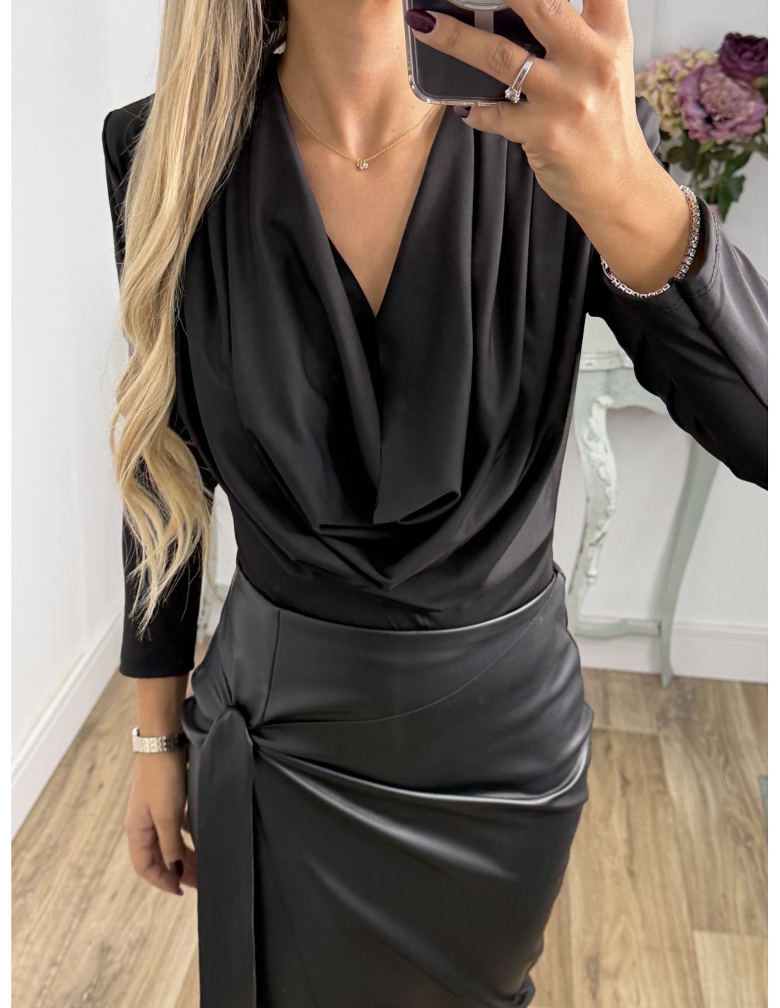 Body negro de licra con hombreras. La zona del culete es tipo tanga. El escote es en cascada.