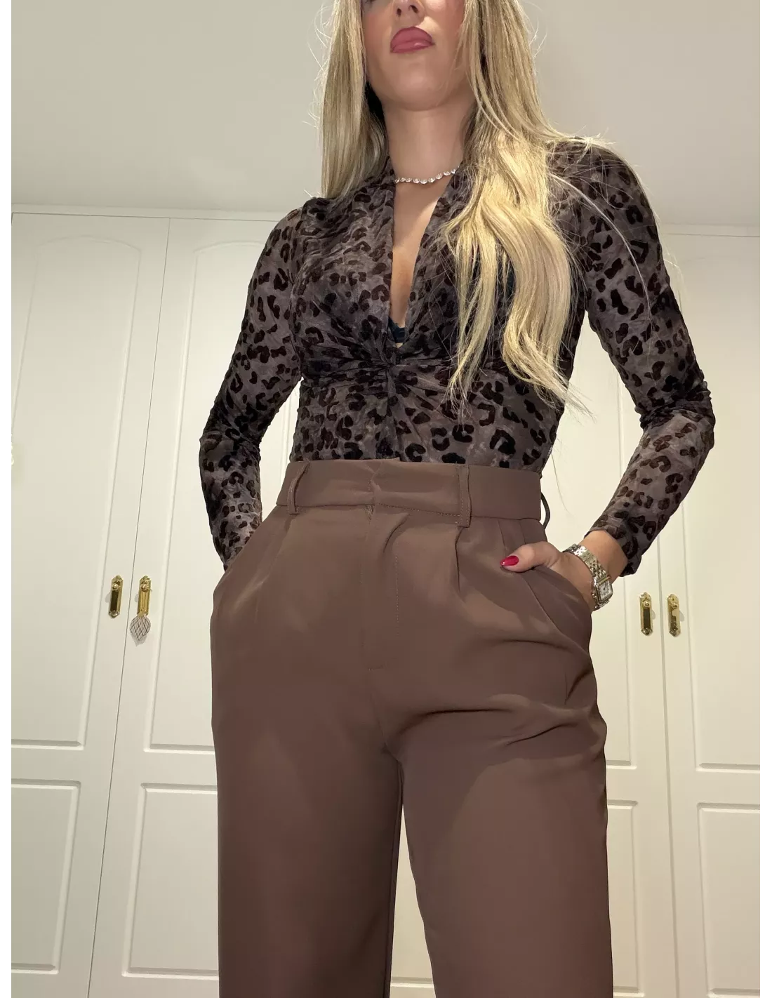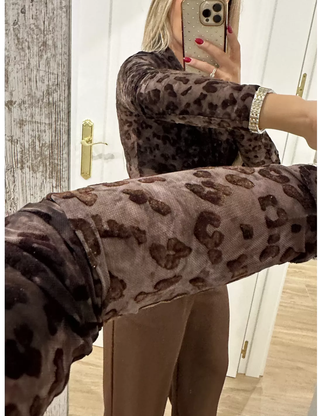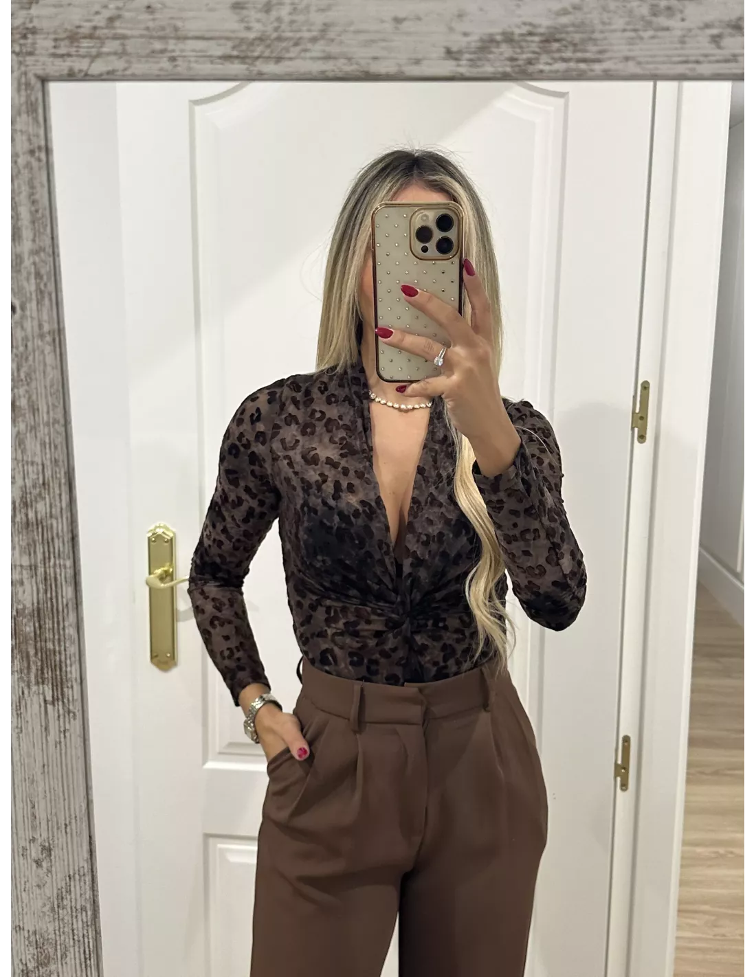 Body de tejido tipo tul con nudo en la zona del pecho y que lleva un print en relieve de terciopelo. La zona del culete es normal.