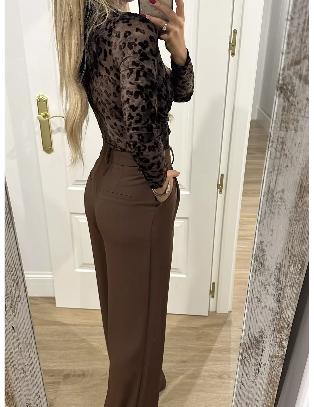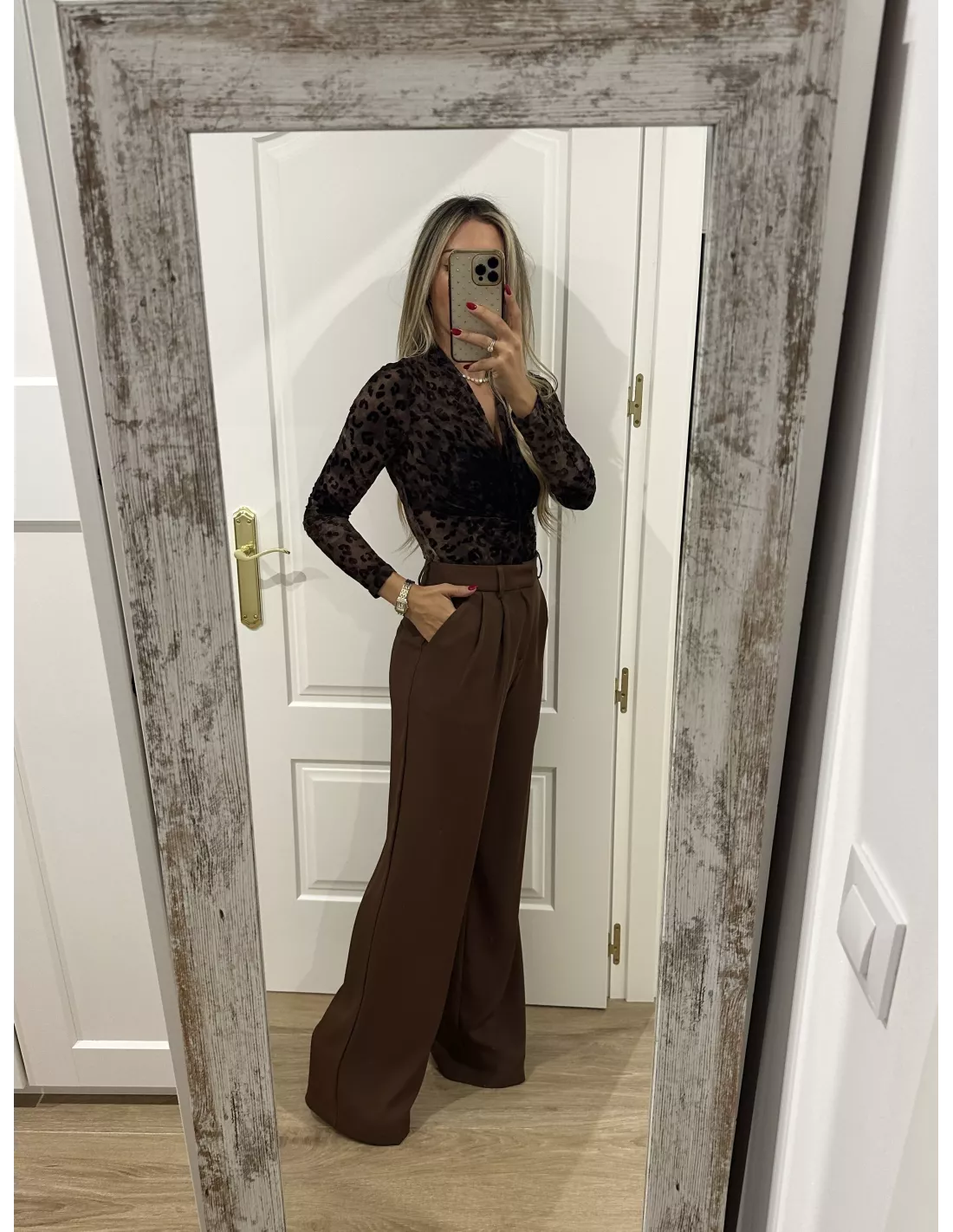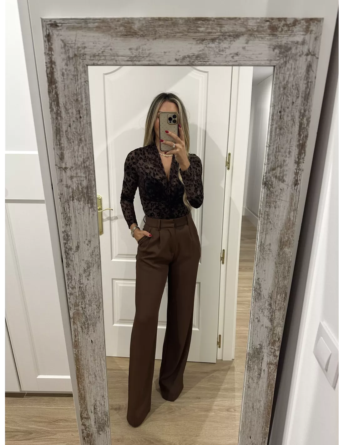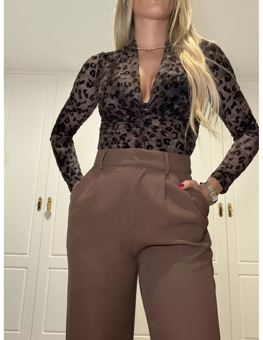 Body de tejido tipo tul con nudo en la zona del pecho y que lleva un print en relieve de terciopelo. La zona del culete es normal.