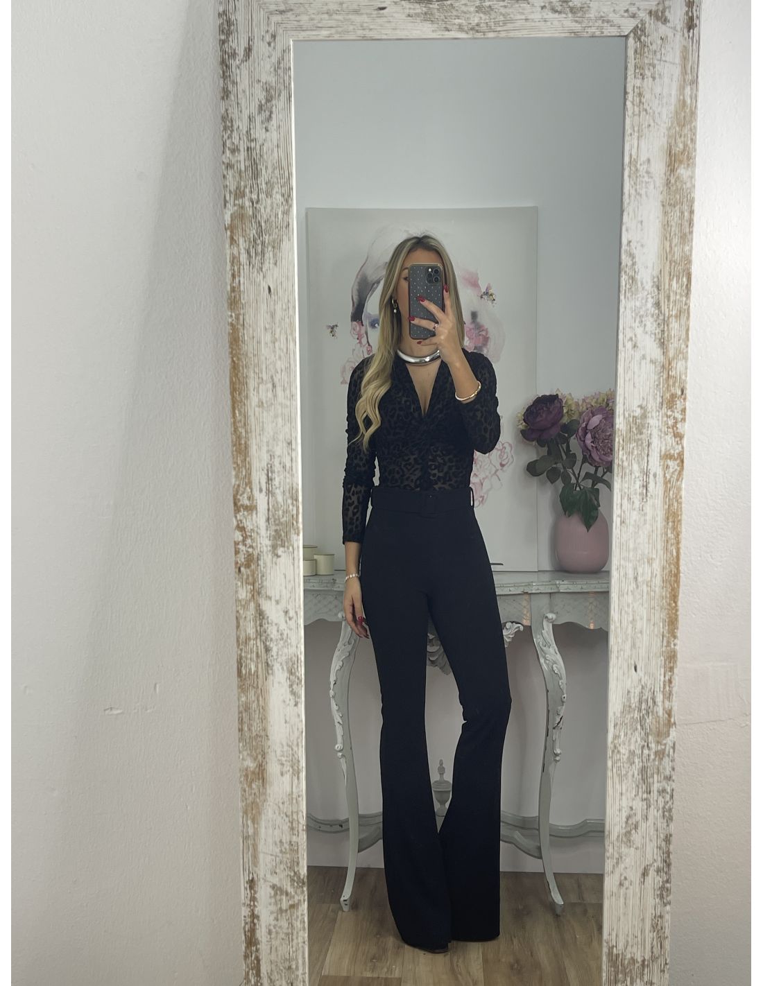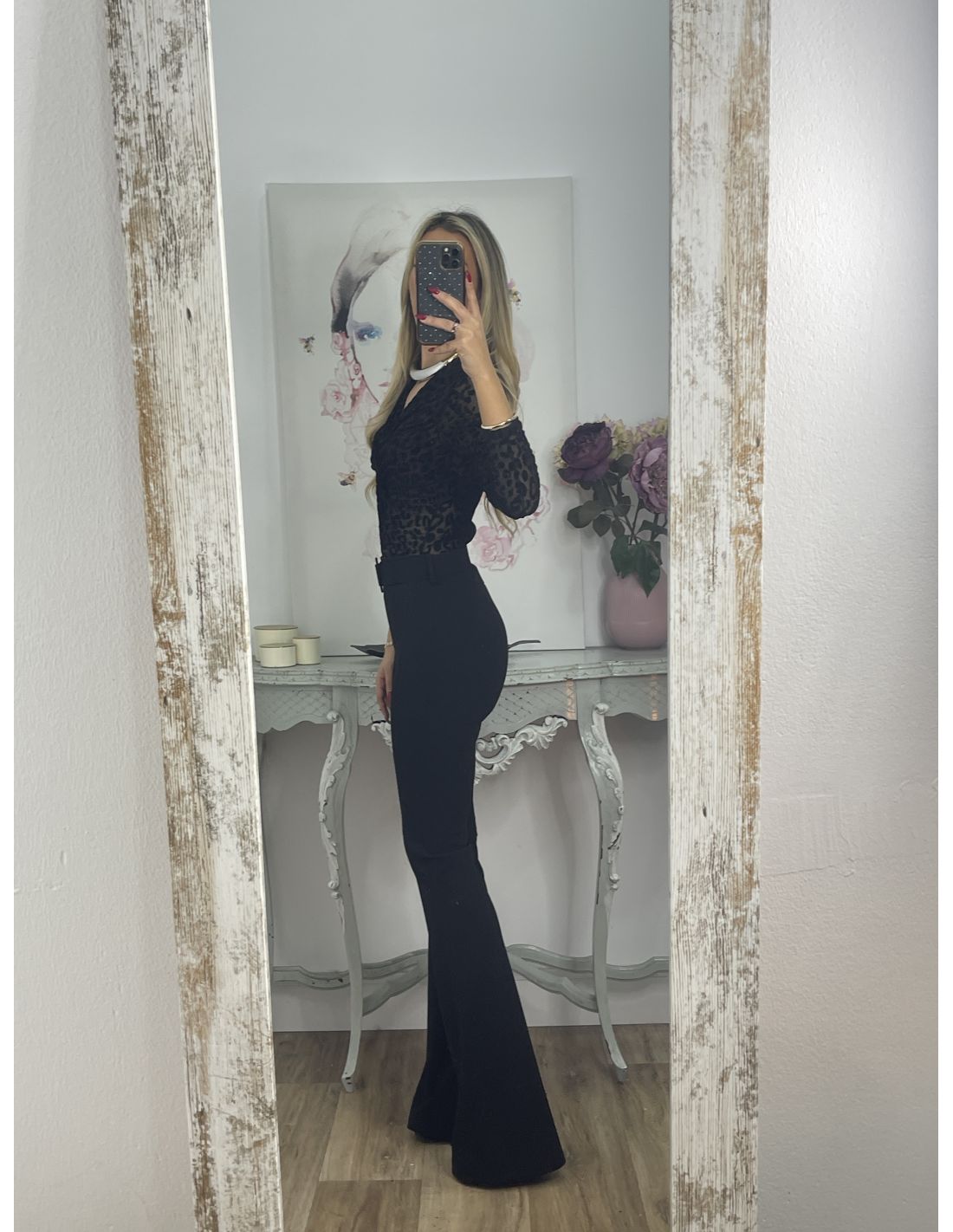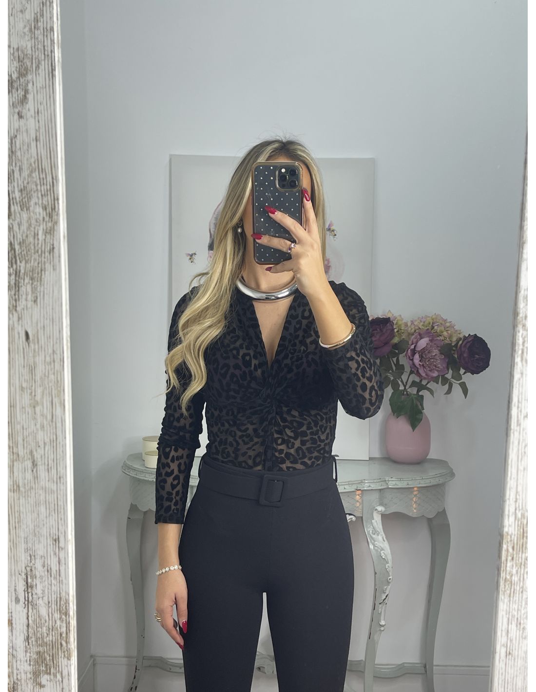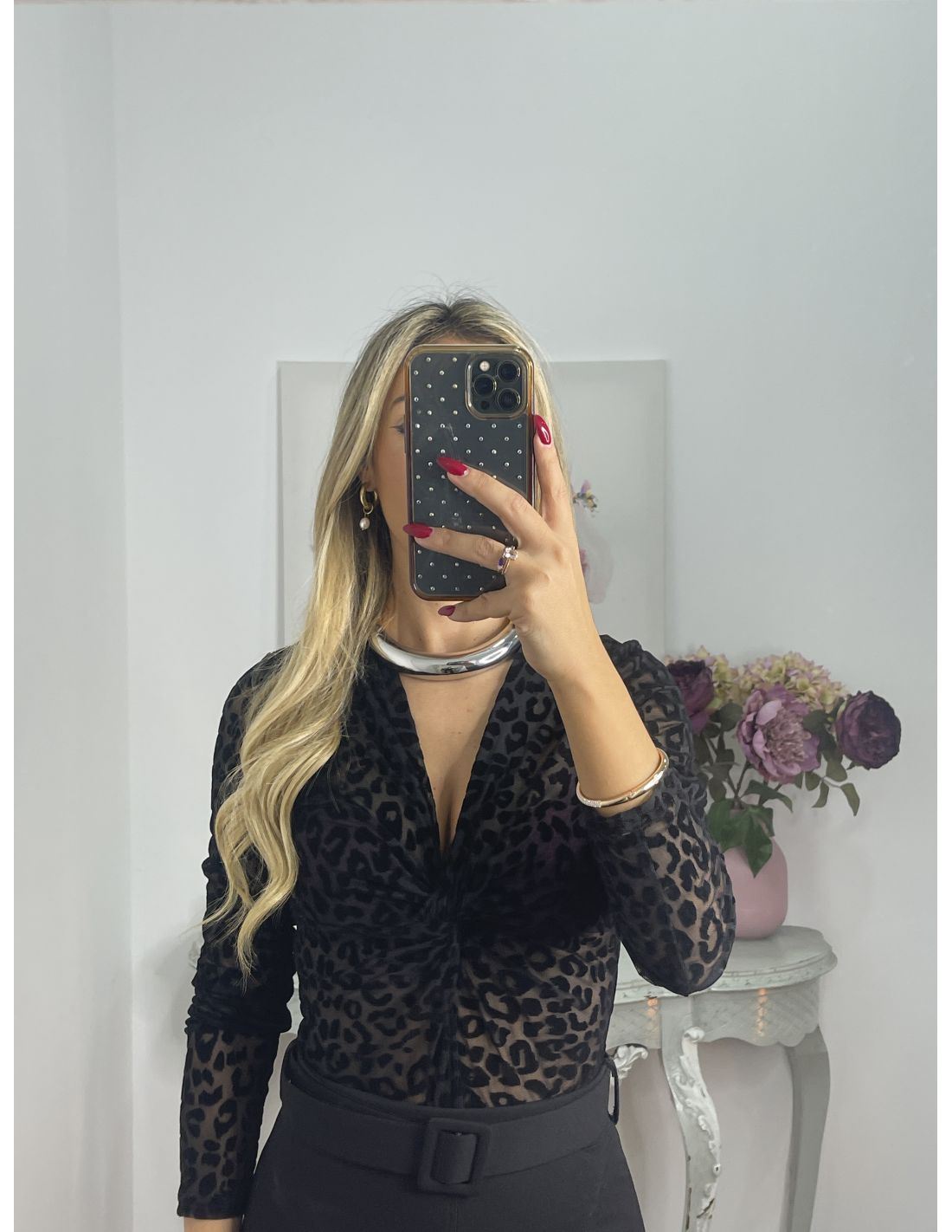 Body de tejido tipo tul con nudo en la zona del pecho y que lleva un print en relieve de terciopelo. La zona del culete es normal.