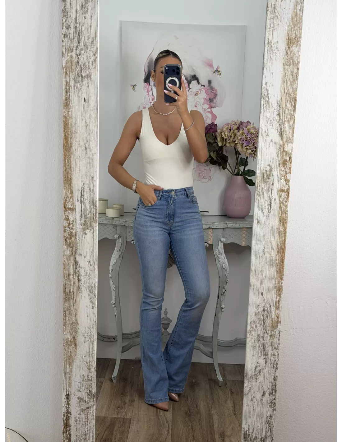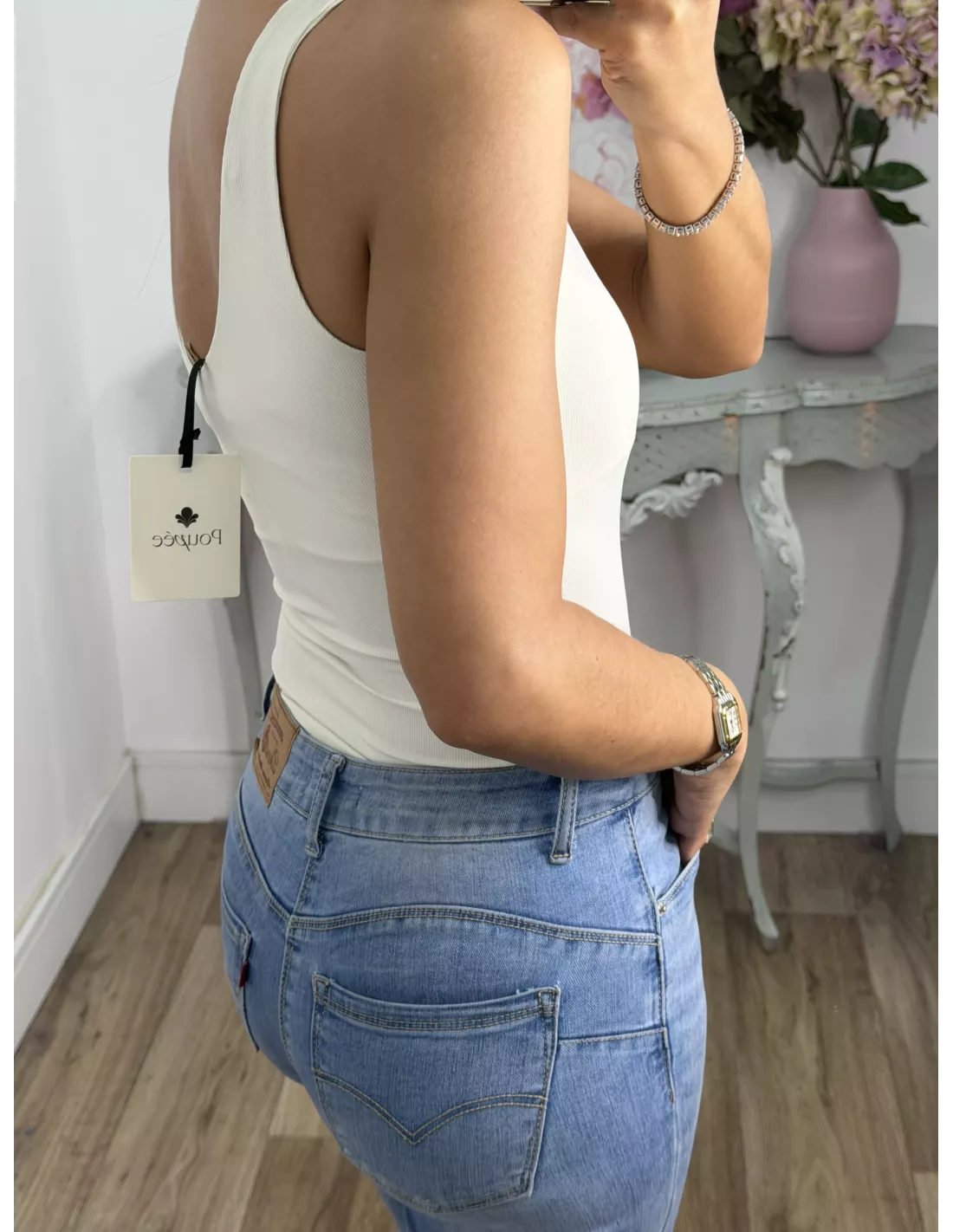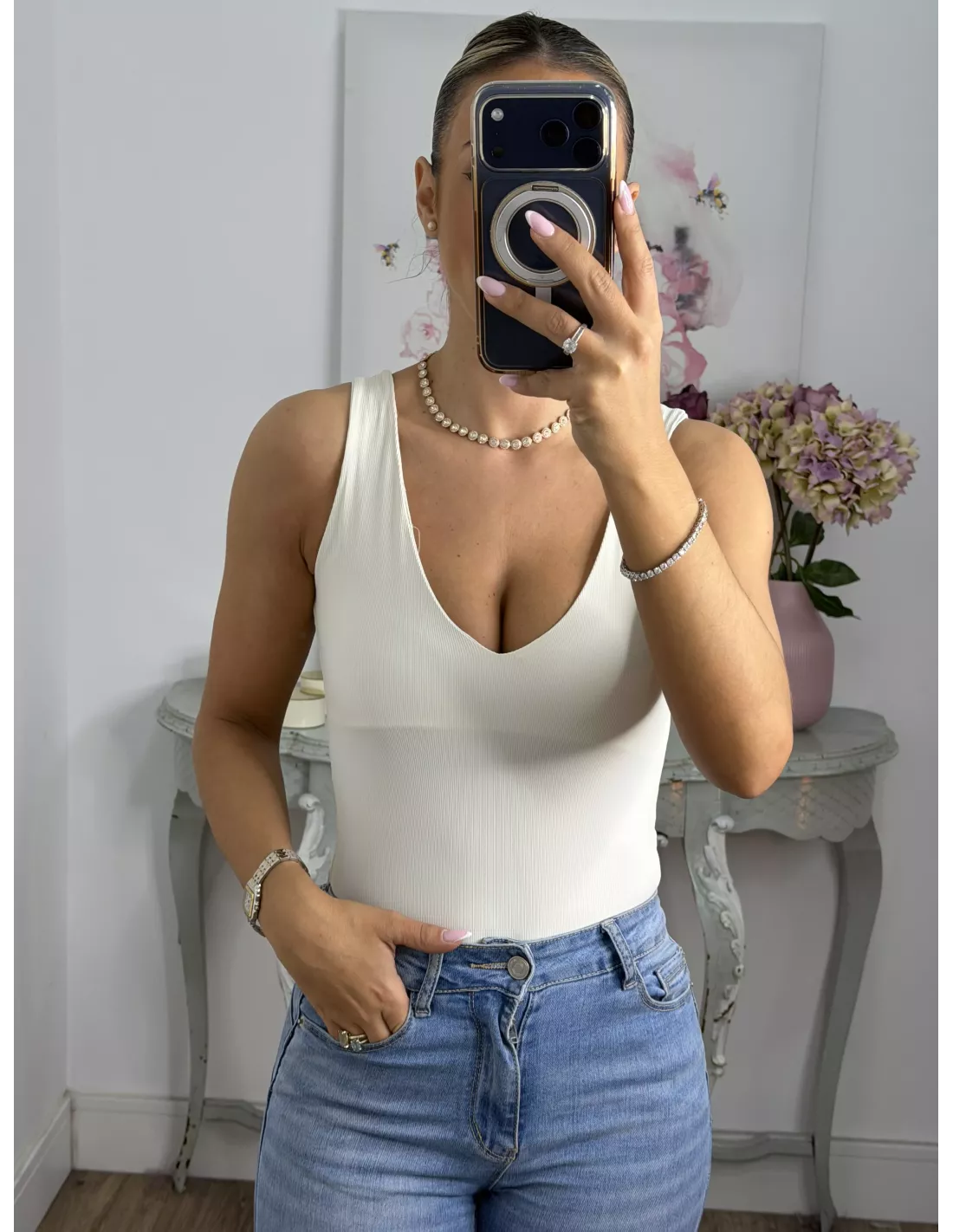 Body de licra de corte ajustado. Con escote en la parte delantera y en la parte de atrás. Es tipo tanga en la zona del culete y la parte de abajo se cierra con corchete igual que el de los sujetadores.