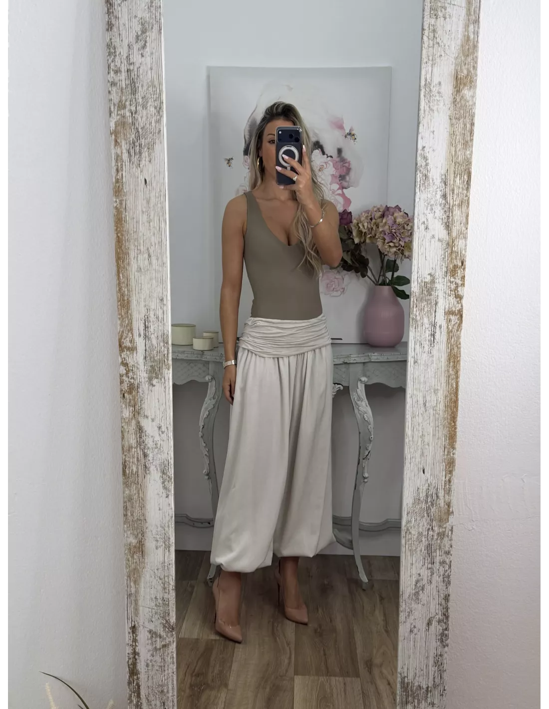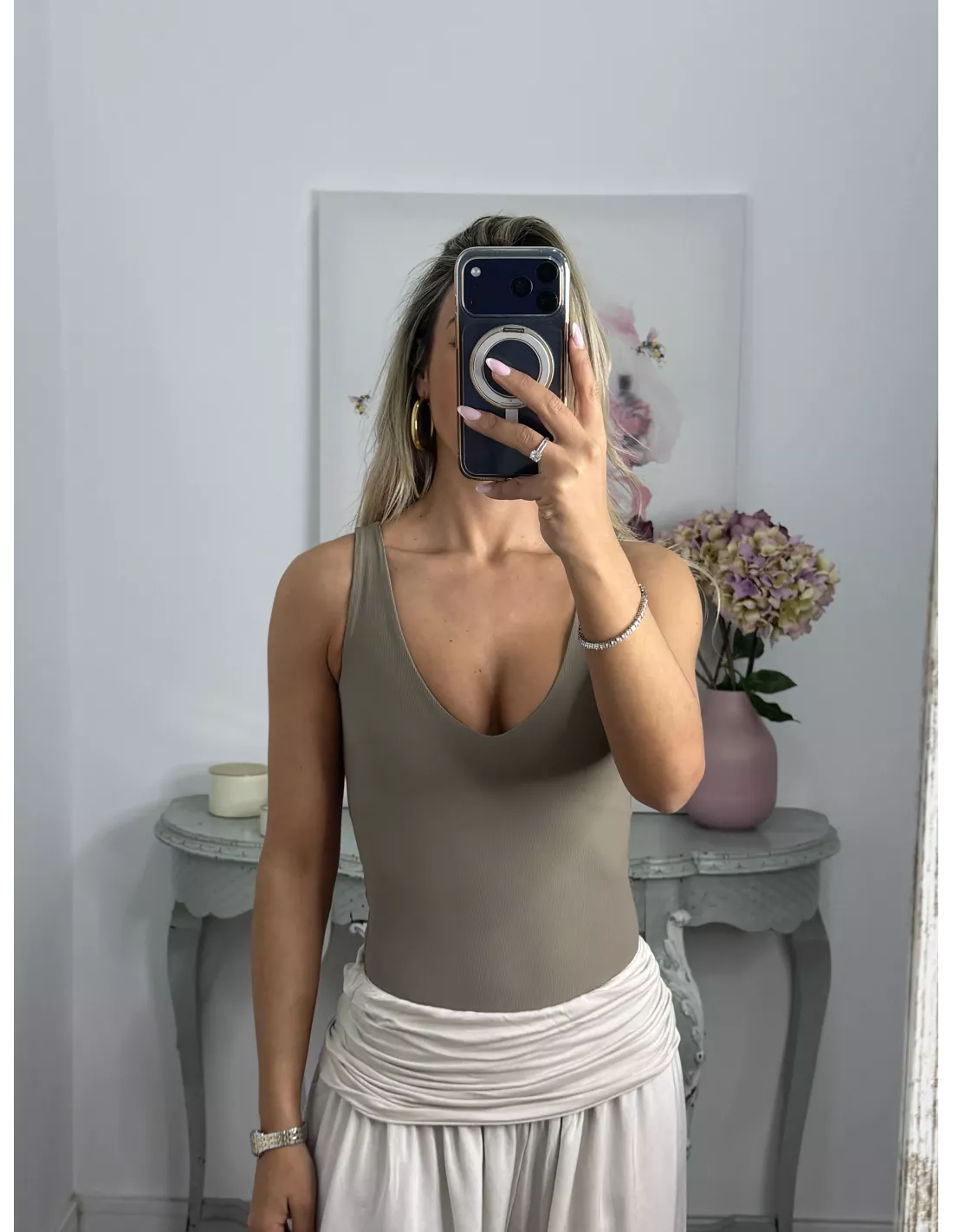 Body de licra de corte ajustado. Con escote en la parte delantera y en la parte de atrás. Es tipo tanga en la zona del culete y la parte de abajo se cierra con corchete igual que el de los sujetadores.