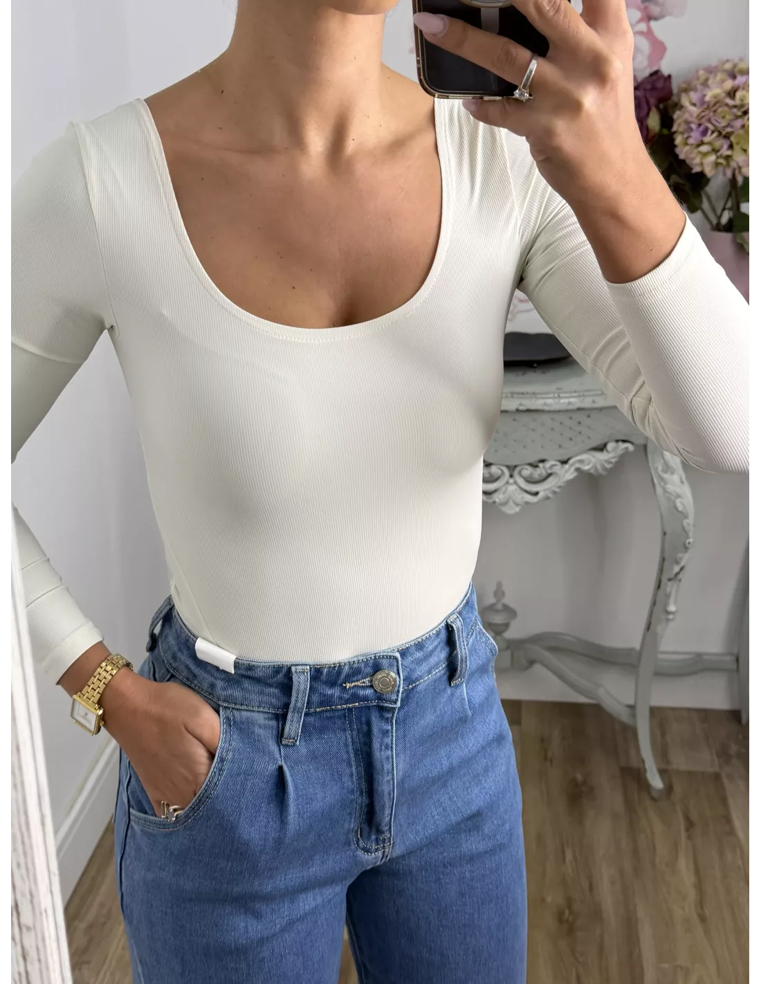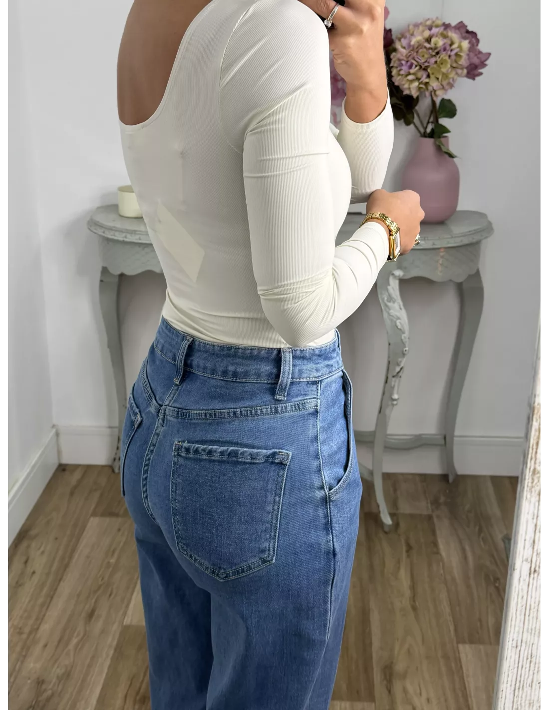 Body de licra de corte ajustado. Con escote cuadrado en la parte delantera y en la parte de atrás. Es tipo tanga en la zona del culete y la parte de abajo se cierra con corchete igual que el de los sujetadores.