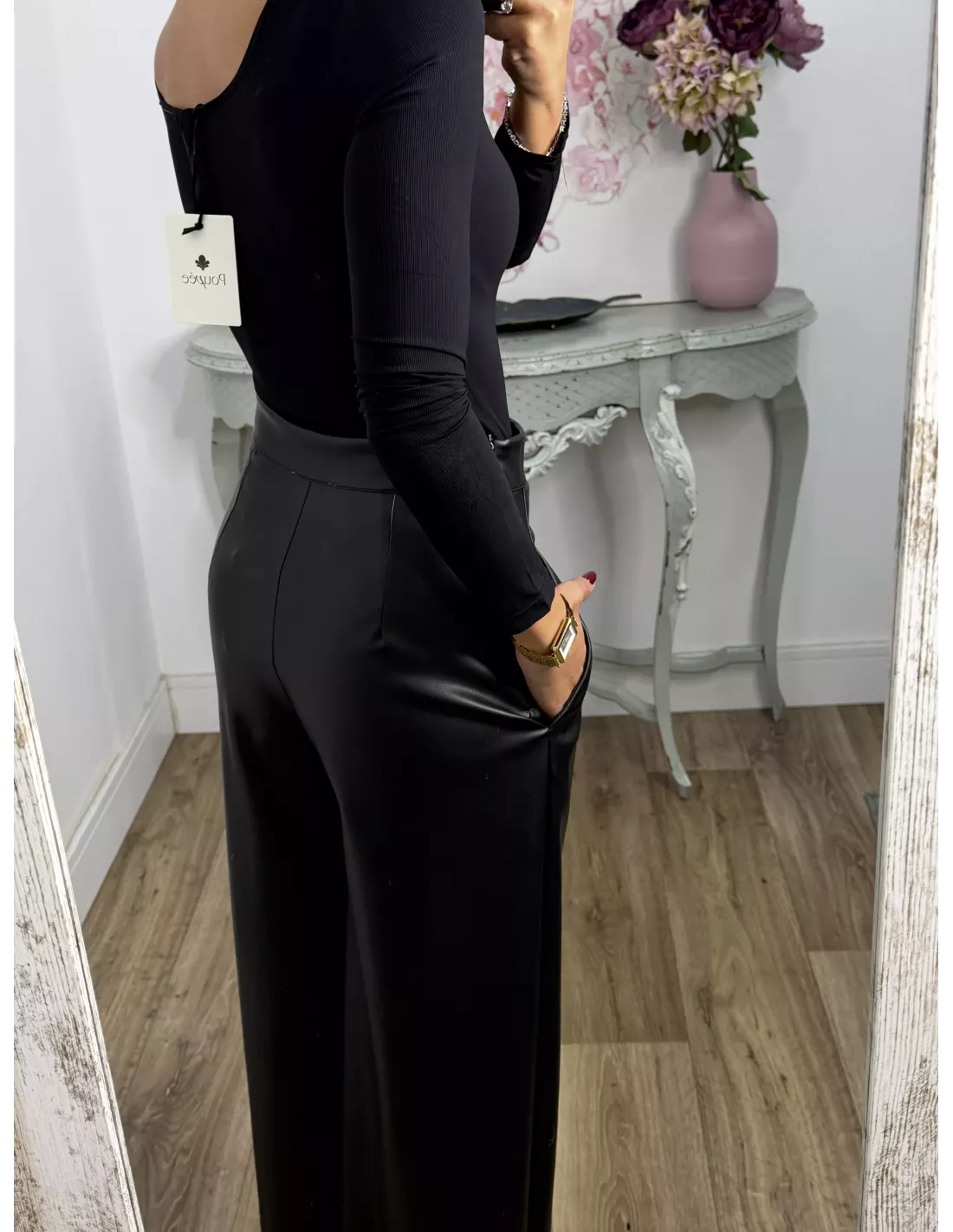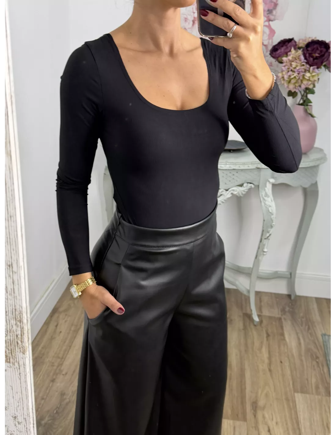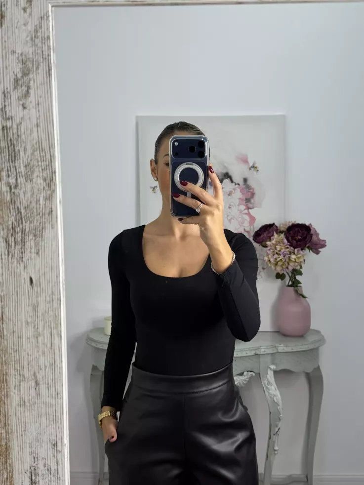 Body de licra de corte ajustado. Con escote cuadrado en la parte delantera y en la parte de atrás. Es tipo tanga en la zona del culete y la parte de abajo se cierra con corchete igual que el de los sujetadores.