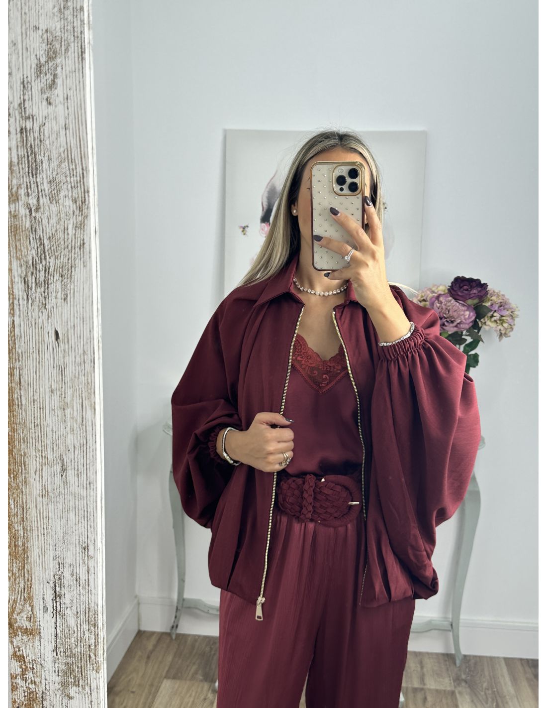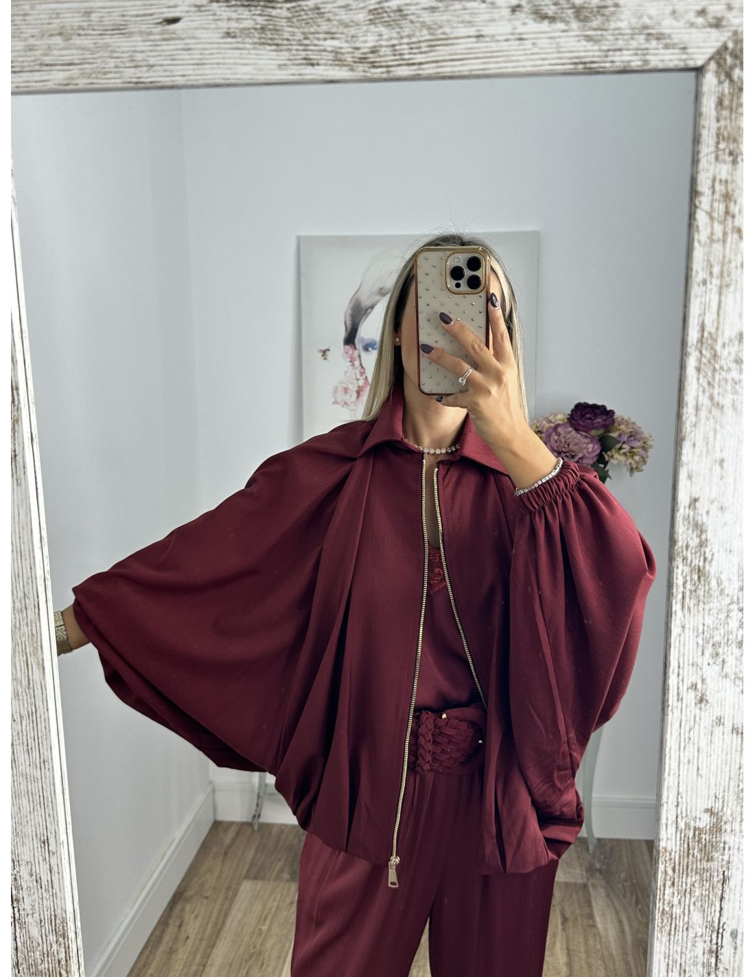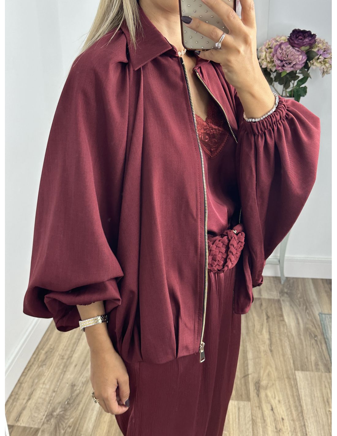 Bomber, que se cierra con cremallera dorada de manga murciélago que lleva un puño y queda abullonada.