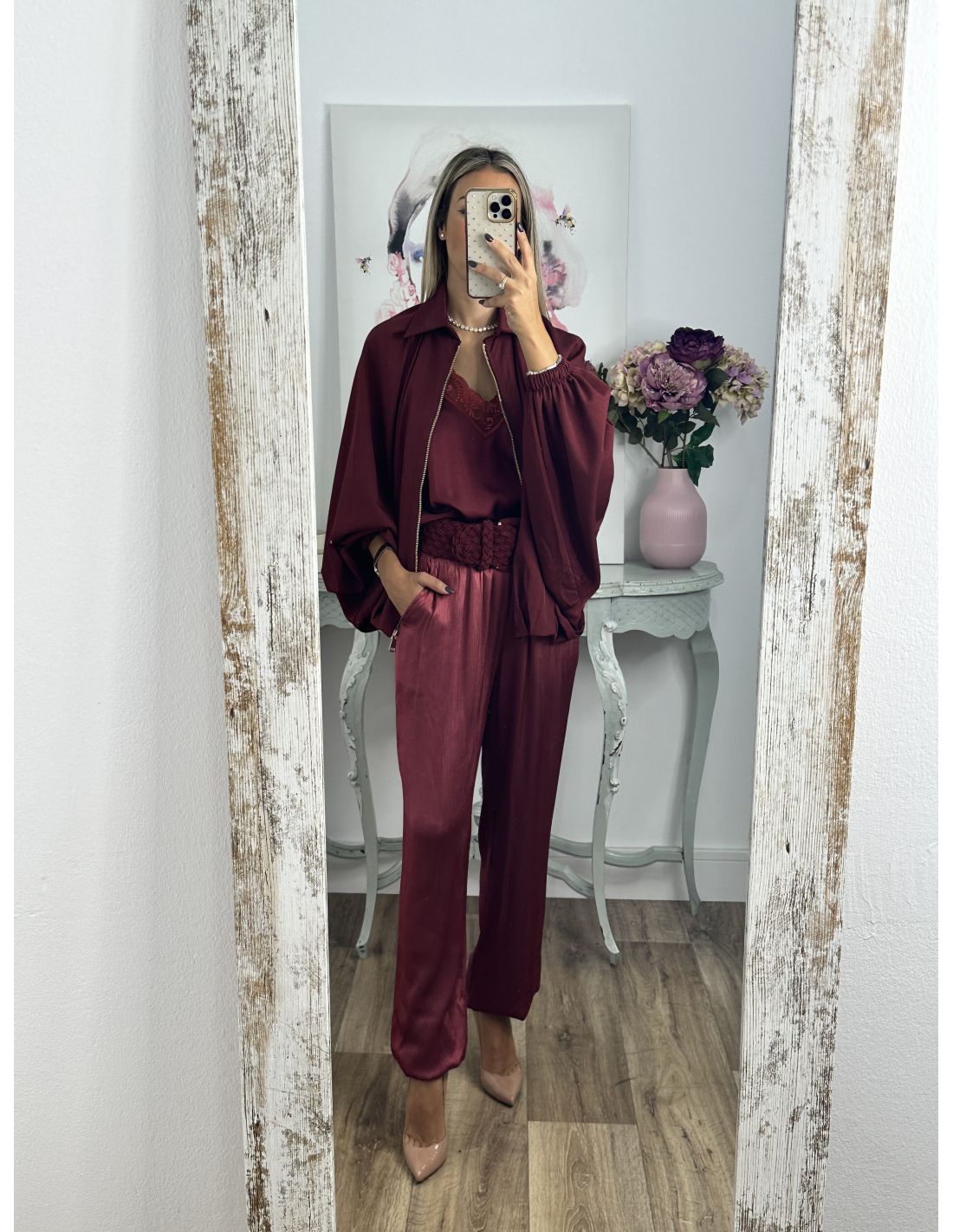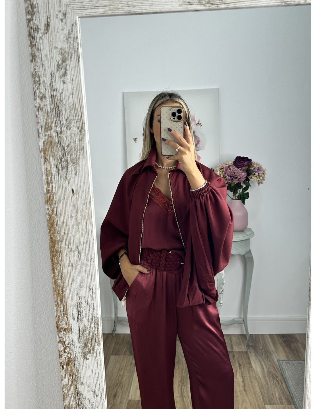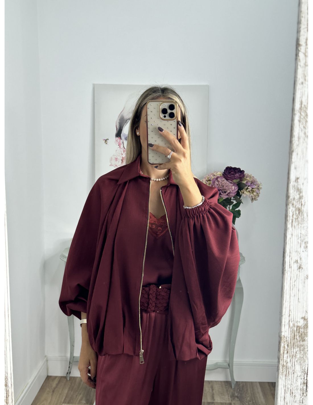 Bomber, que se cierra con cremallera dorada de manga murciélago que lleva un puño y queda abullonada.
