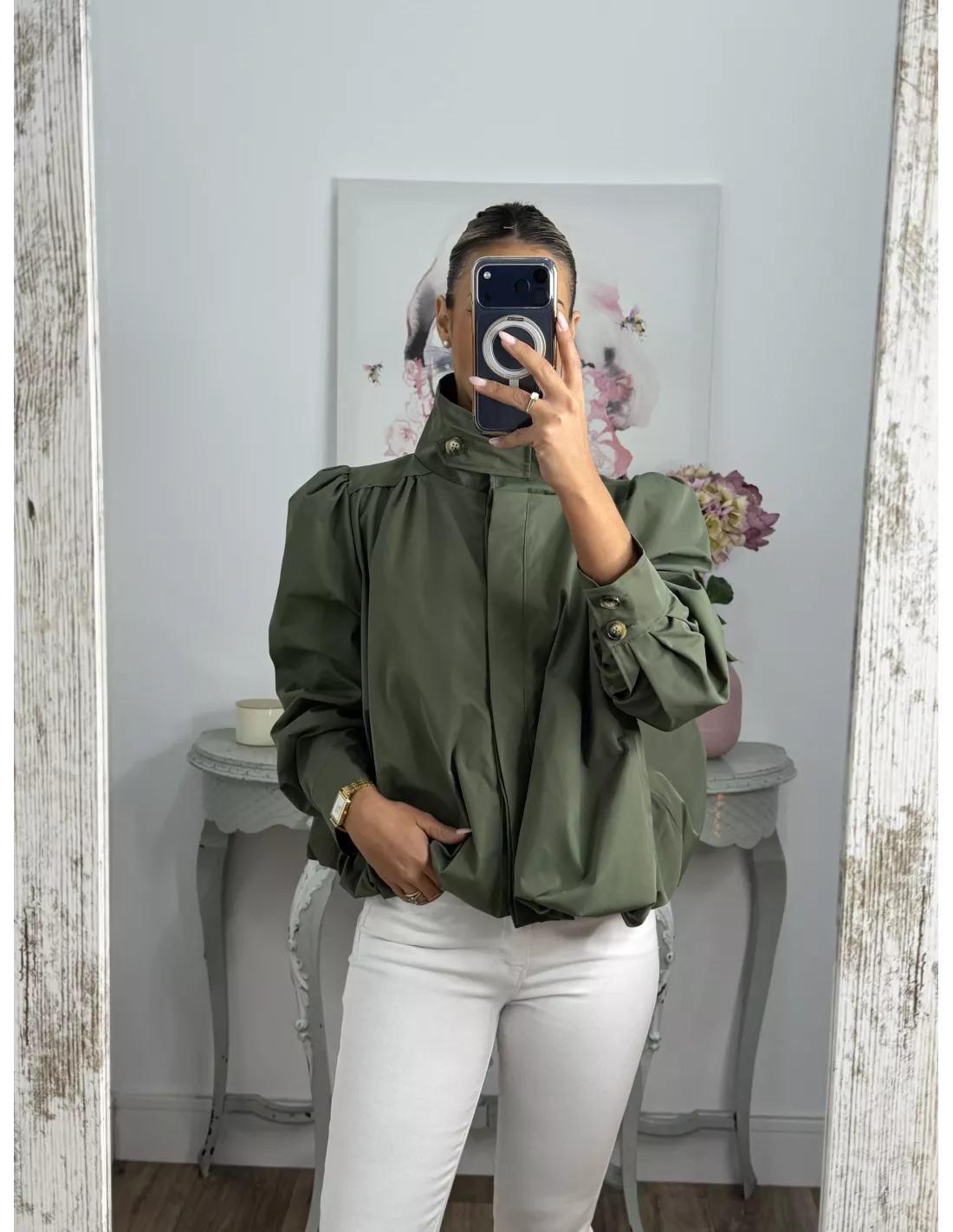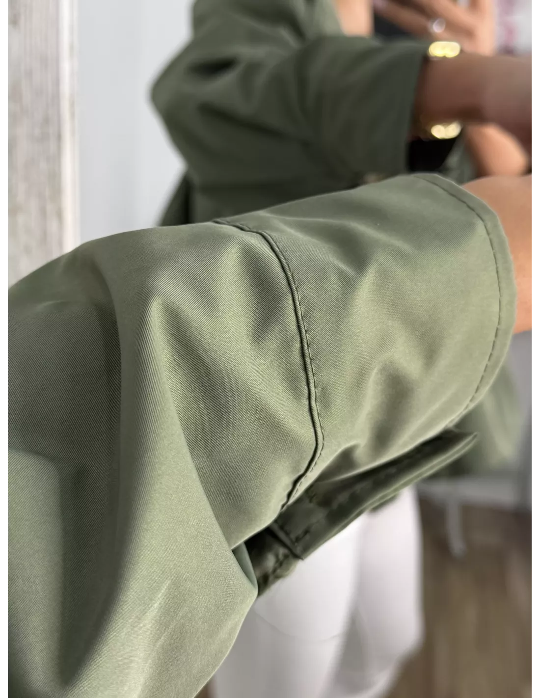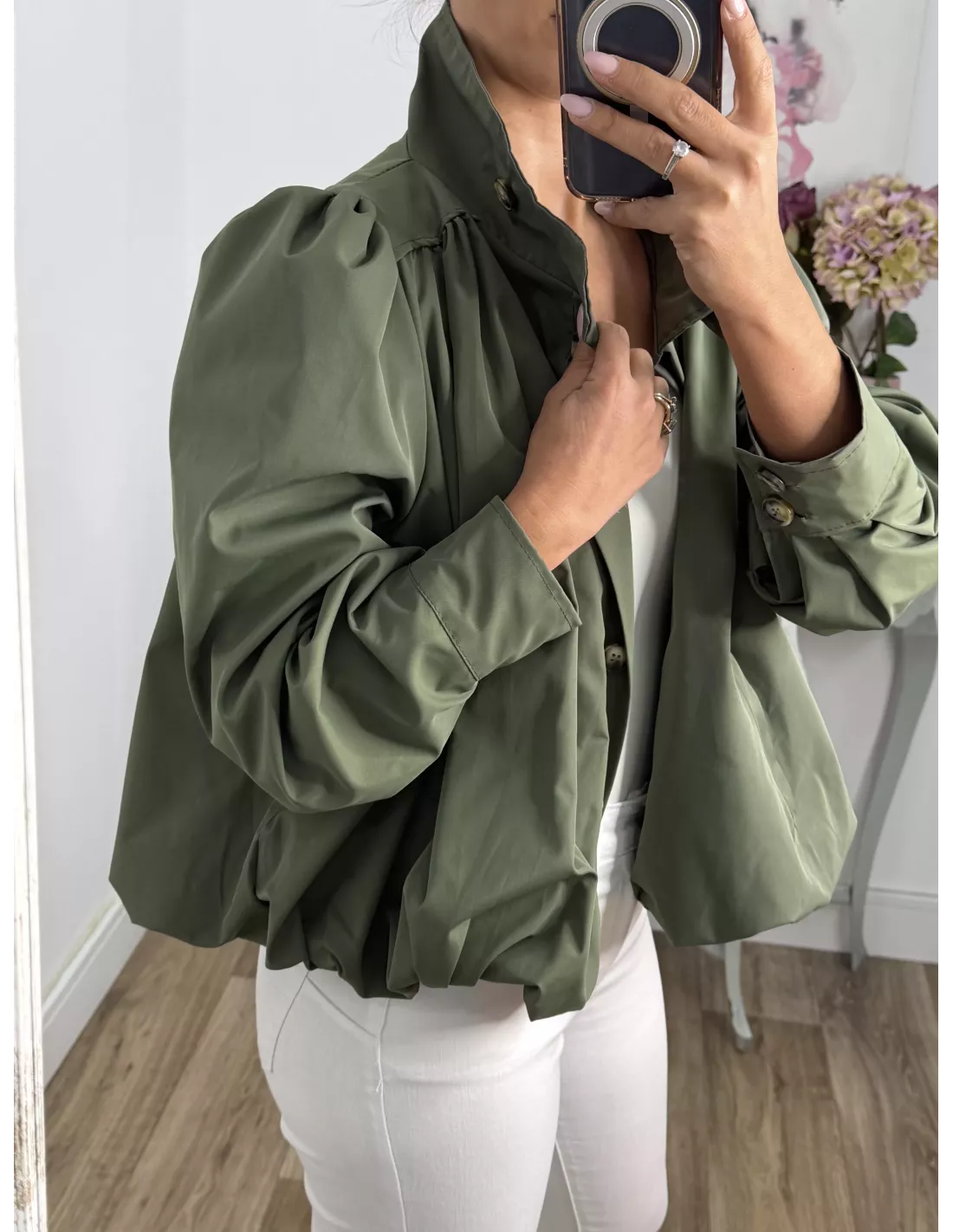Bomber tipo globo con cuello, chimenea y manga farol. Va forrada tiene bolsillos. Se cierra con botones que van tapados con una tapeta.