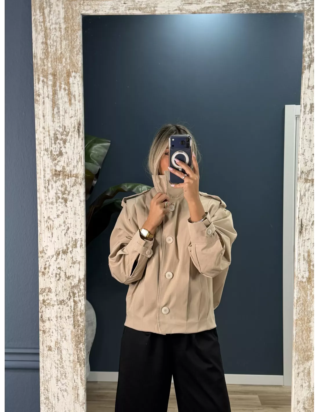 Bomber tipo globo con cuello, chimenea y manga farol. Va forrada tiene bolsillos. Se cierra con botones que van tapados con una tapeta.
