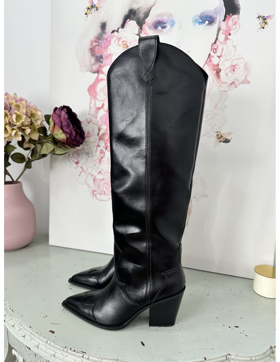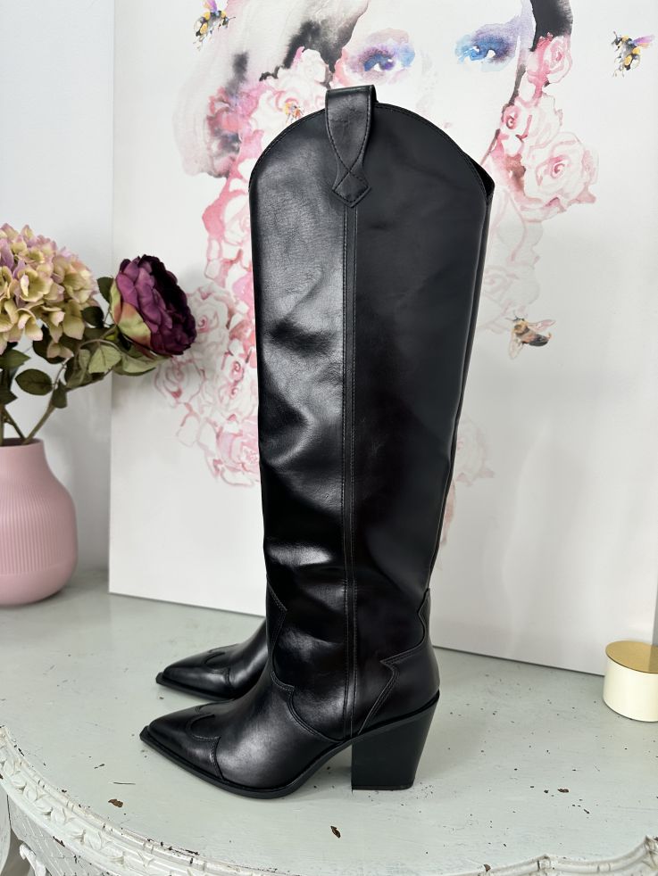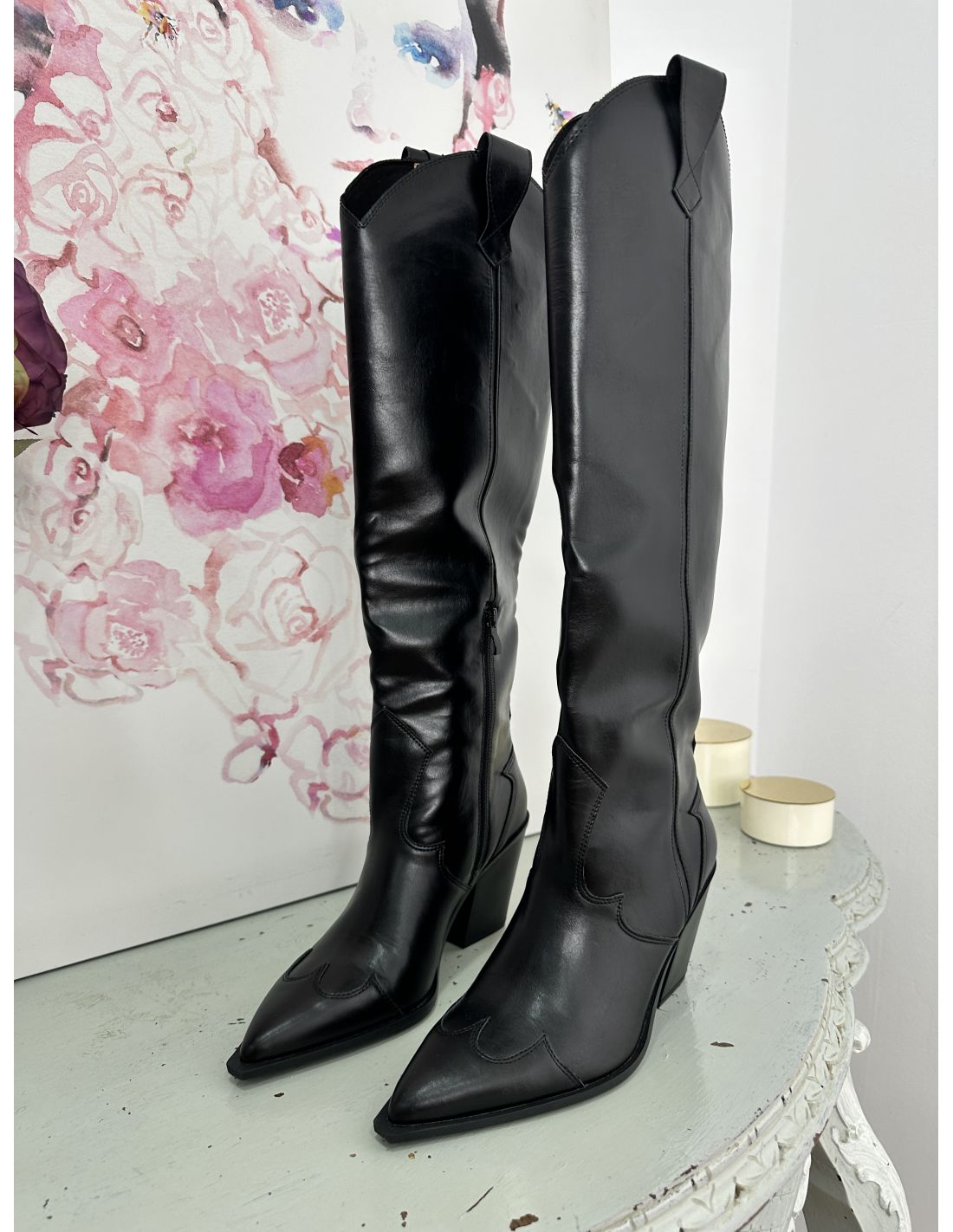 Bota tipo cowboy, de efecto piel de melocotón. El tacón es muy cómodo. Número habitual