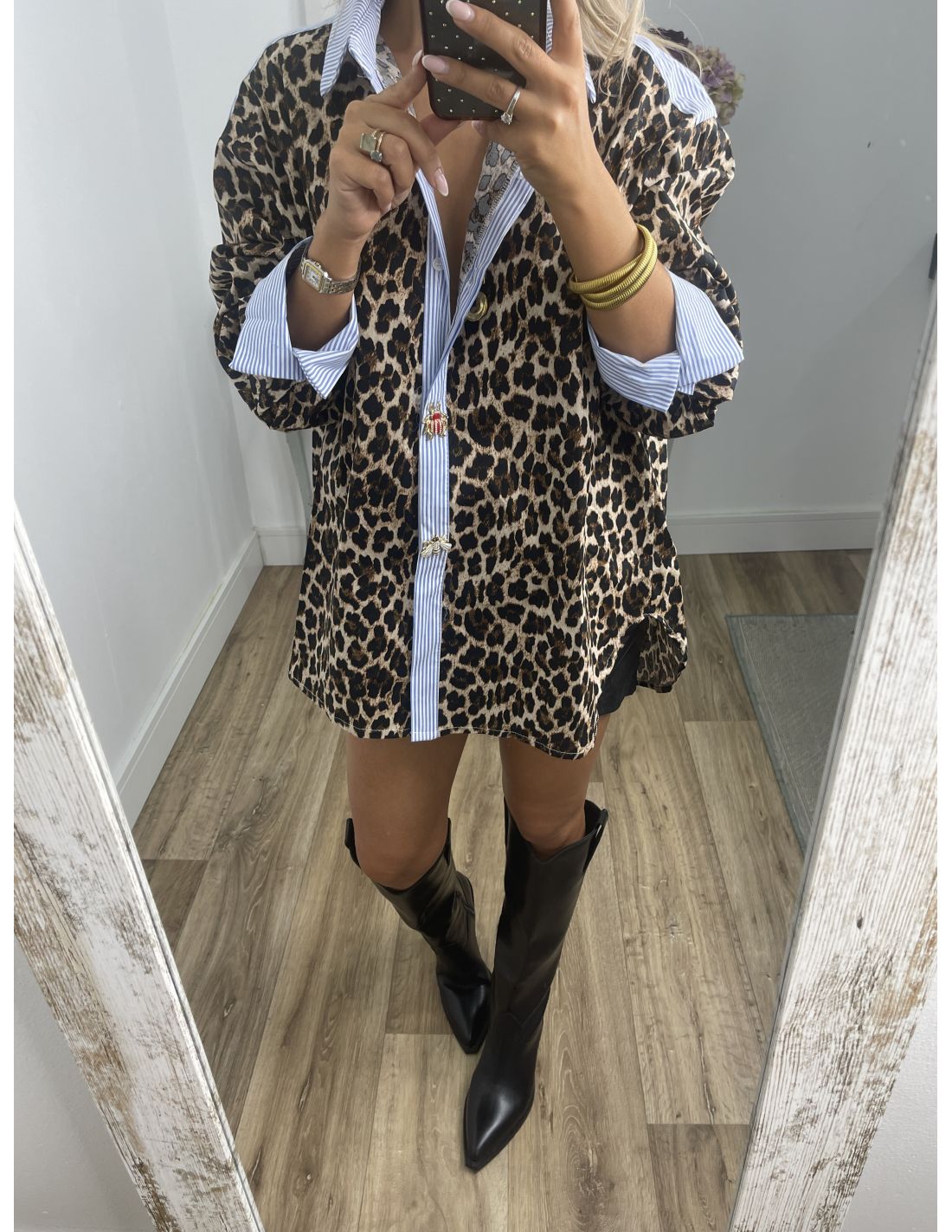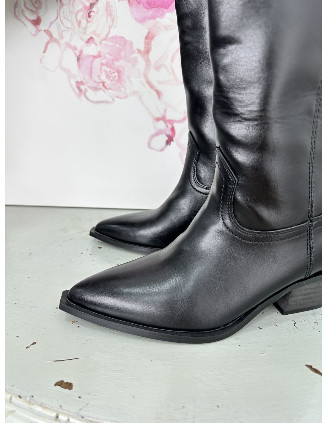 Bota tipo cowboy, de efecto piel de melocotón. El tacón es muy cómodo. Recomendamos la talla habitual.