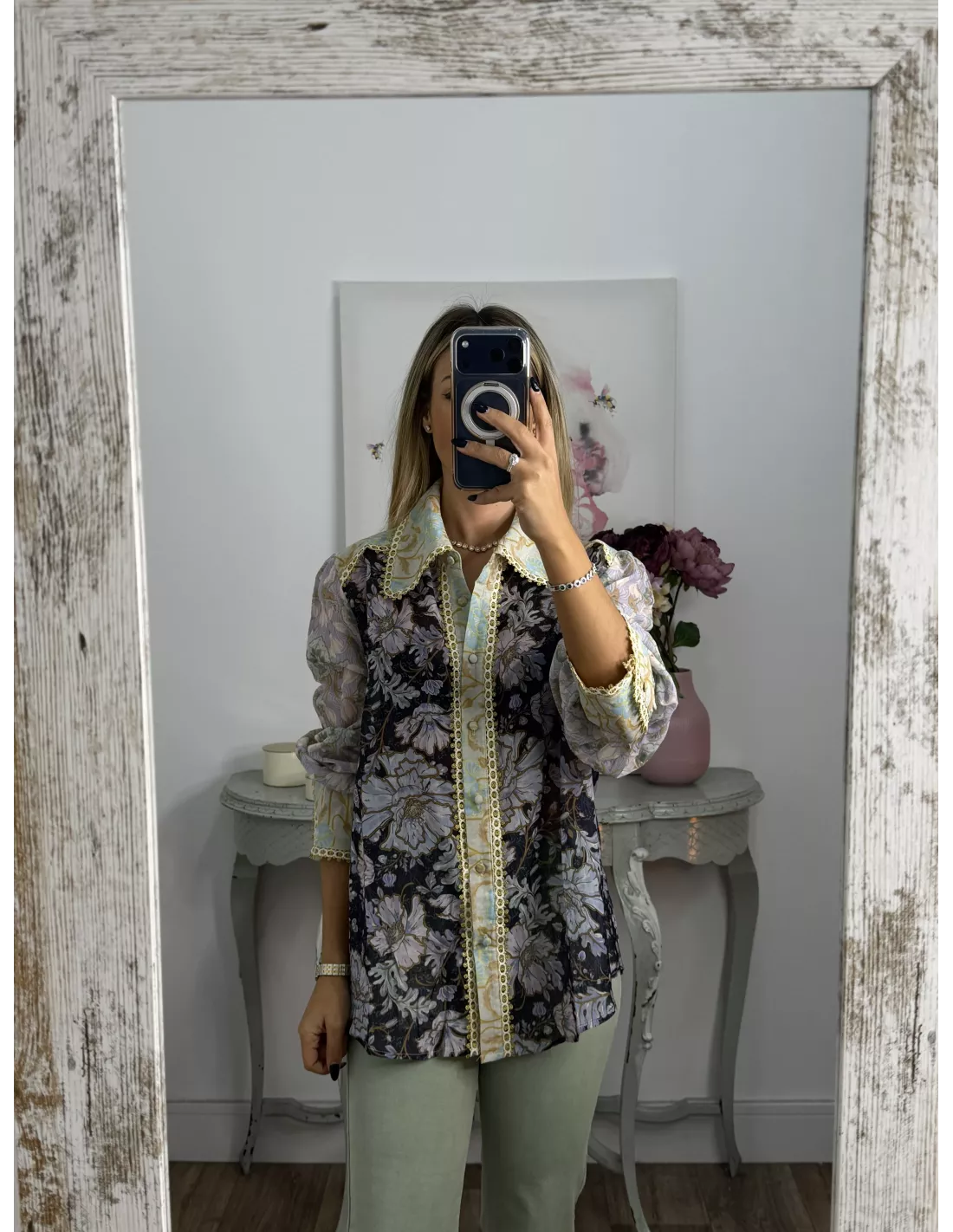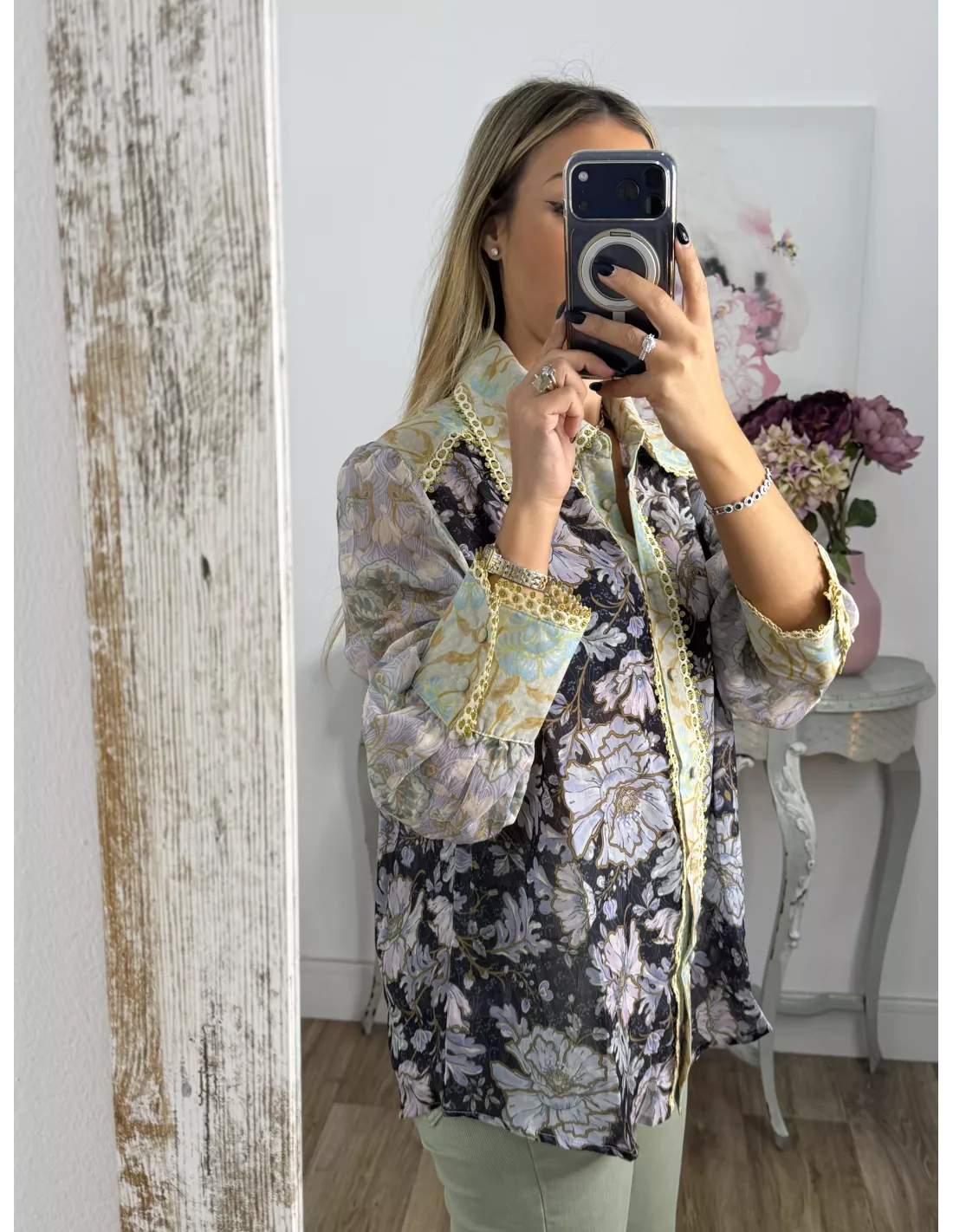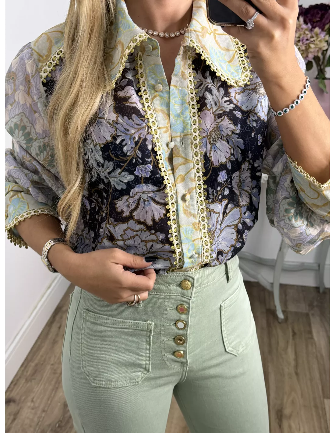 Camisa estampada de cuello grande. El puño es ancho con dos botones. El corte es recto y se recomienda la talla habitual. Lleva una pasamaneria dorada.