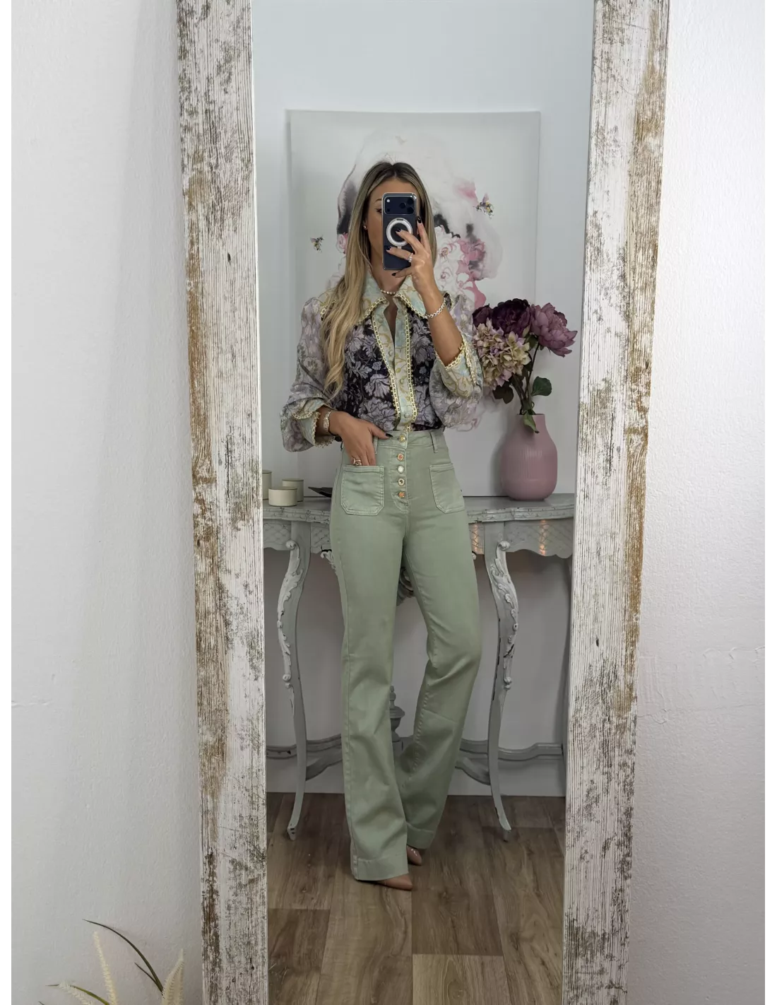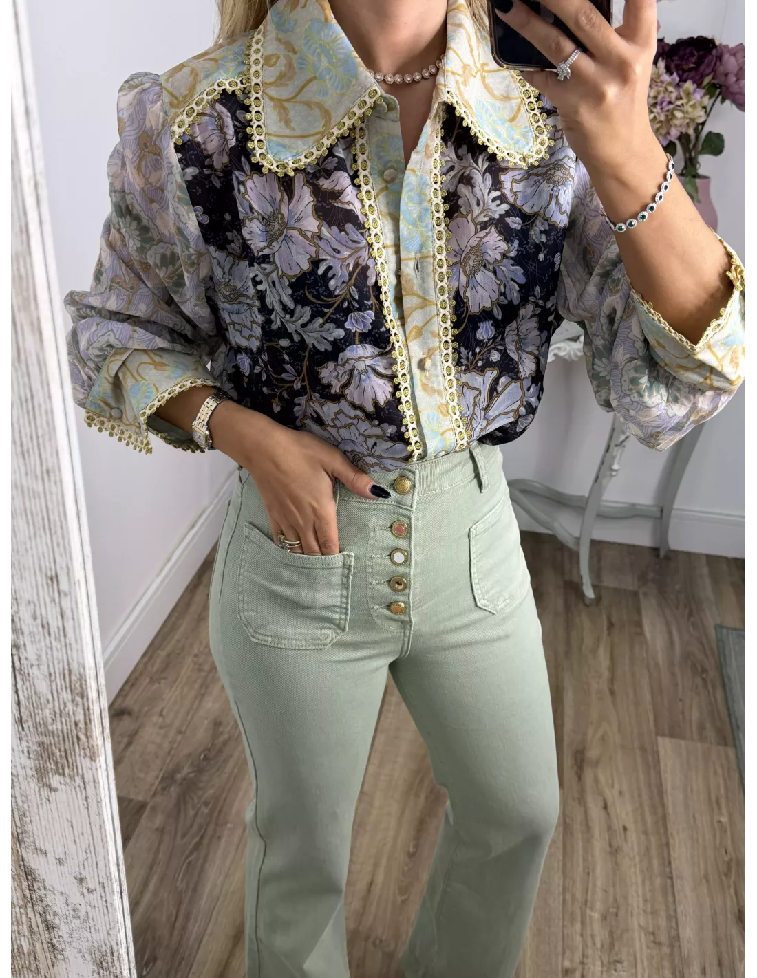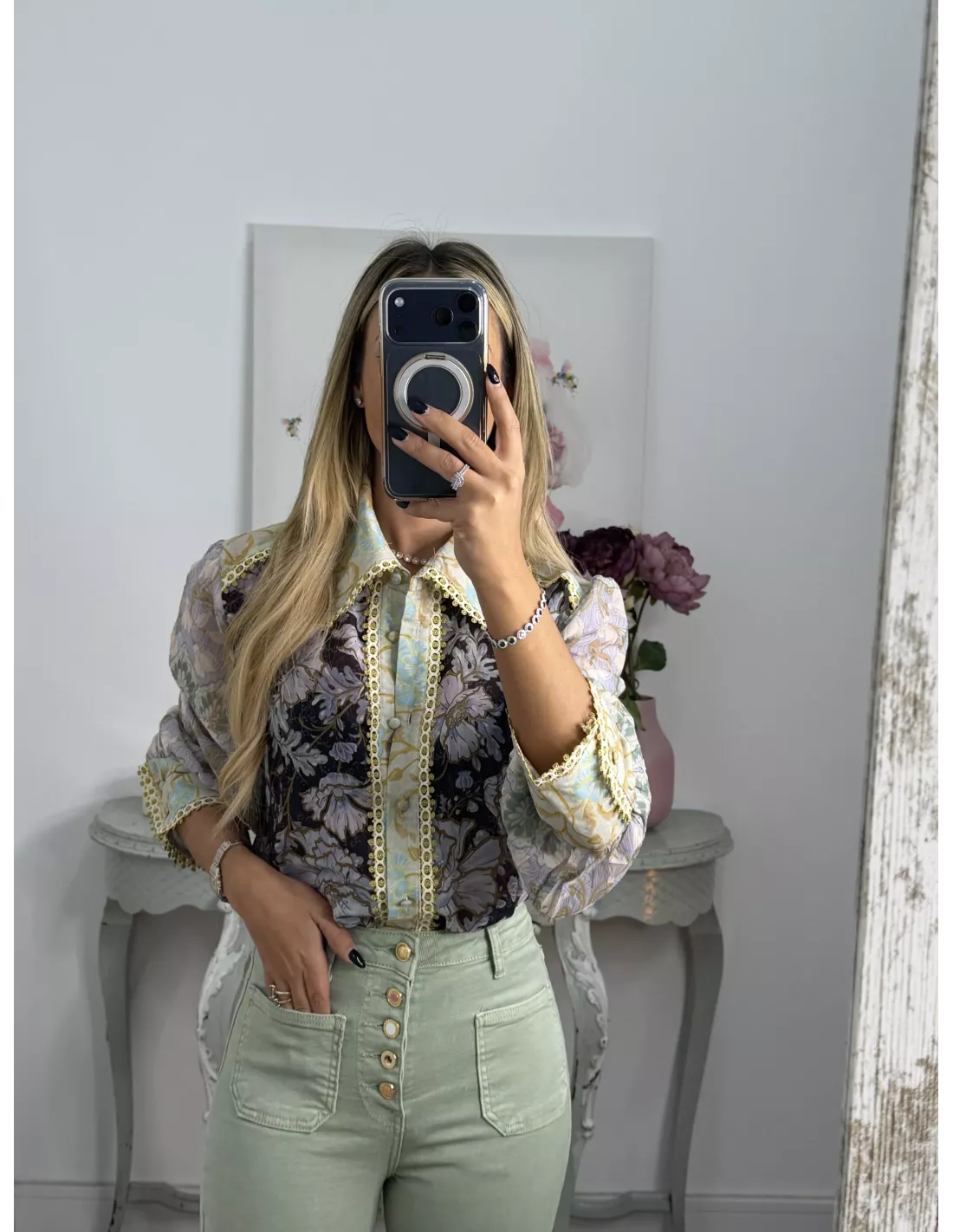 Camisa estampada de cuello grande. El puño es ancho con dos botones. El corte es recto y se recomienda la talla habitual. Lleva una pasamaneria dorada.