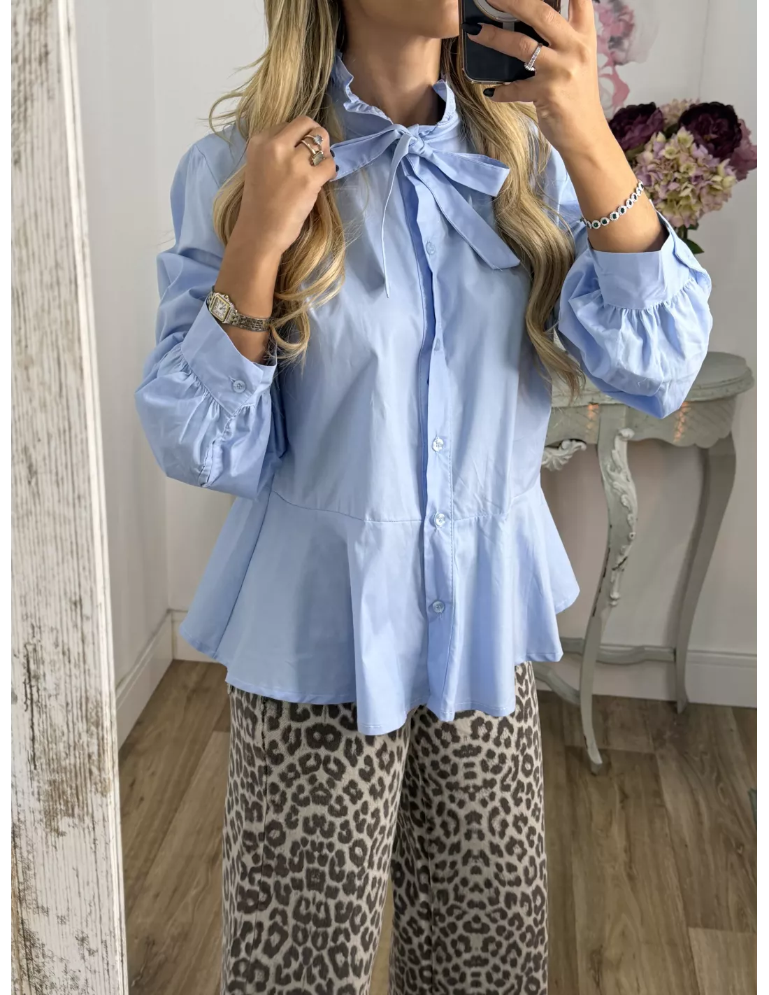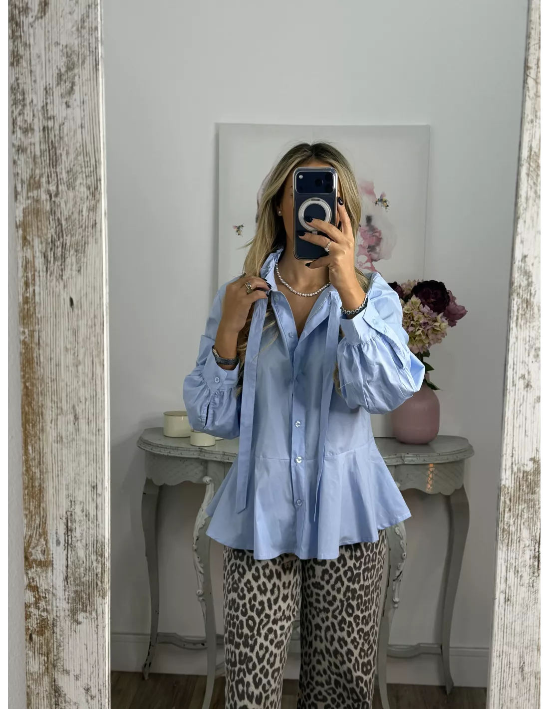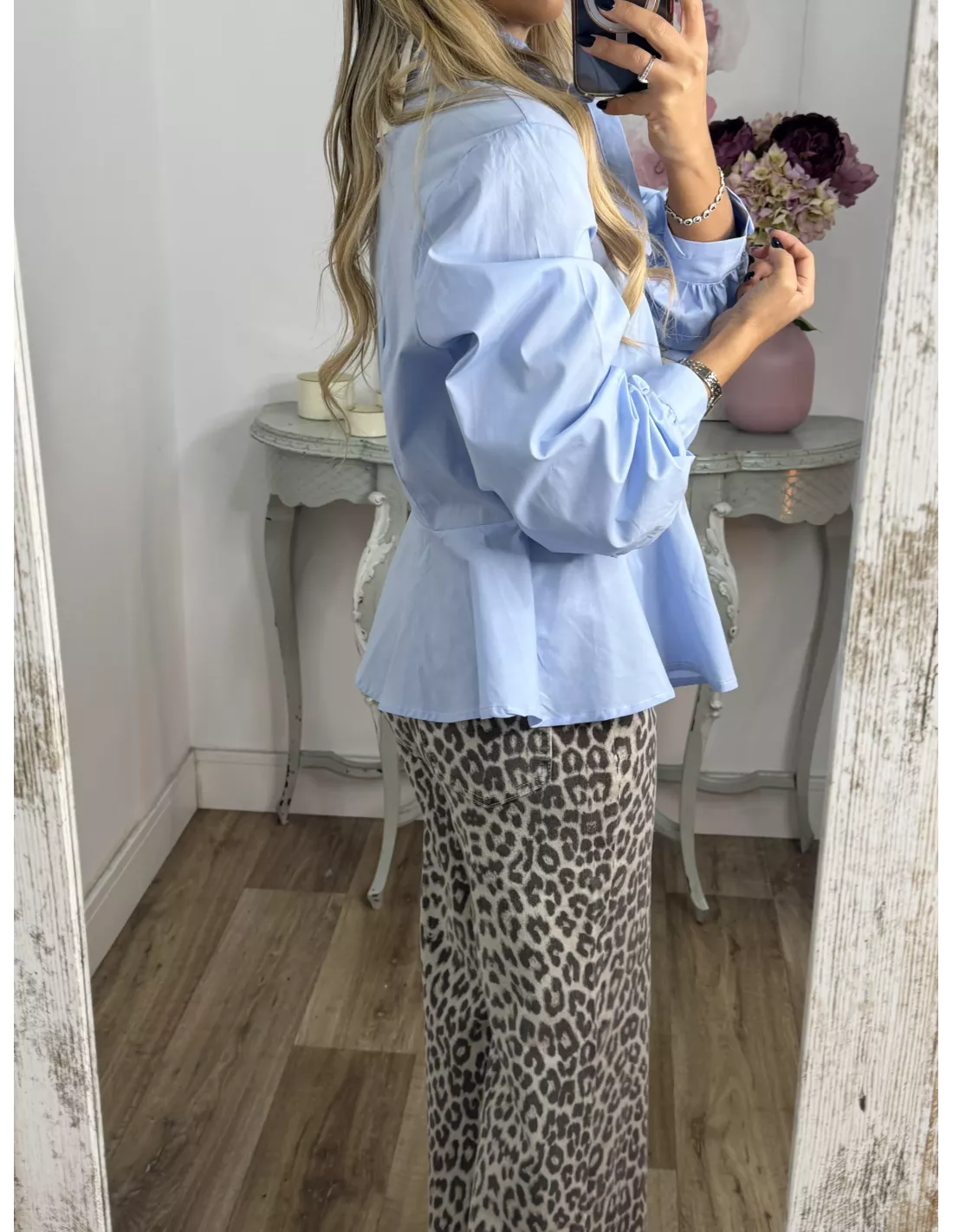 Camisa de corte suelto. En la zona del cuello lleva un volante es de corte peplum.