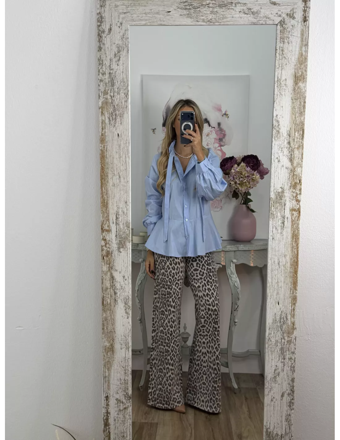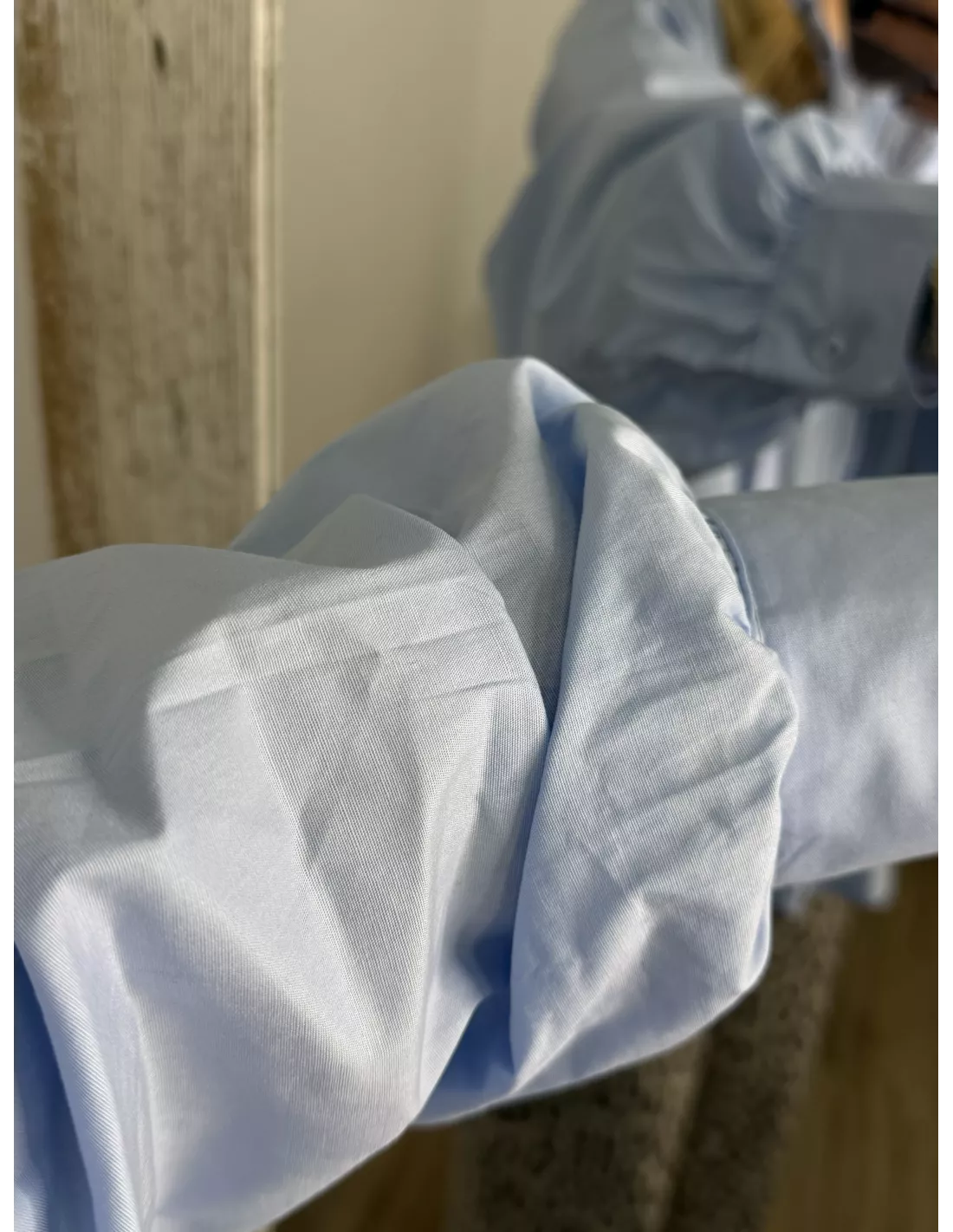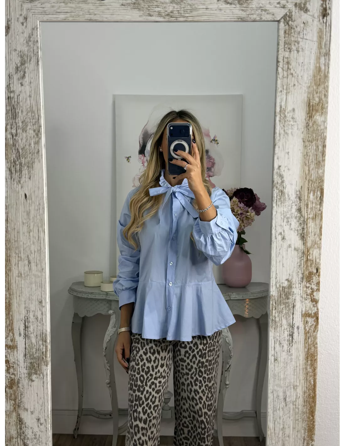 Camisa de corte suelto. En la zona del cuello lleva un volante es de corte peplum.