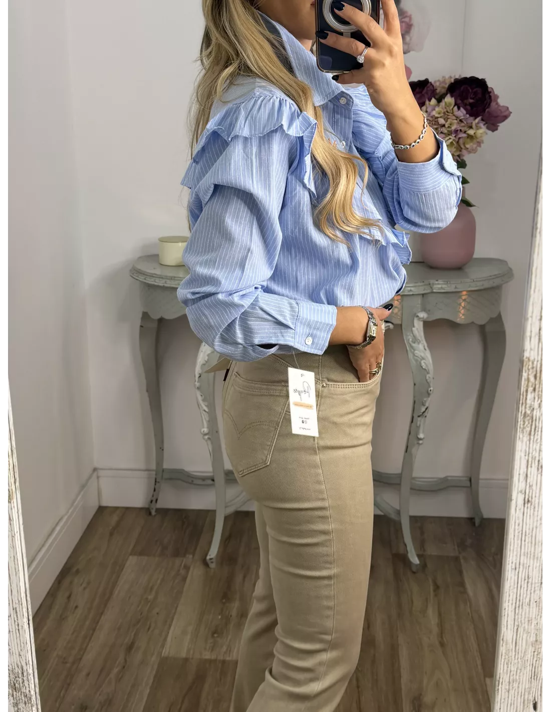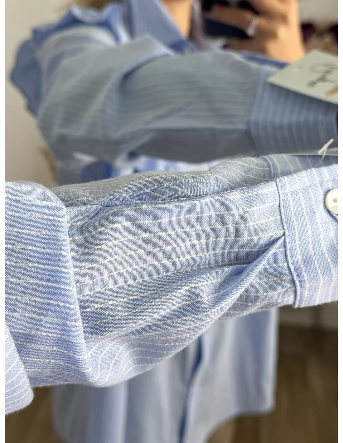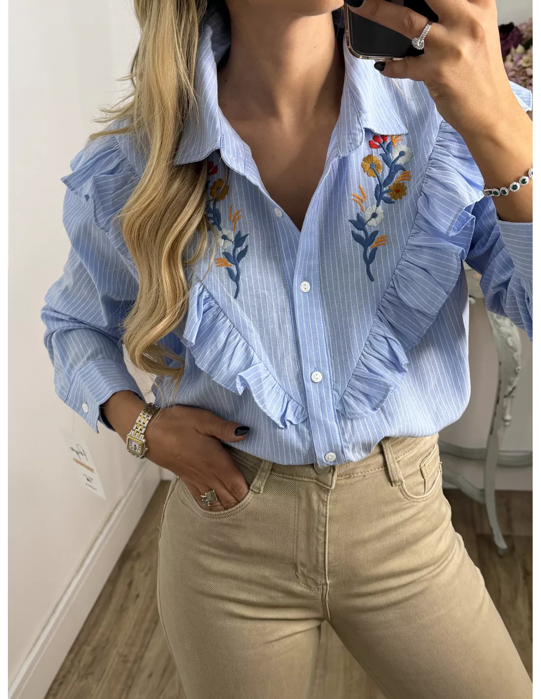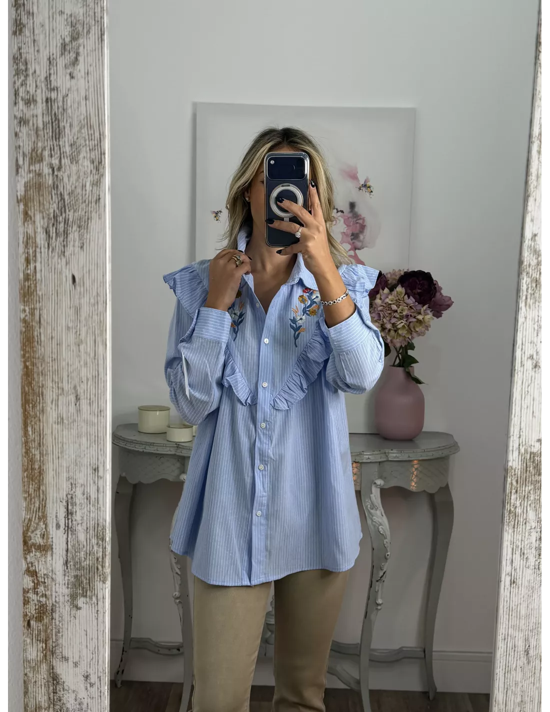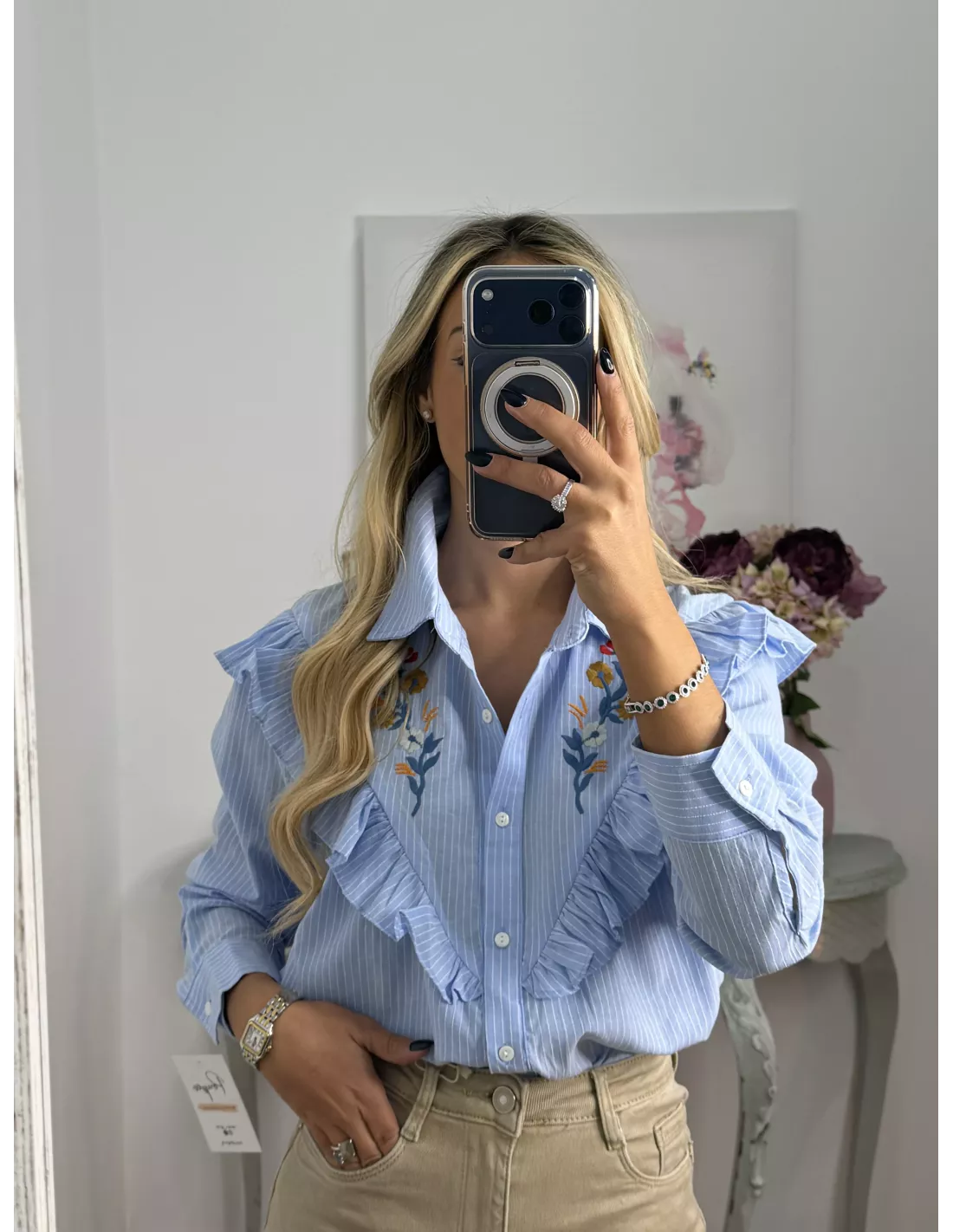 Camisa azul de rayas con bordado en la zona del pecho y un volante que va desde la parte delantera a la parte de atrás. El corte es amplio.