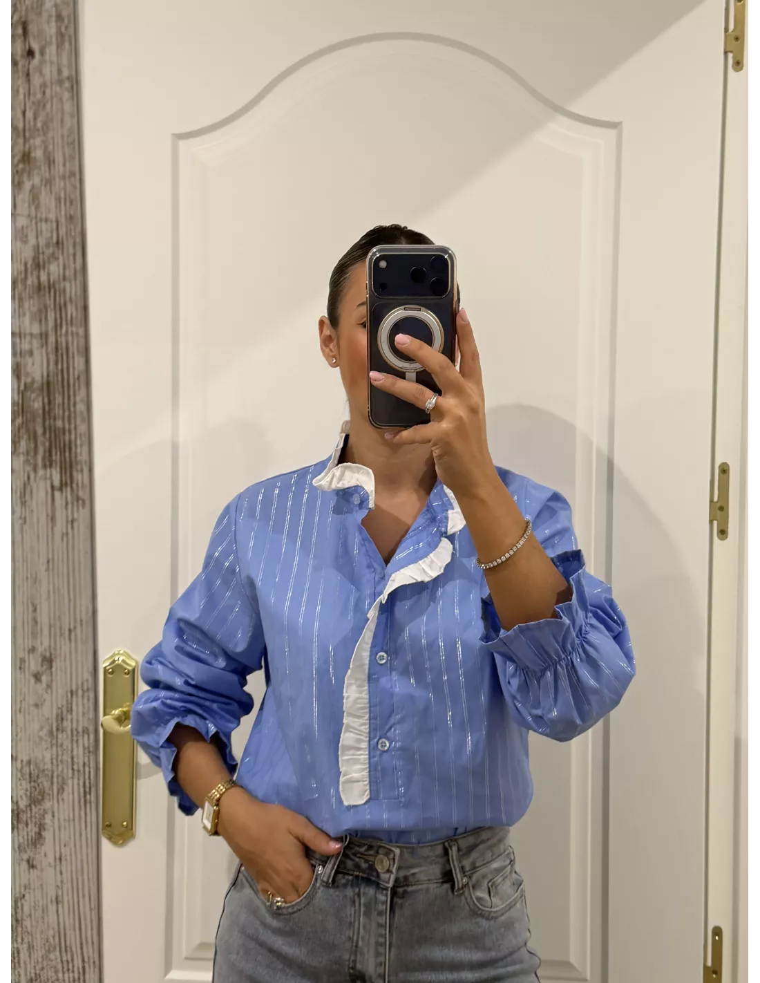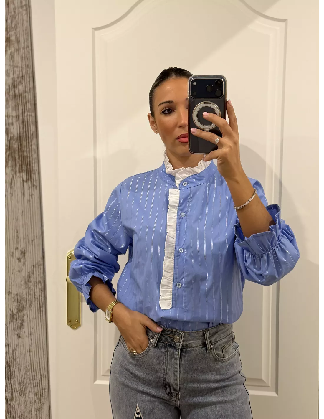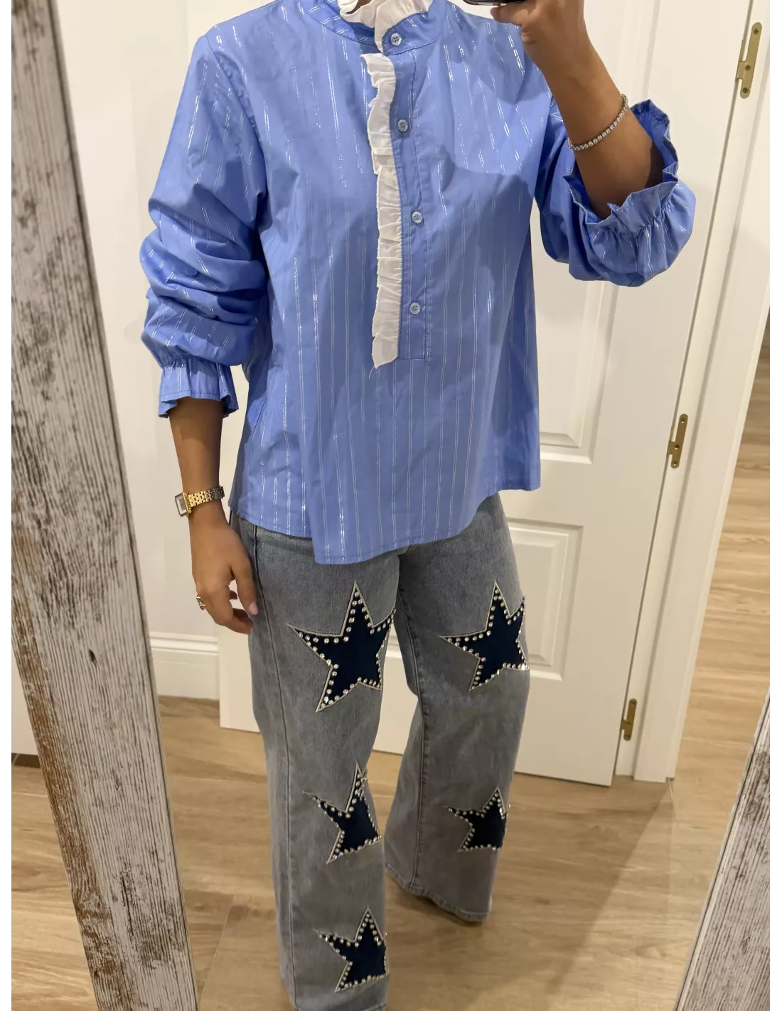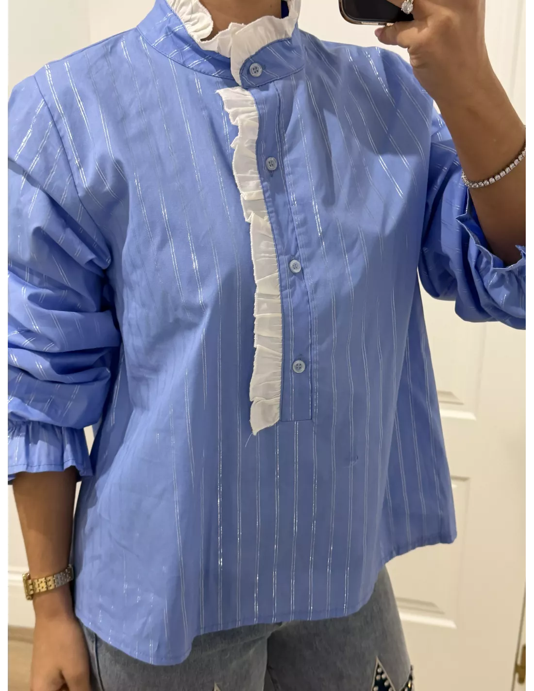 Camisa azul con cuello de tirilla que es un volante en blanco va abotonado un poquito la parte delantera, los botones no llegan hasta abajo. Es de corte recto y lleva una línea que lleva un brillo en plateado.