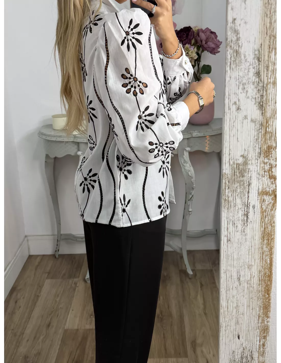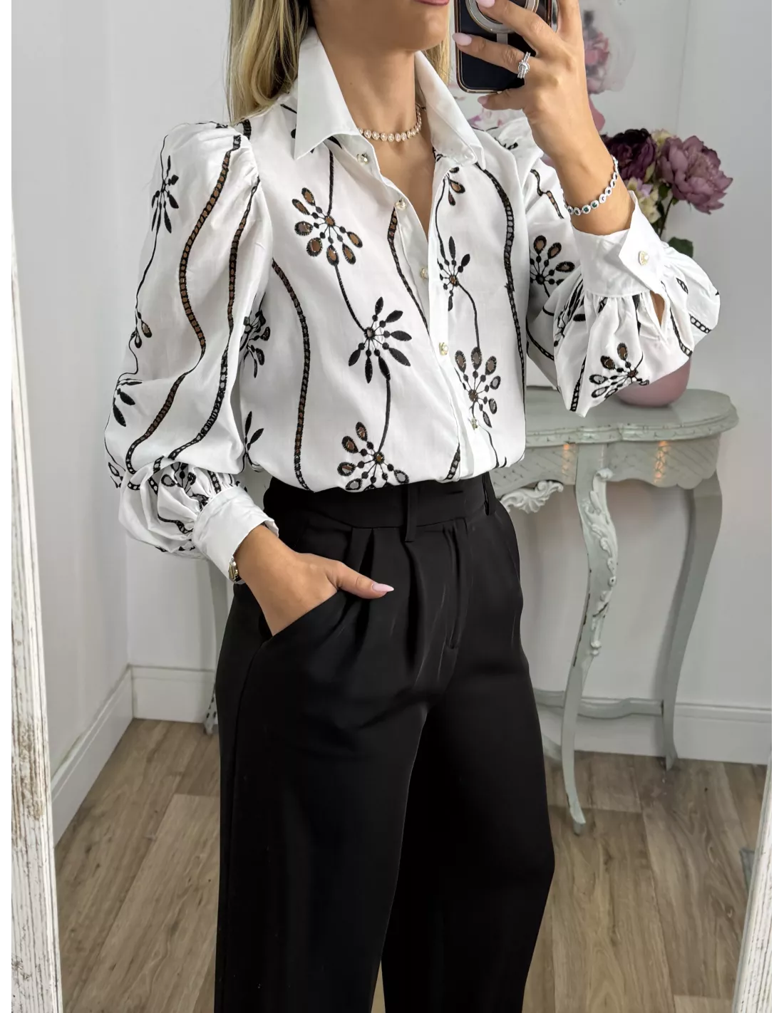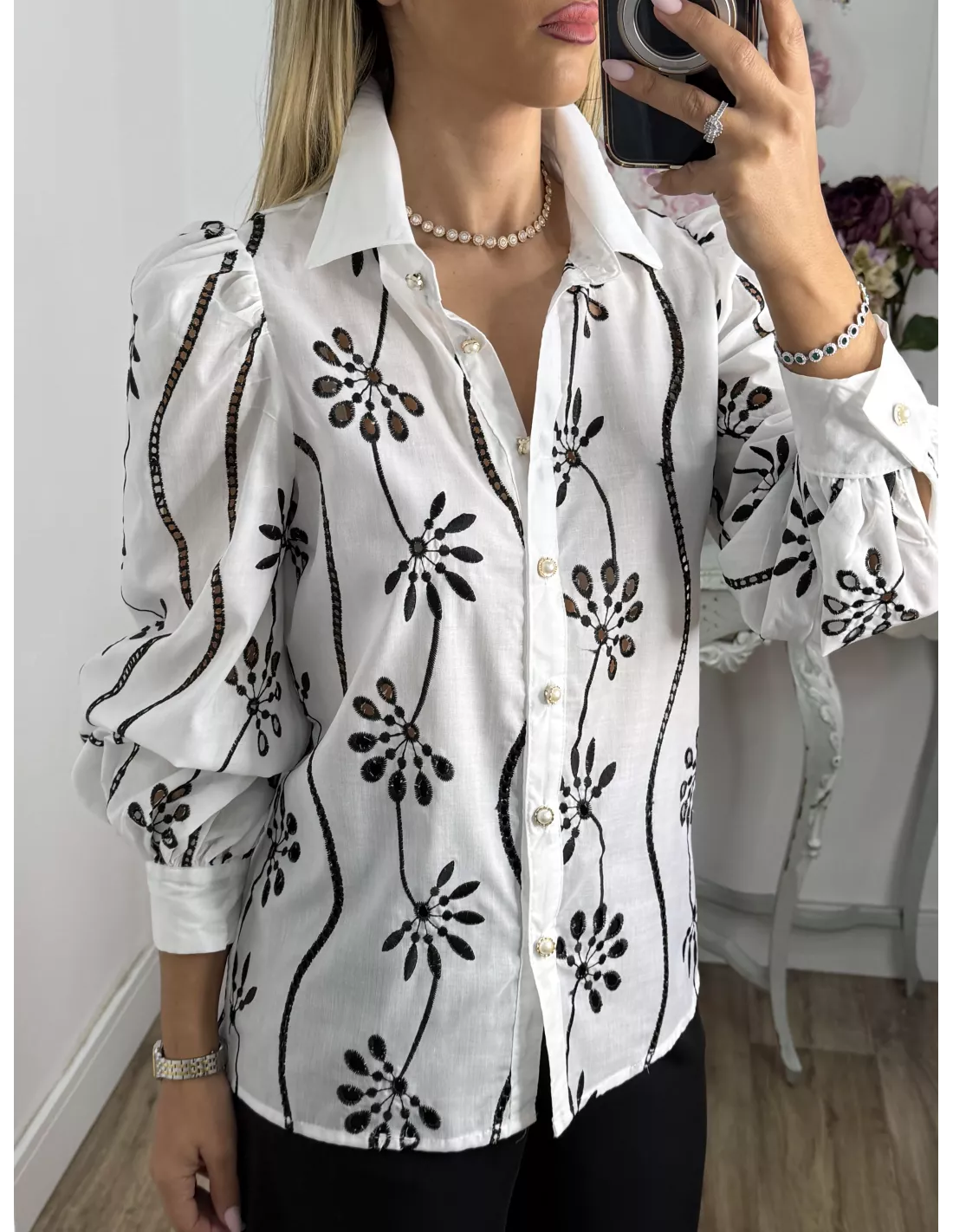 Camisa blanca con bordados negros. Es perforada. Tiene manga farol. El corte es recto y se recomienda la talla habitual. Lleva botones de perlas y dorado.