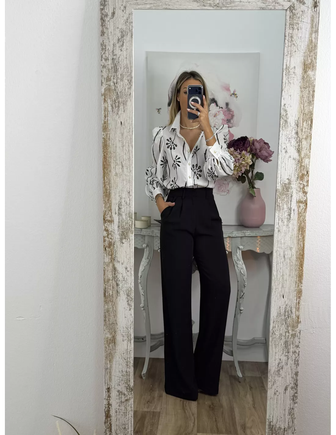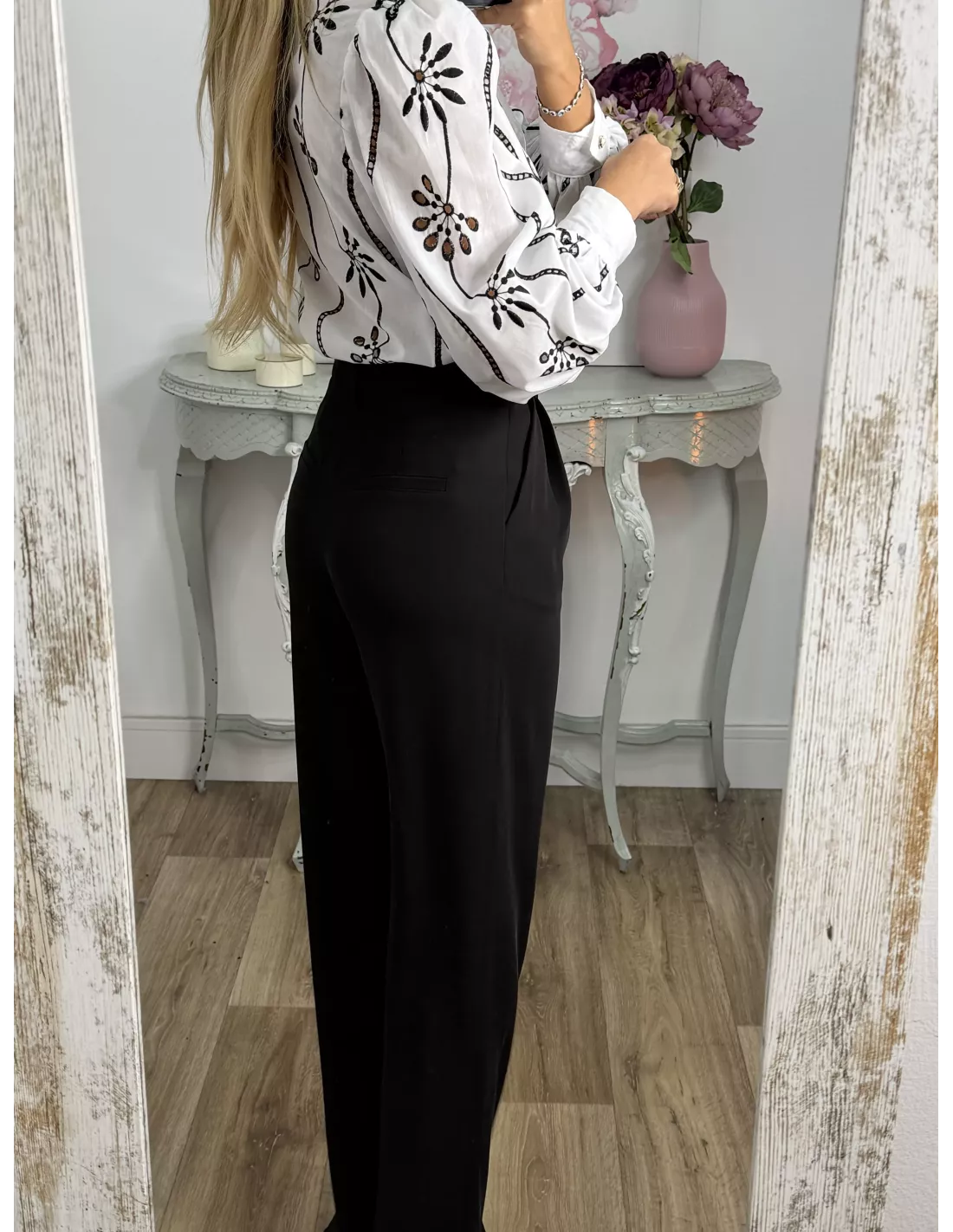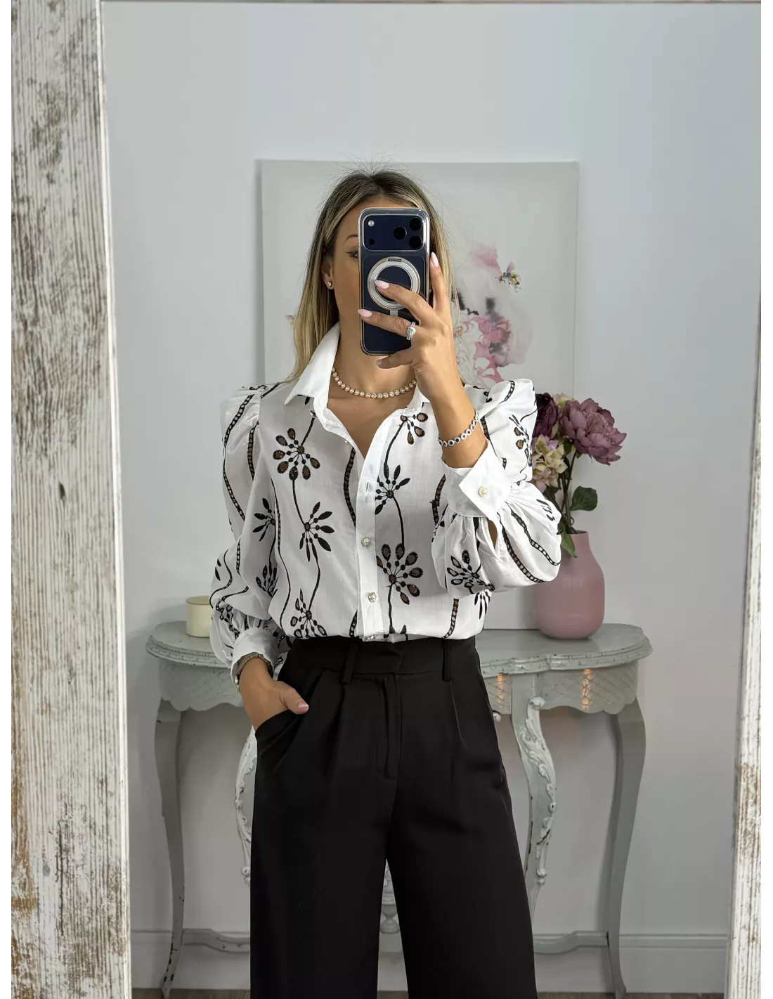 Camisa blanca con bordados negros. Es perforada. Tiene manga farol. El corte es recto y se recomienda la talla habitual. Lleva botones de perlas y dorado.