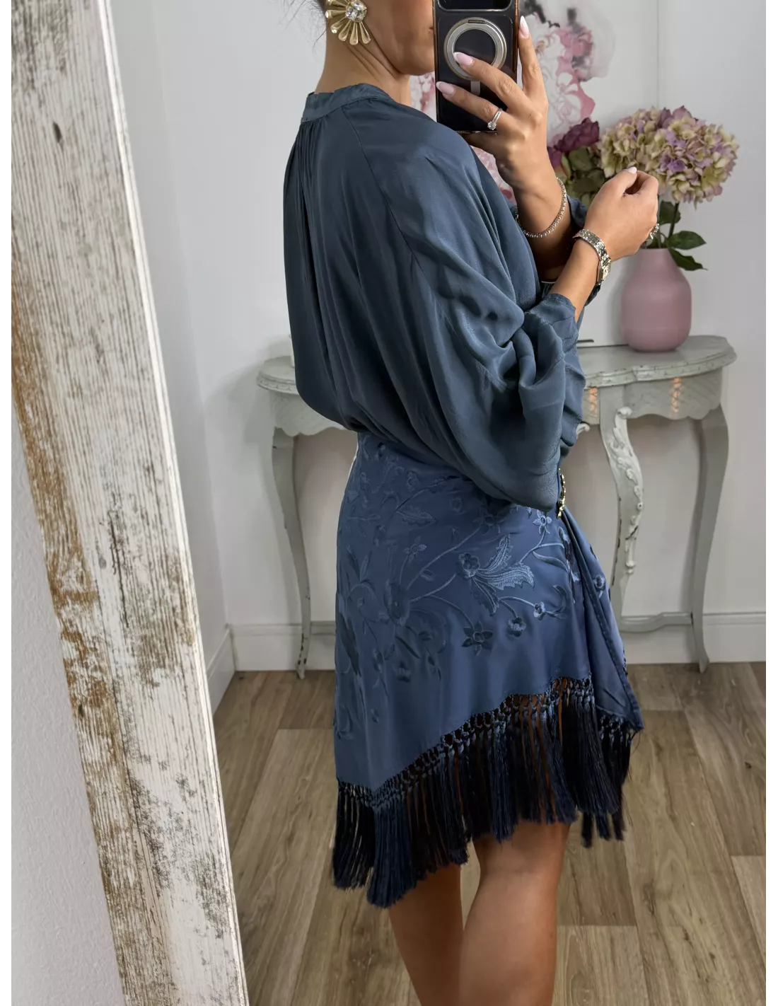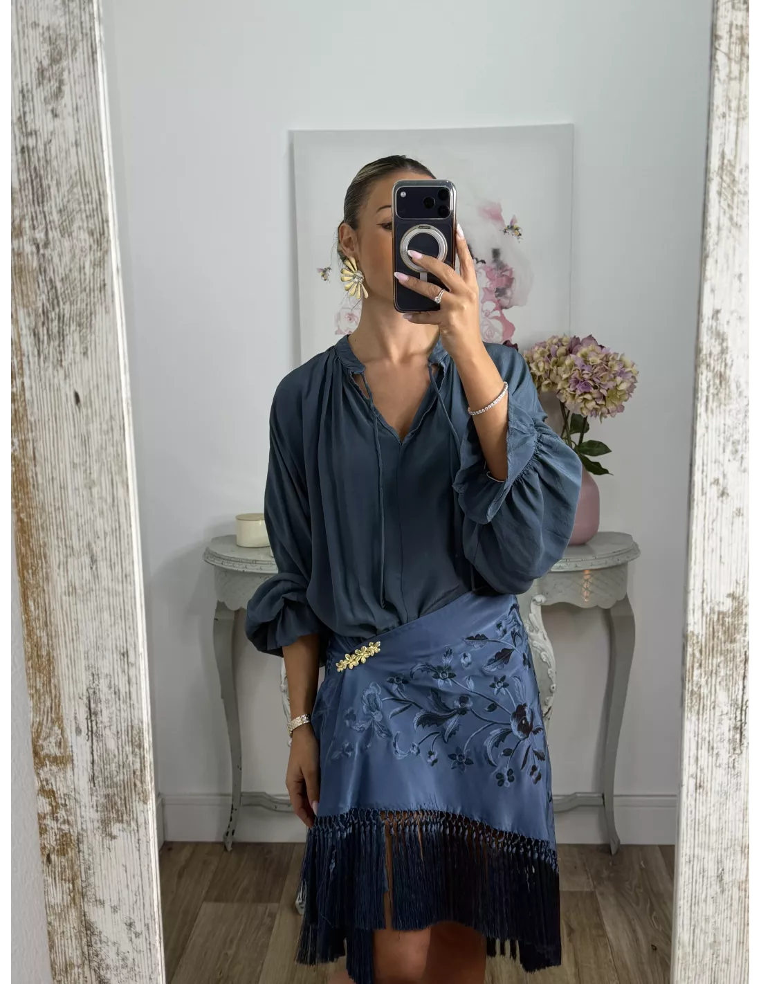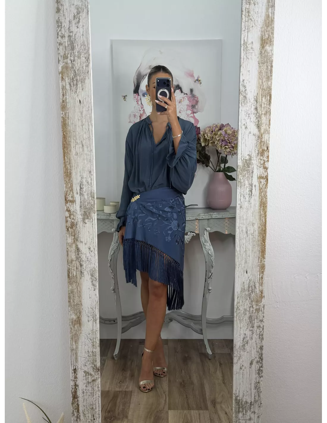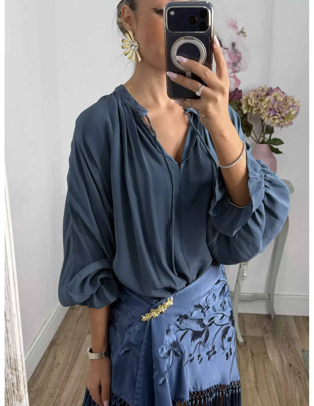 Camisa de corte amplio y fluido que tiene mucha caída. Tiene manga murciélago en el puño lleva una goma y hace un volante.