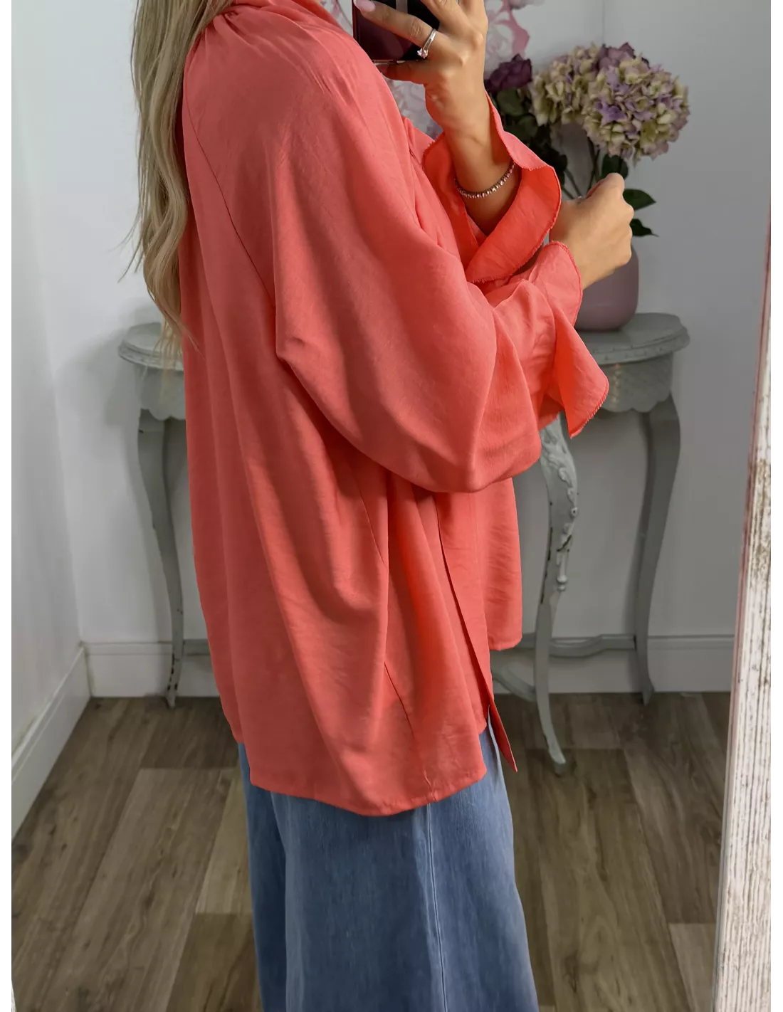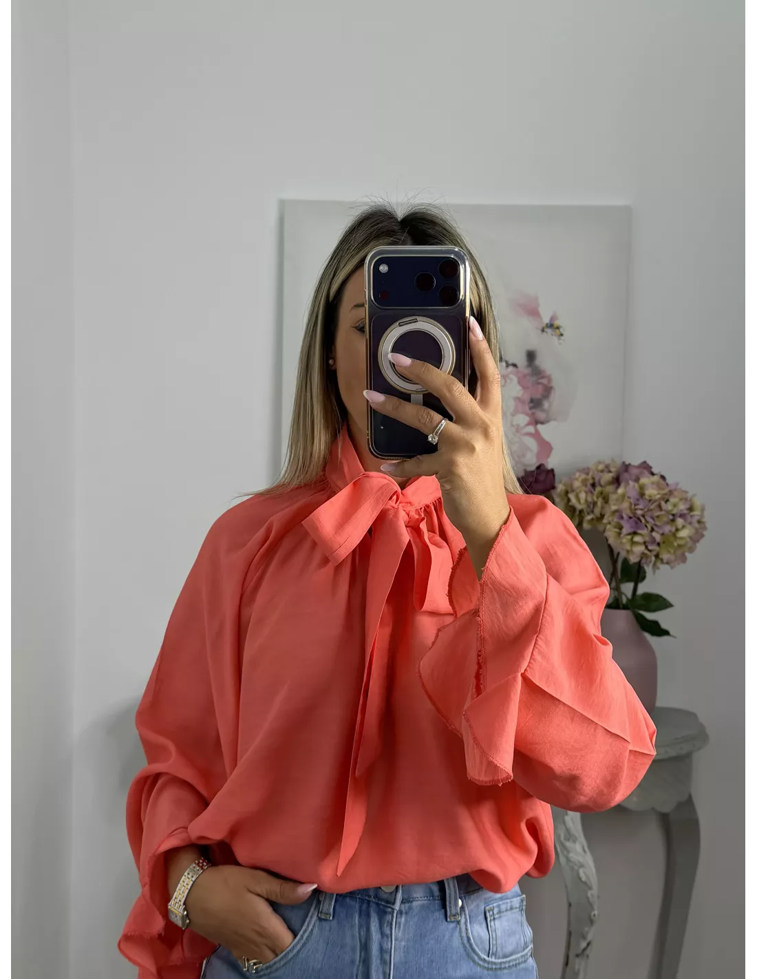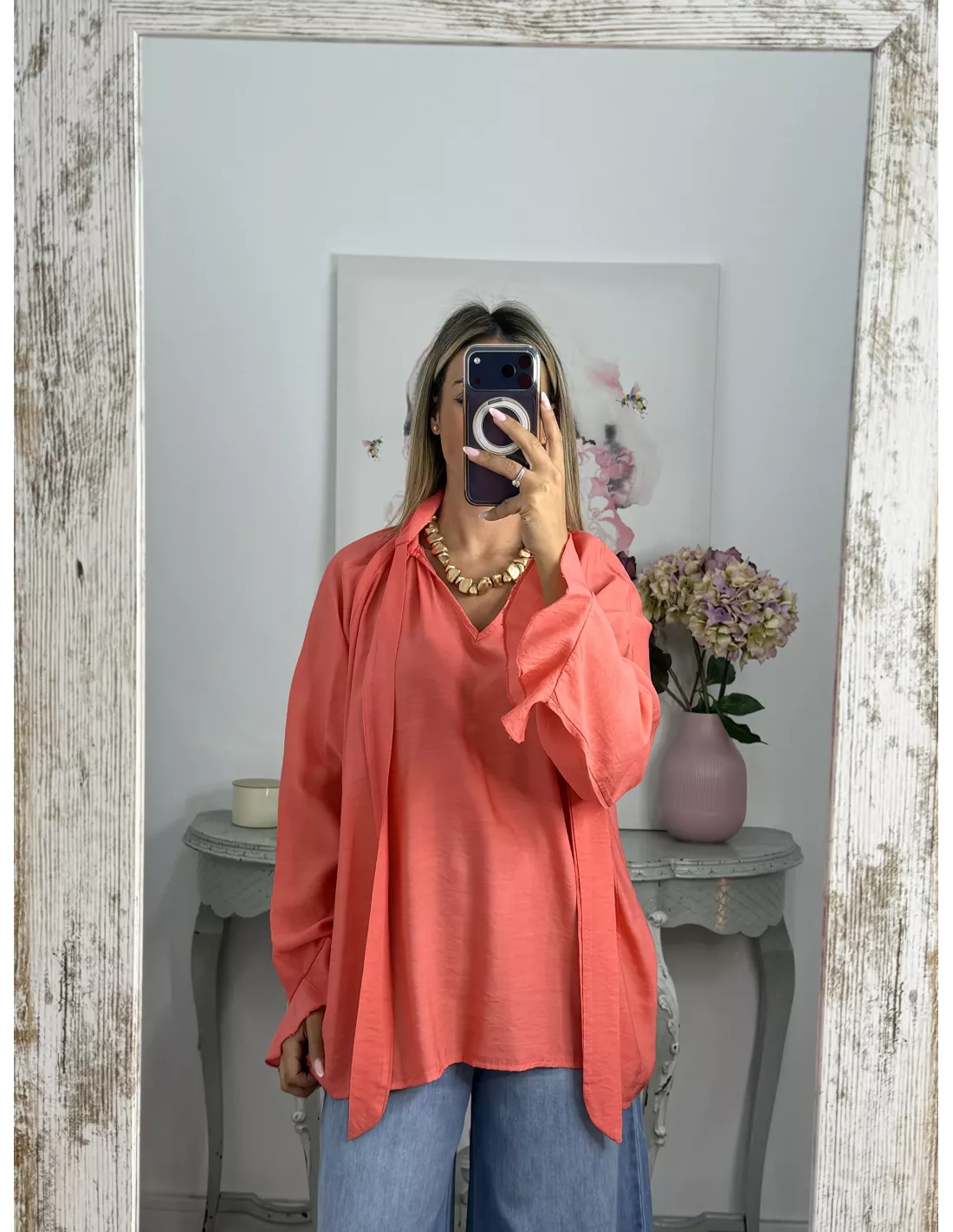 Camisa de corte amplio y oversize, con lazada al cuello.