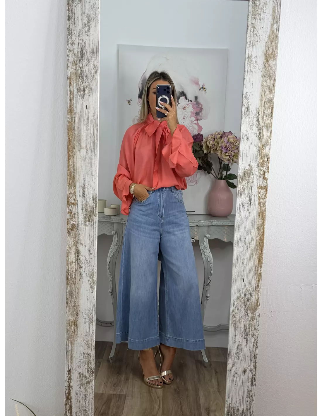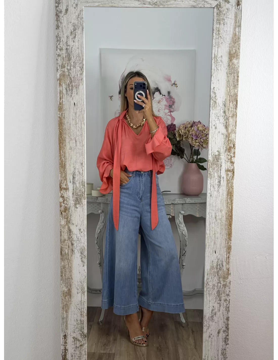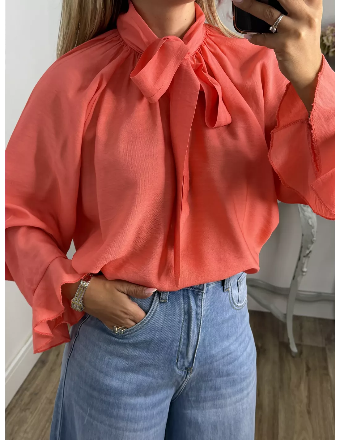Camisa de corte amplio y oversize, con lazada al cuello.