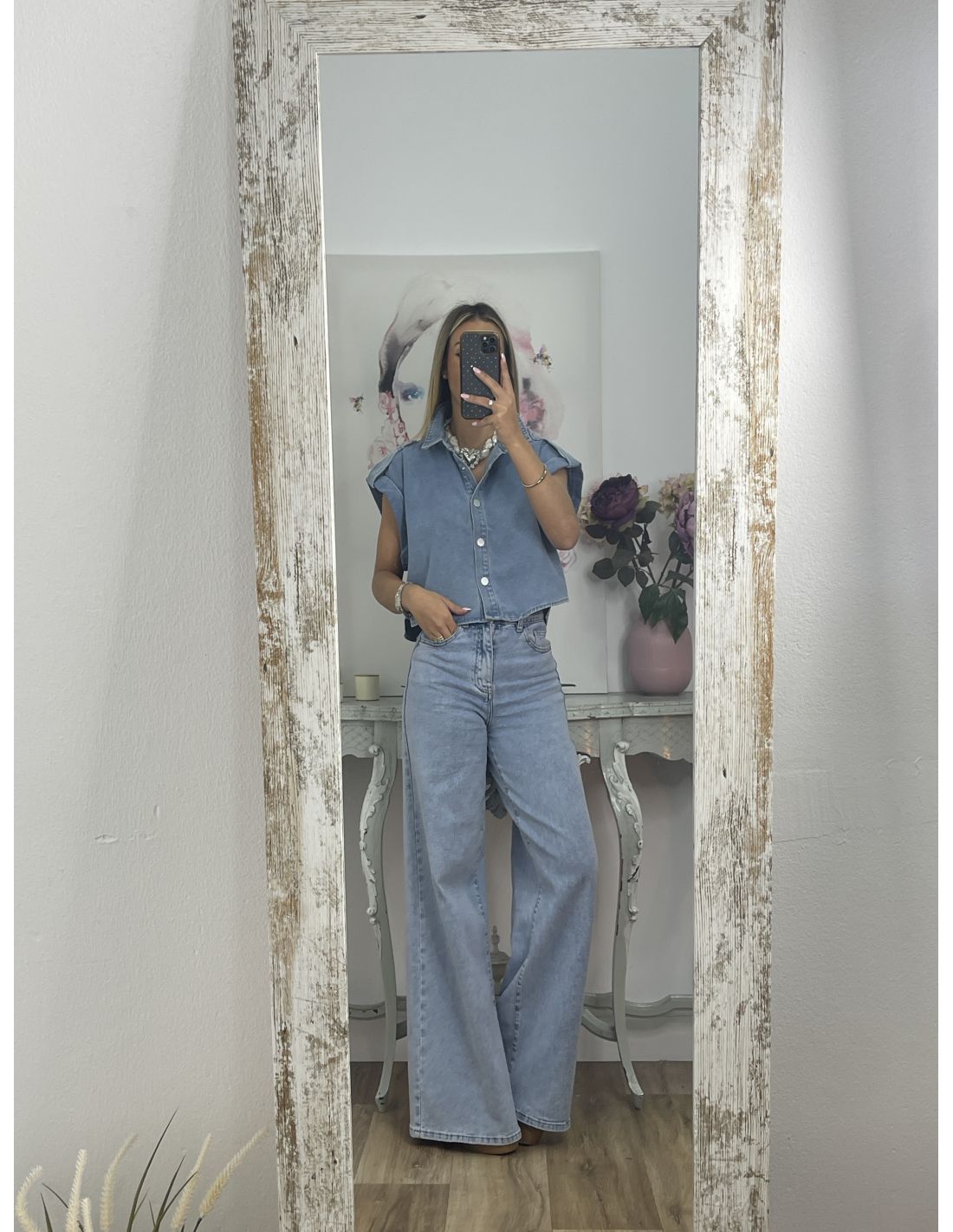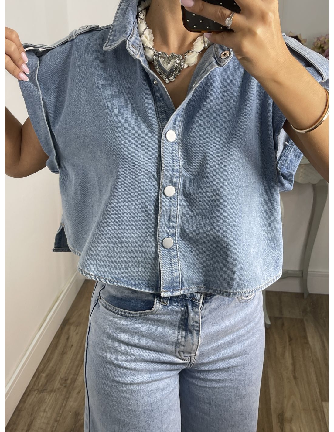 Camisa vaquera cortita con botones de clips plateados de corte oversize.