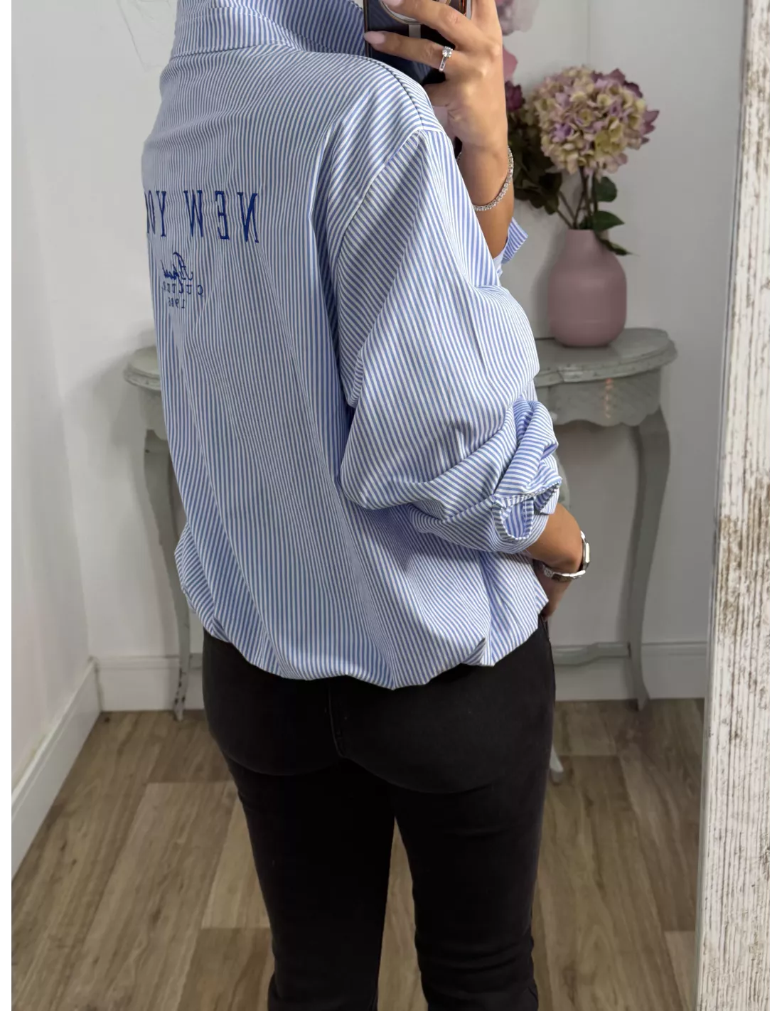 Camisa tipo Bomber. Va forrada la zona delantera y la parte de atrás a excepción de las mangas. Es abotonada. Lleva el cuello entretela y ese efecto globo. Las letras que llevan la zona del pecho y en la parte de atrás de la espalda, son bordadas.