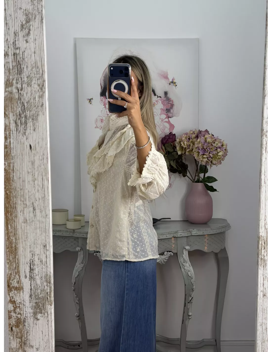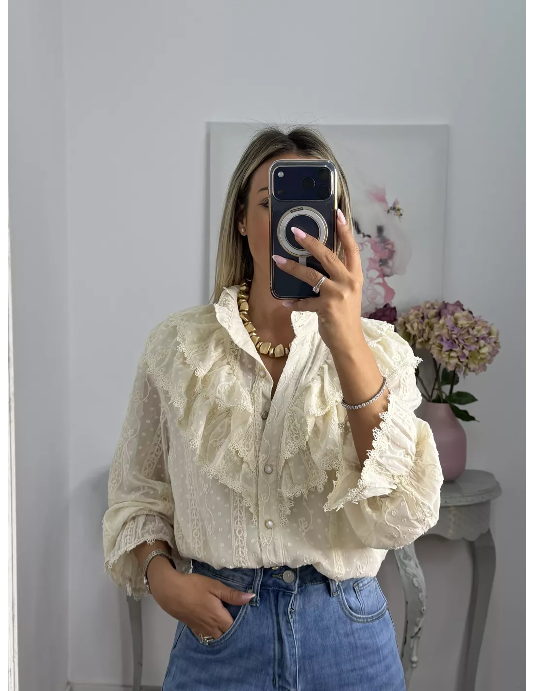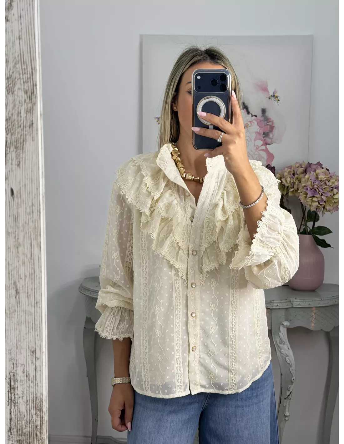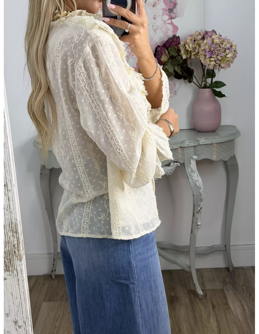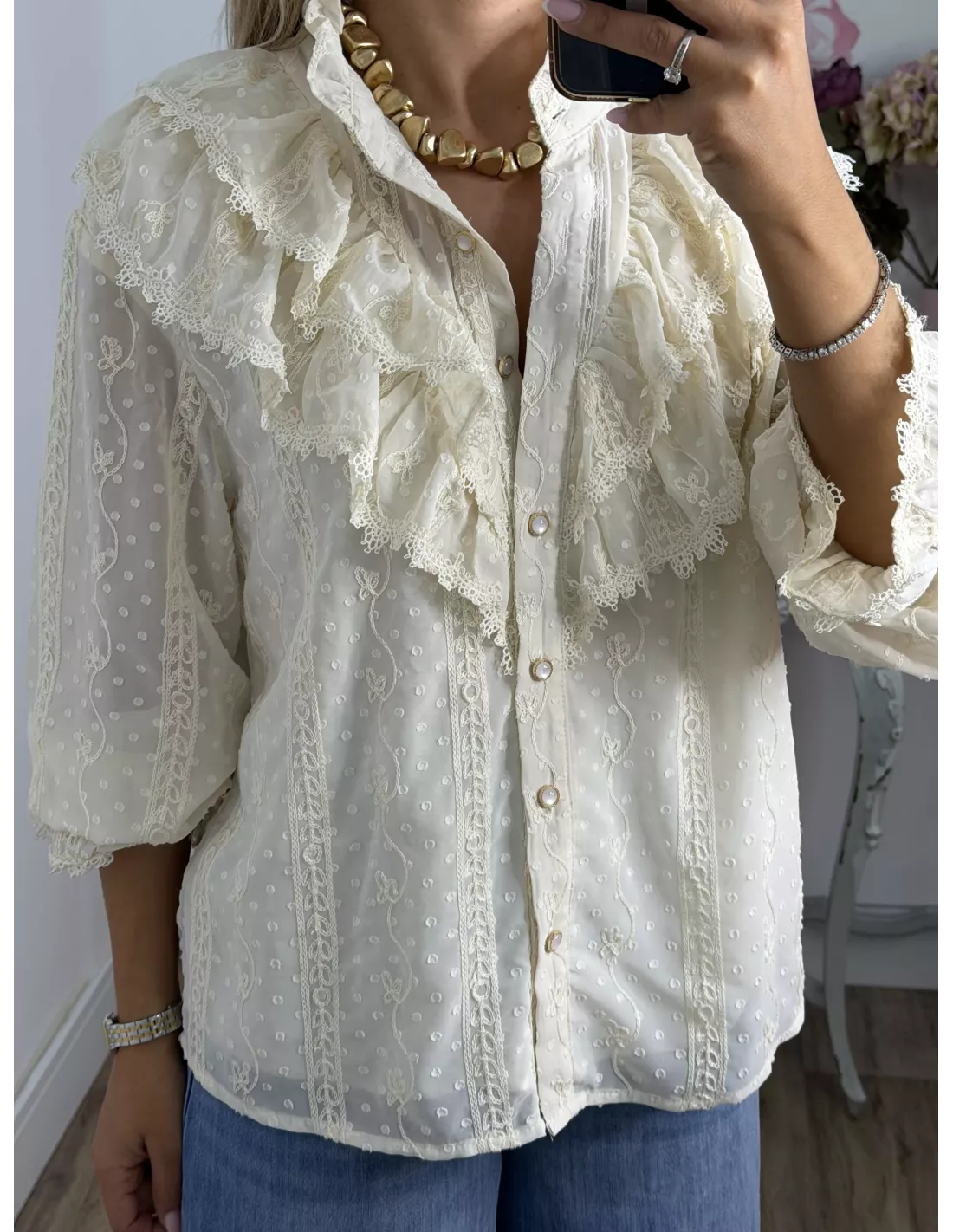 Camisa de gasa, tejido plumeti. La partre delantera va forrada. El corte recto y amplio.