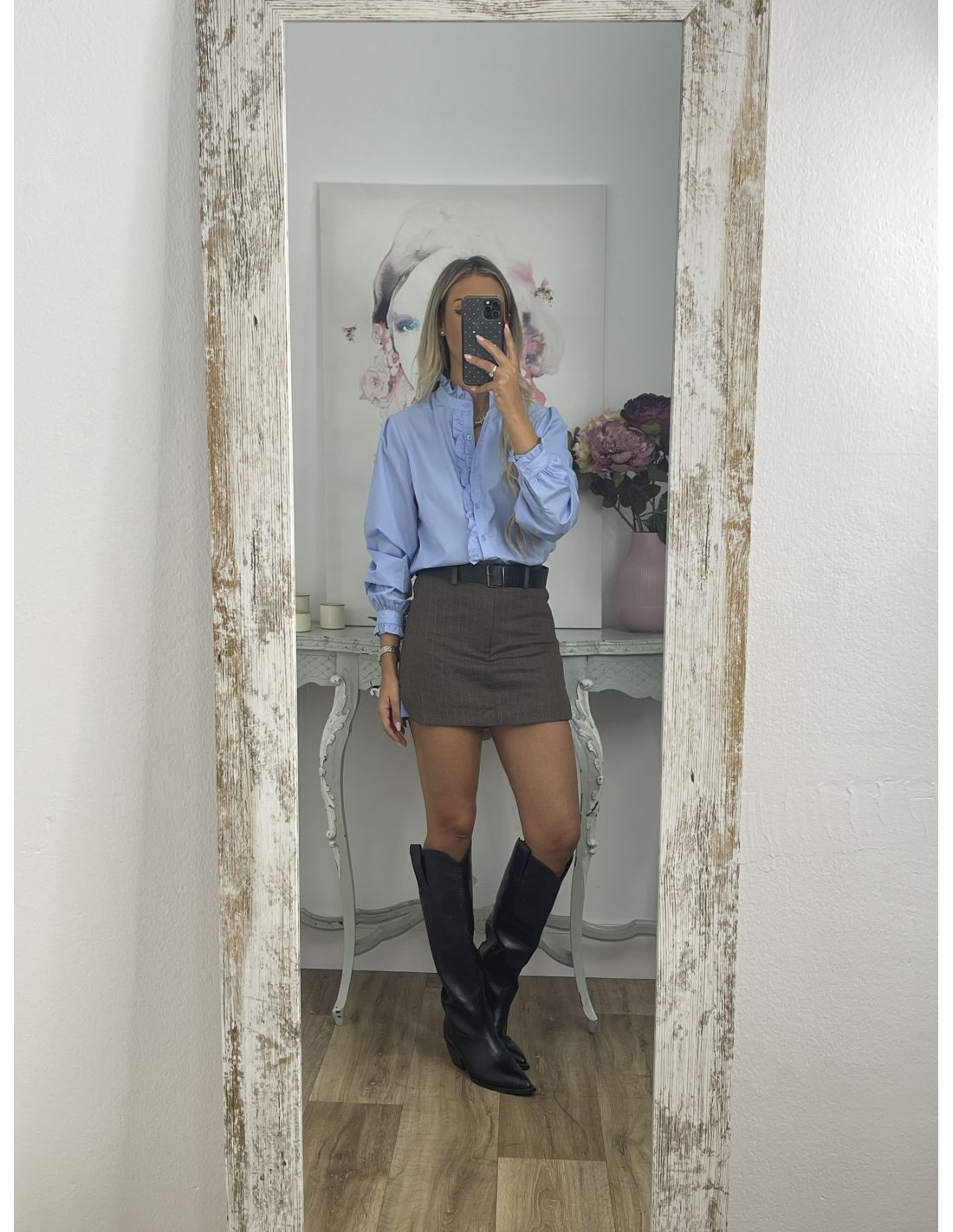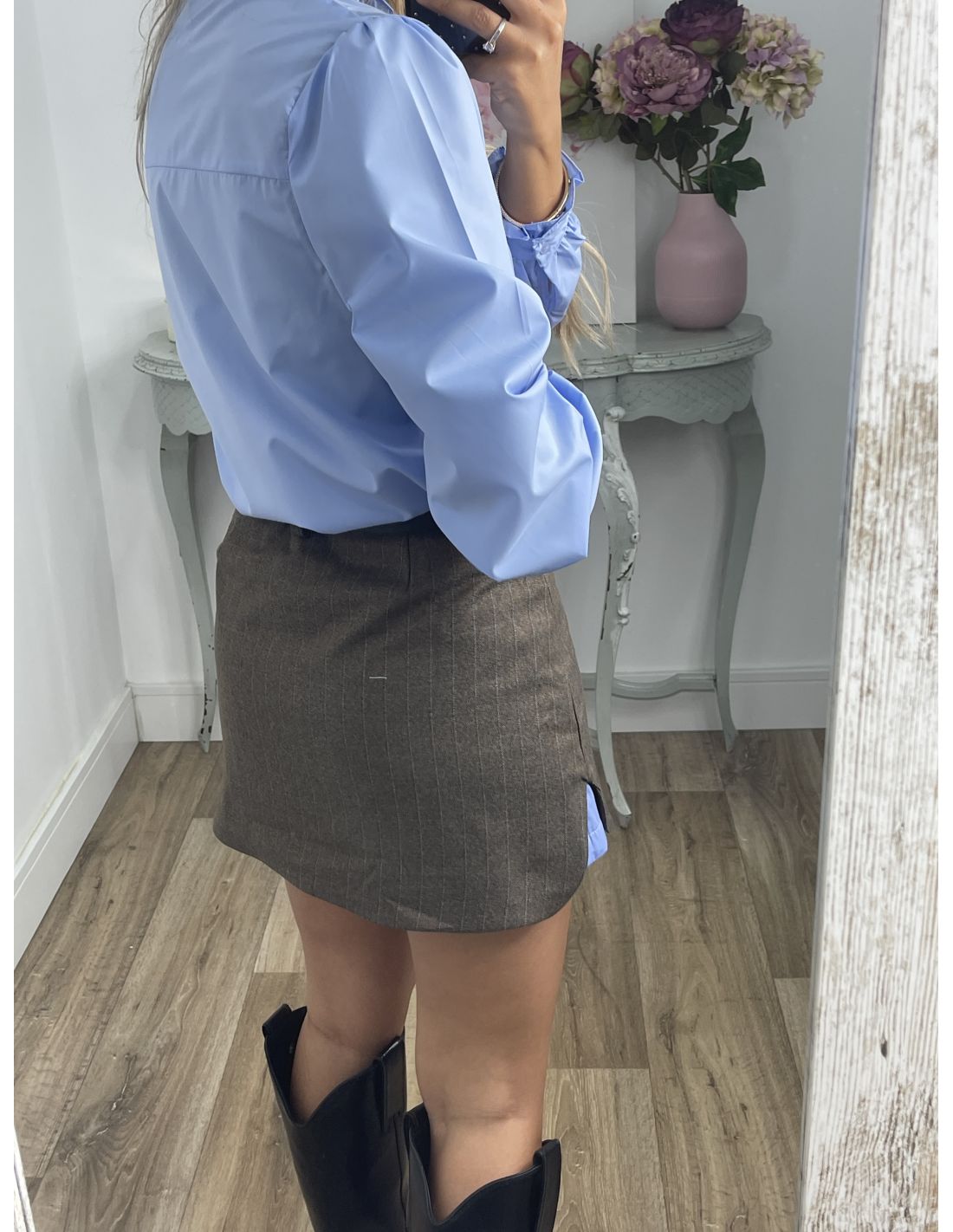 Camisa celeste que lleva volante en la zona del cuello, puños y el parte delantera. El corte es recto.