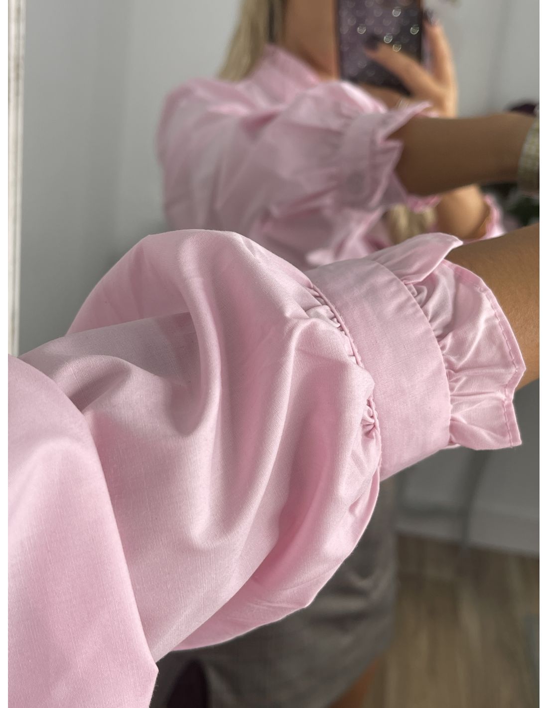 Camisa celeste que lleva volante en la zona del cuello, puños y el parte delantera. El corte es recto.
