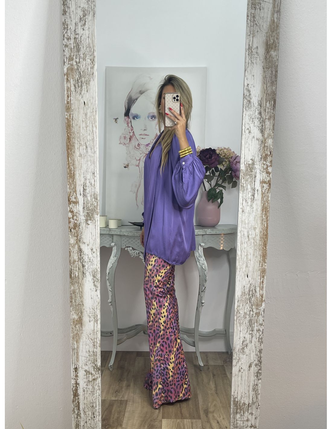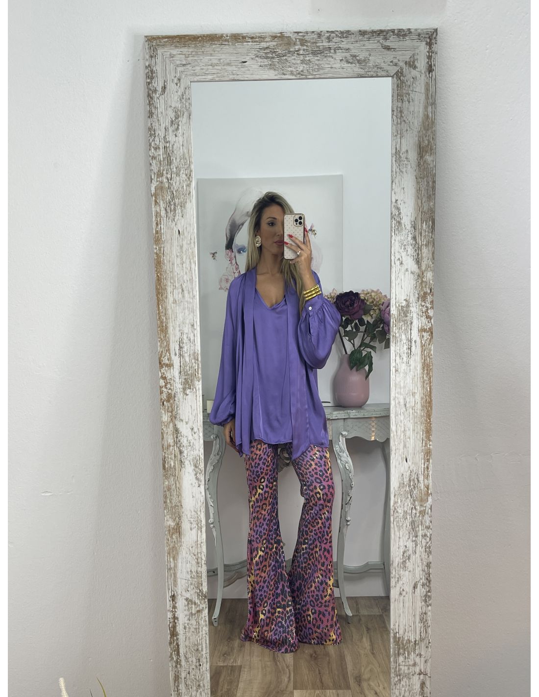 Camisa de satén, con manga abullonada con lazada al cuello.
