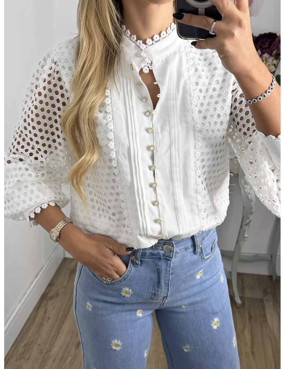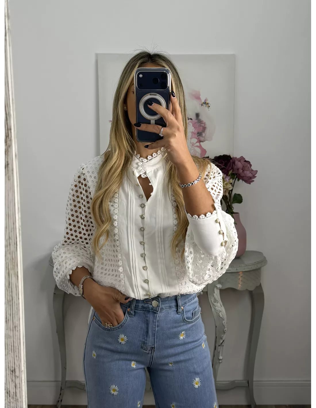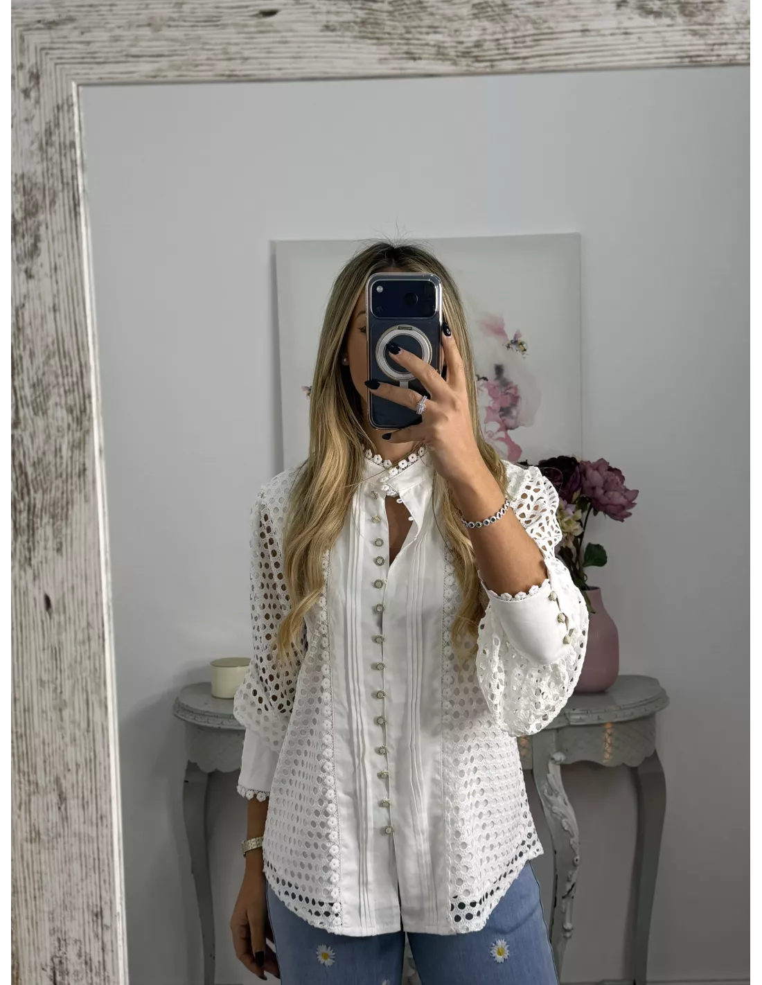 Camisa de cuello de tirilla con botones tipo joya, la parte delantera, la parte de atrás más forrada y las mangas van perforadas no llevan forro. El puño es ancho con tres botones. El corte es recto y se recomienda la talla habitual.
