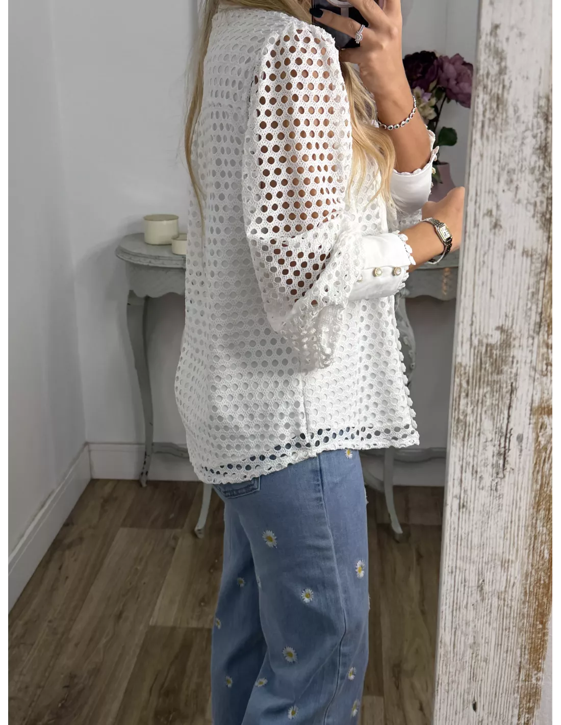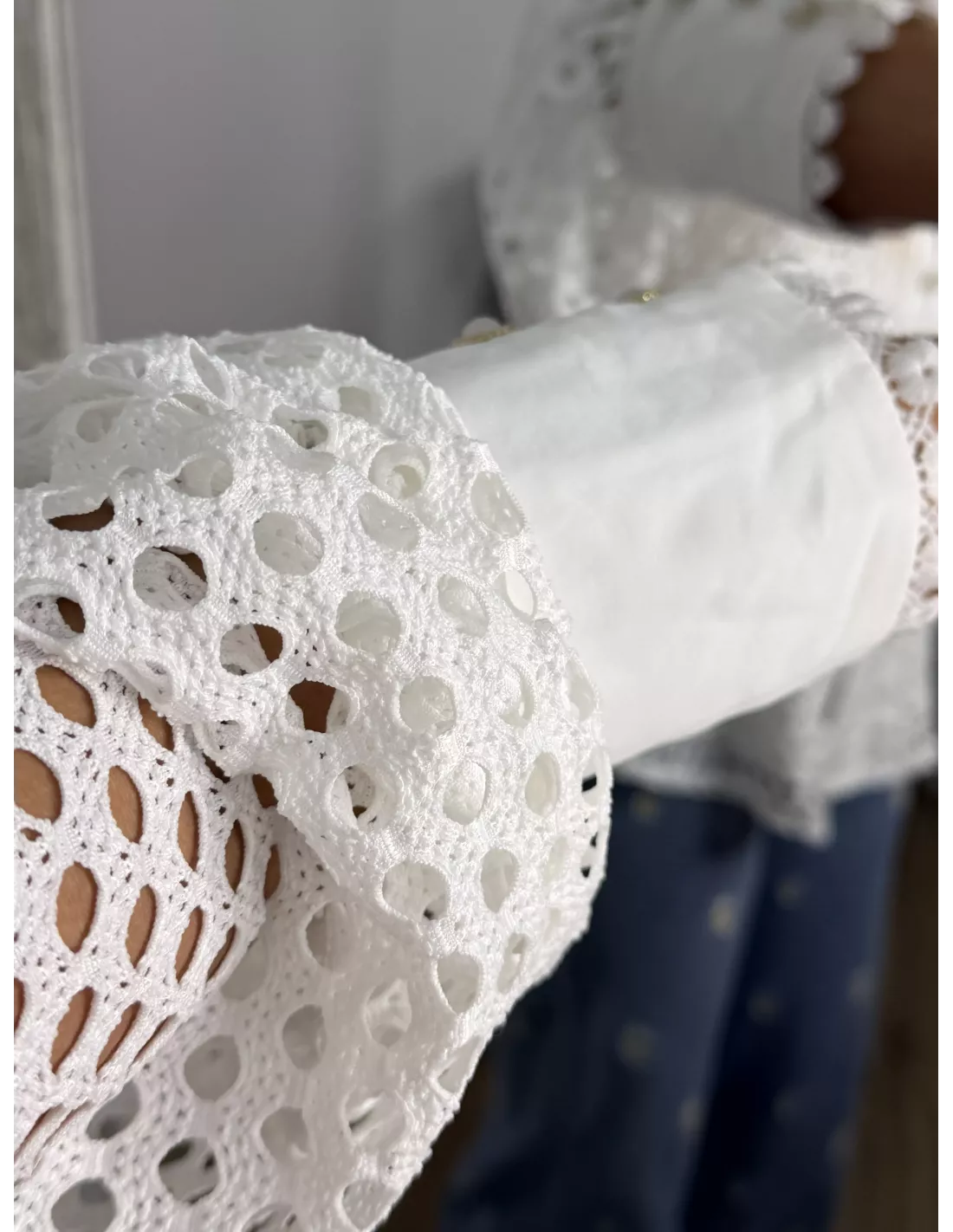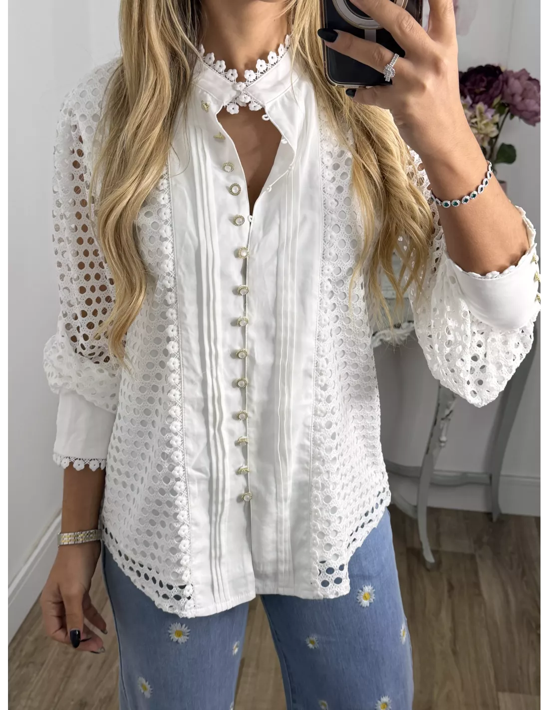 Camisa de cuello de tirilla con botones tipo joya, la parte delantera, la parte de atrás más forrada y las mangas van perforadas no llevan forro. El puño es ancho con tres botones. El corte es recto y se recomienda la talla habitual.
