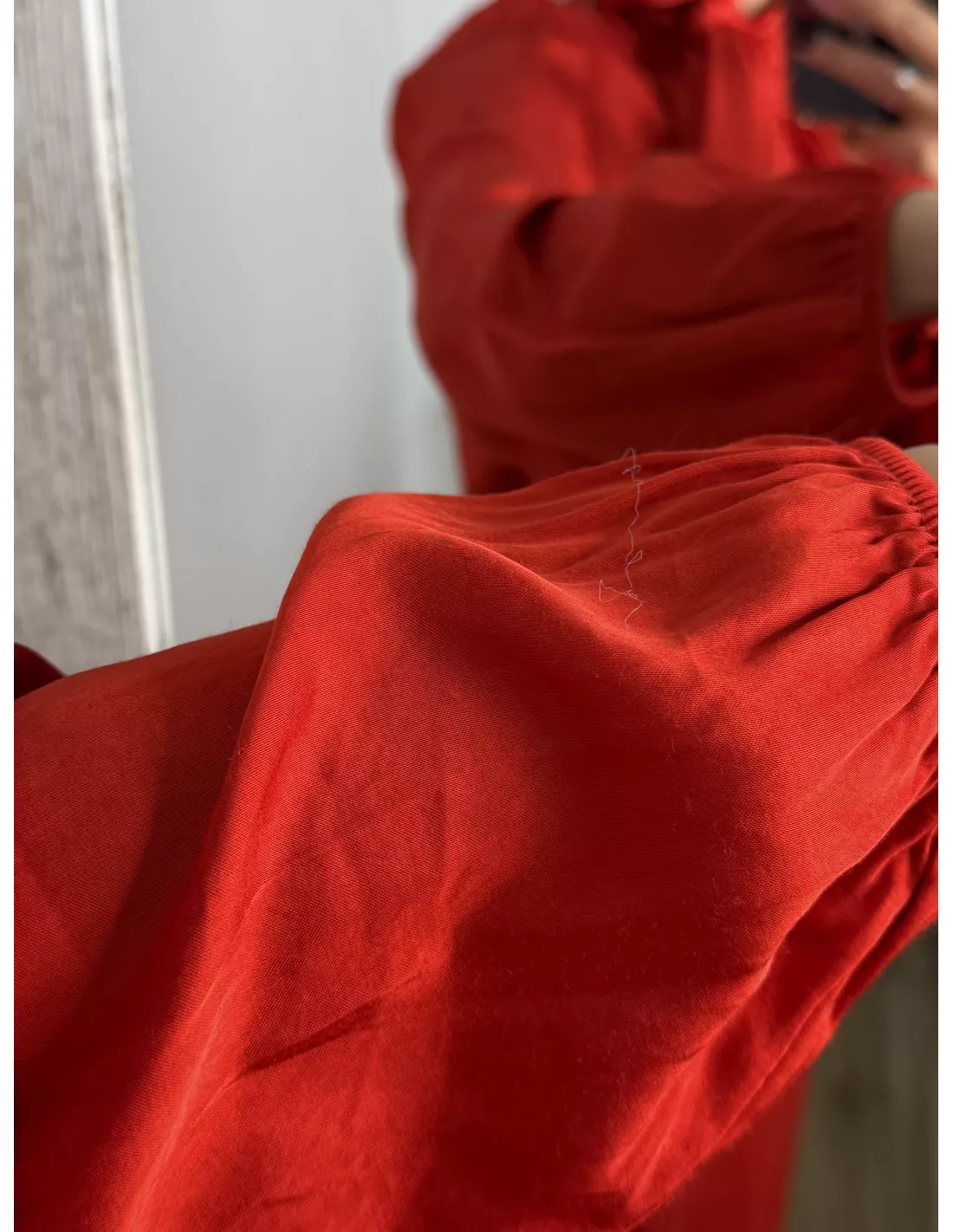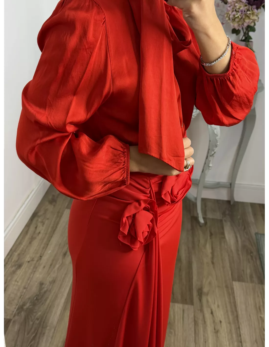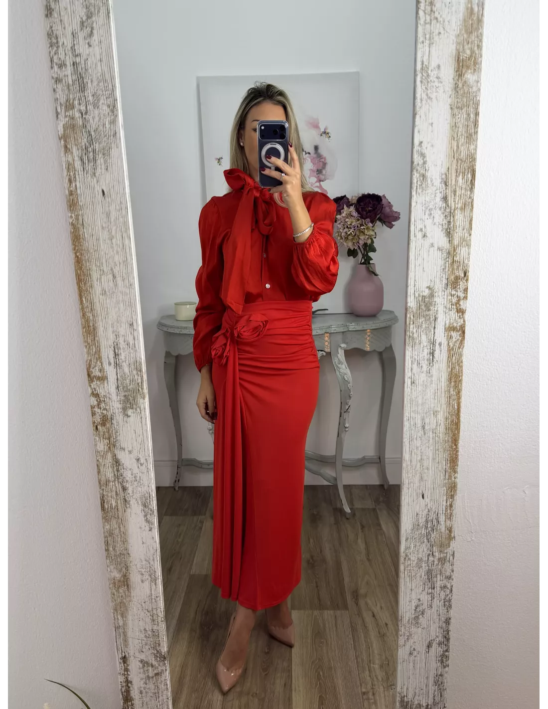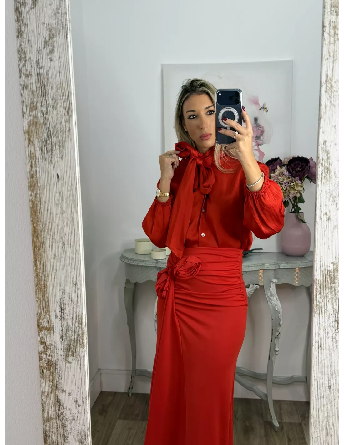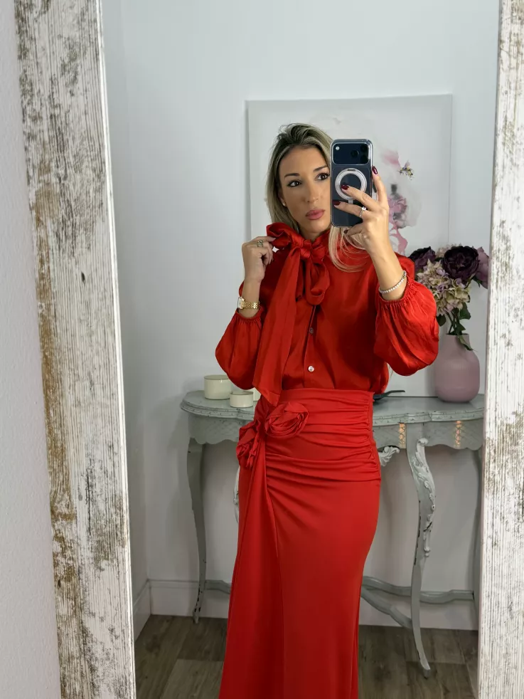 Camisa de tejido satinado de corte recto.la manga en la zona del puño es abullonada. Llevo una goma en la zona del hombro es tipo farol.