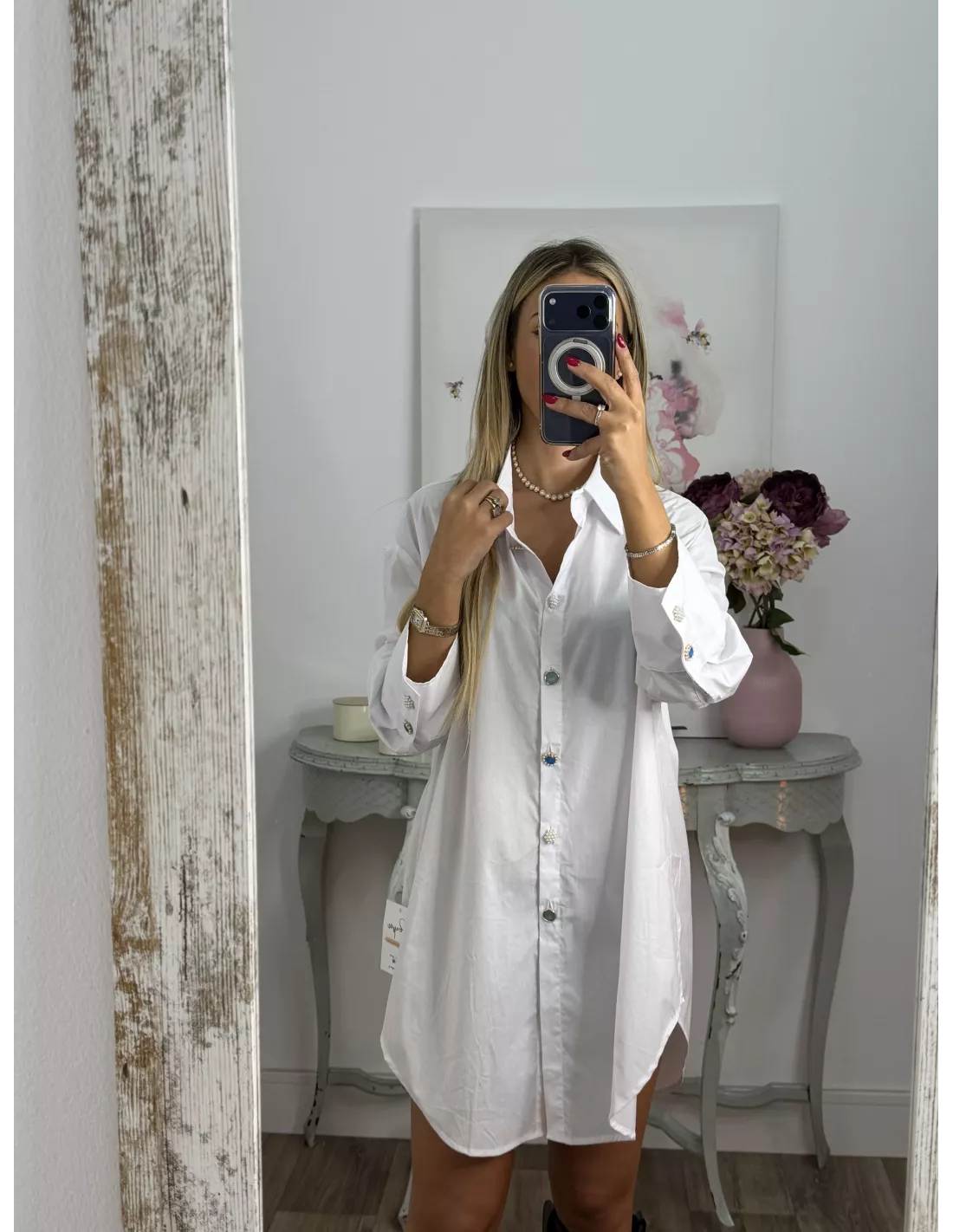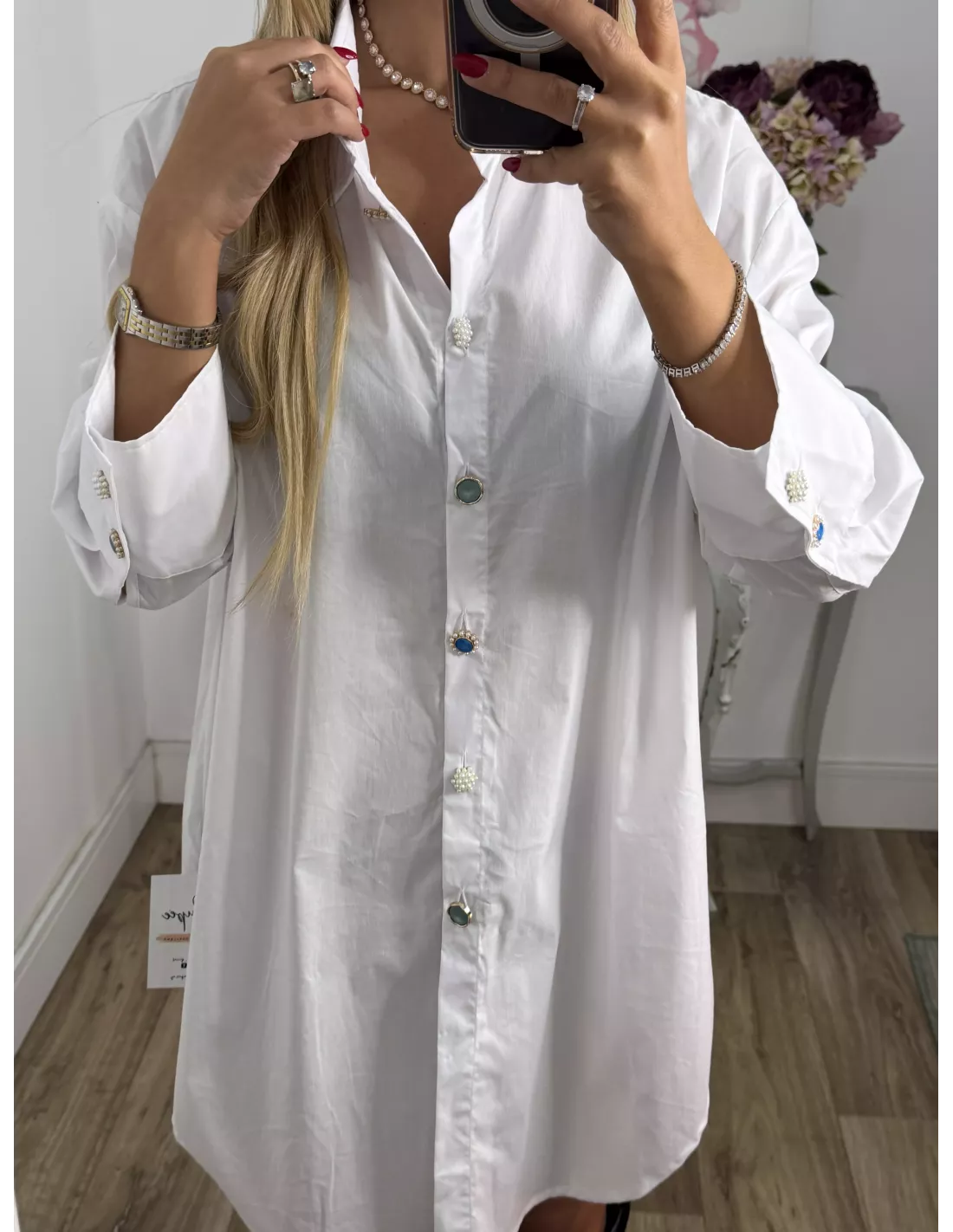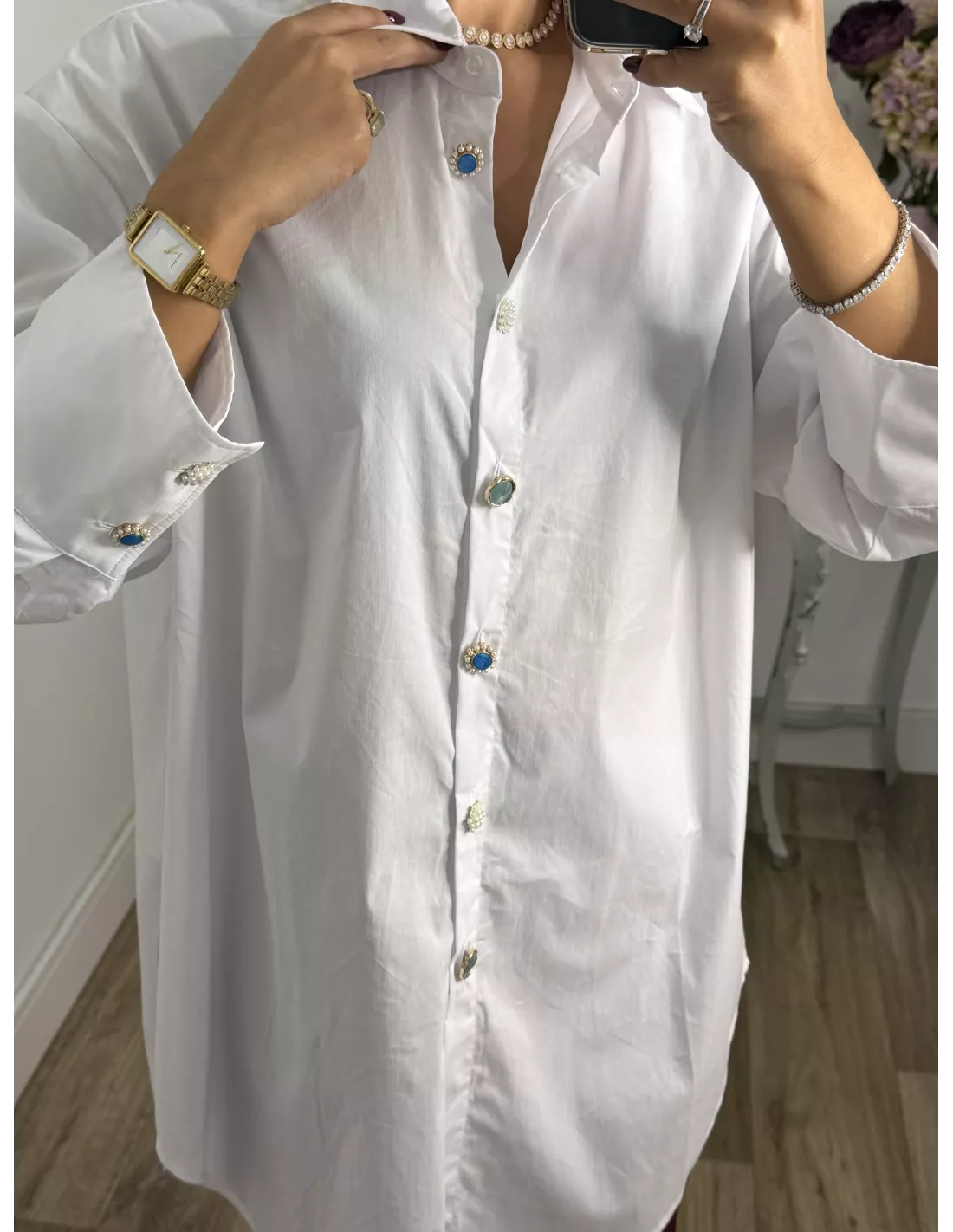 Camisa largo con botones tipo joya. Es larga con cuello y puños entretelados, la parte de abojo hace forma sobrerenda y sube un poco de los laterales