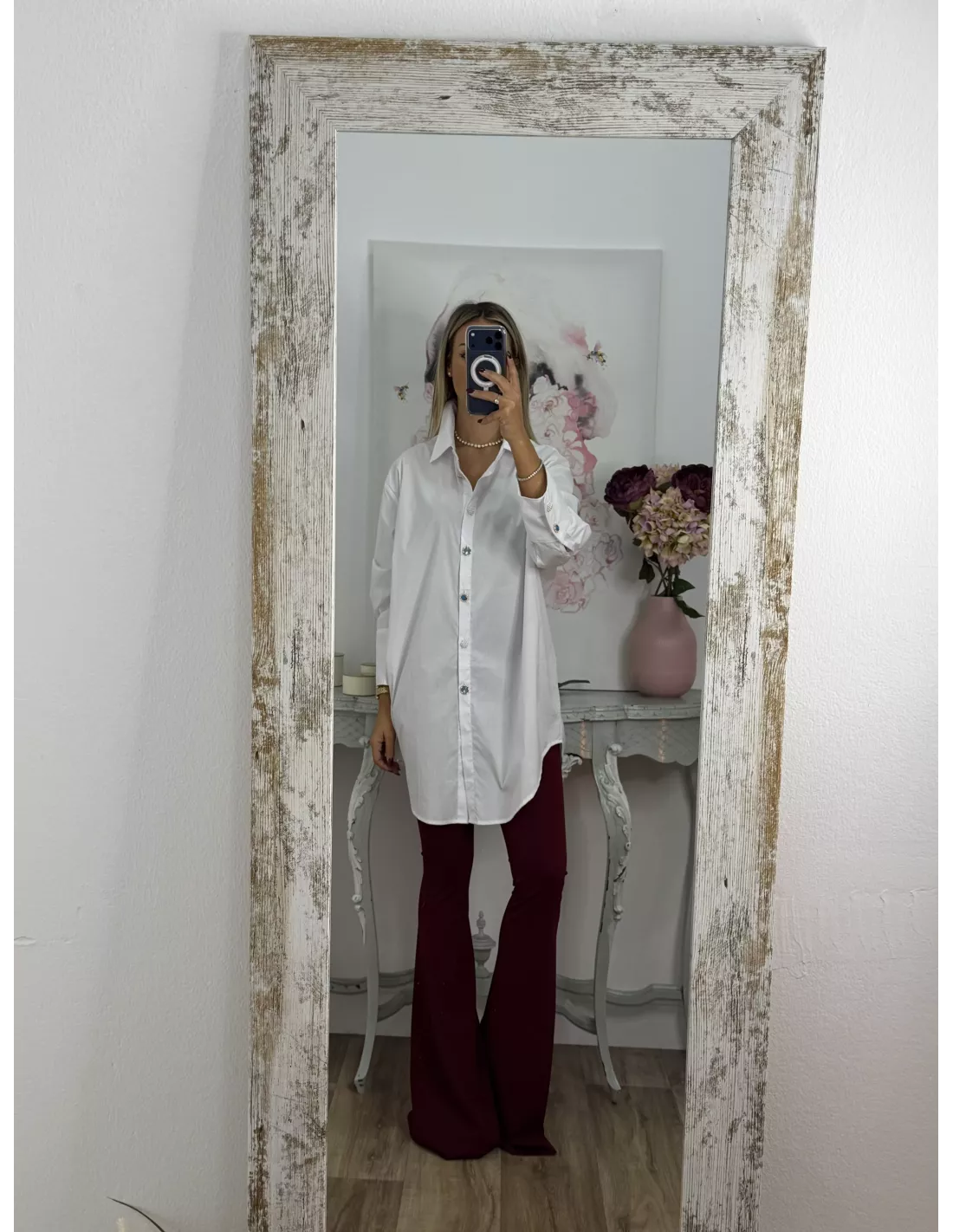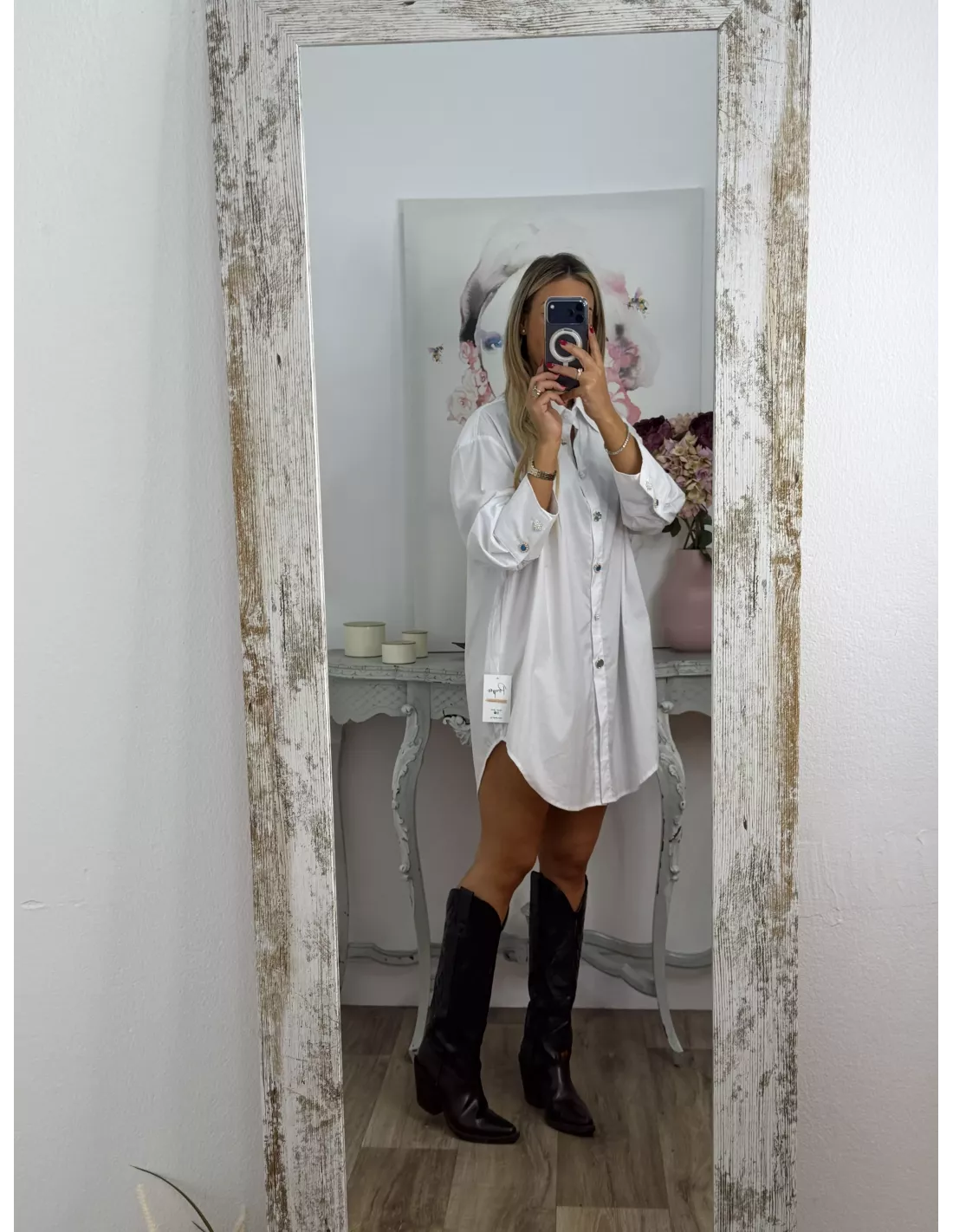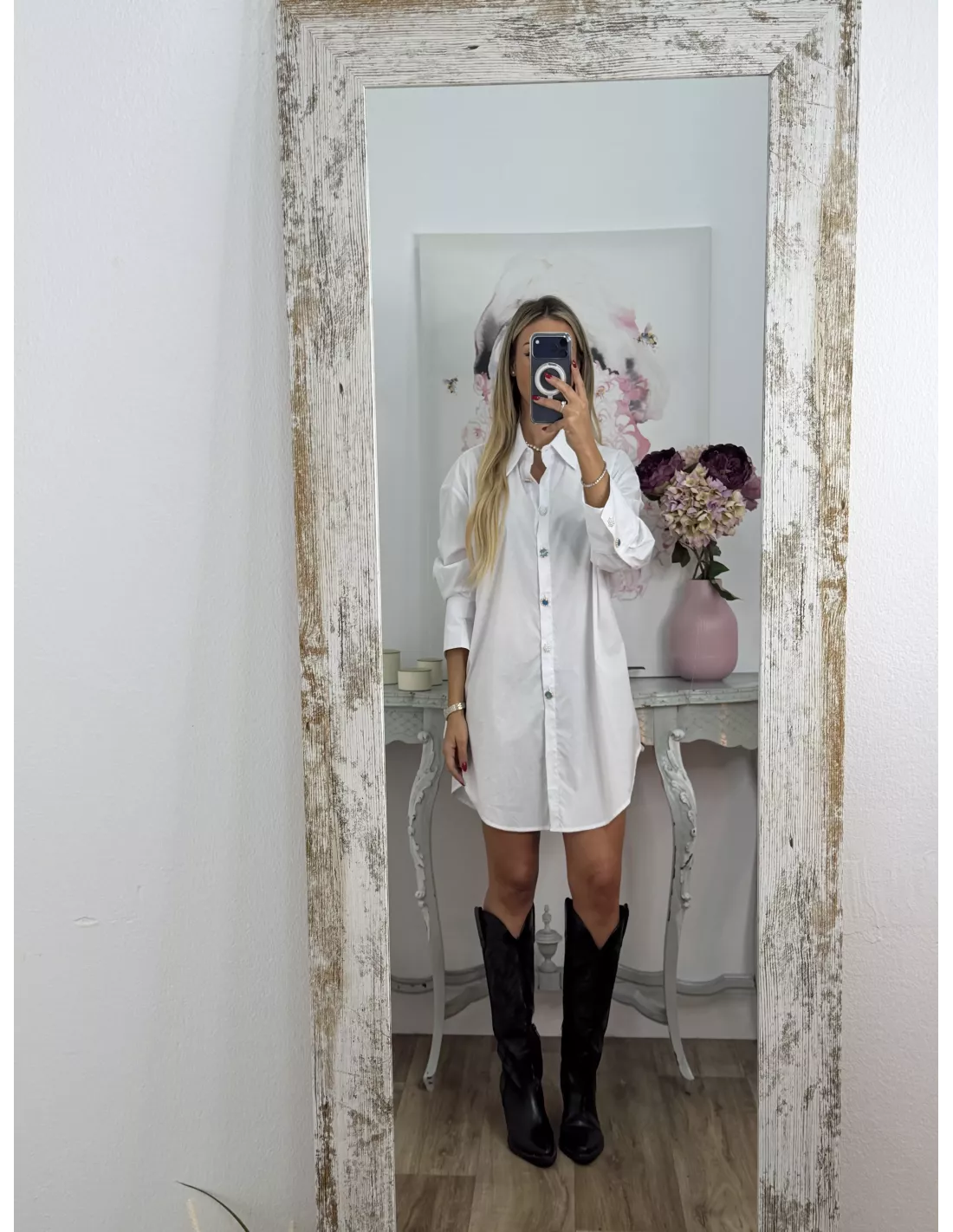Camisa largo con botones tipo joya. Es larga con cuello y puños entretelados, la parte de abojo hace forma sobrerenda y sube un poco de los laterales