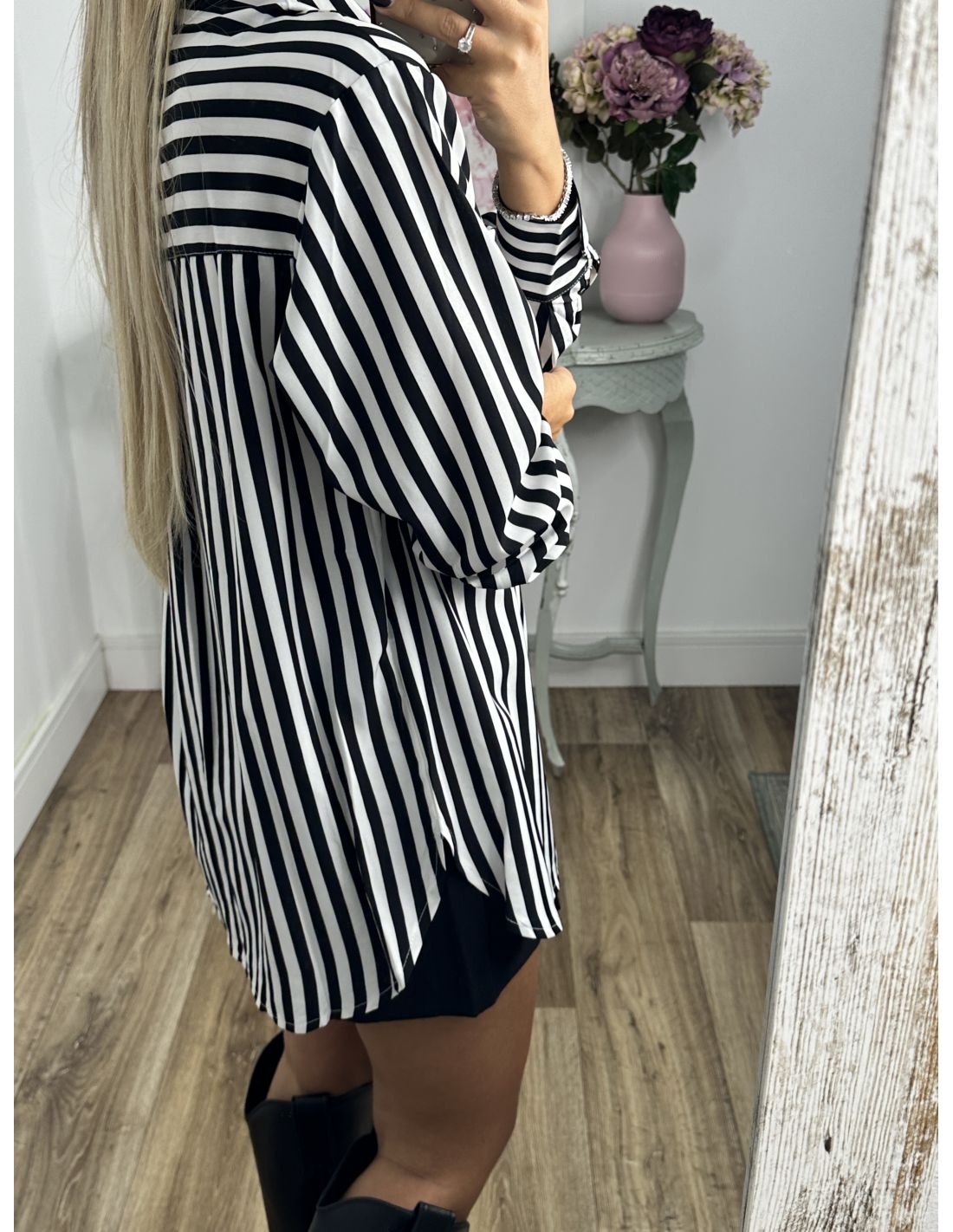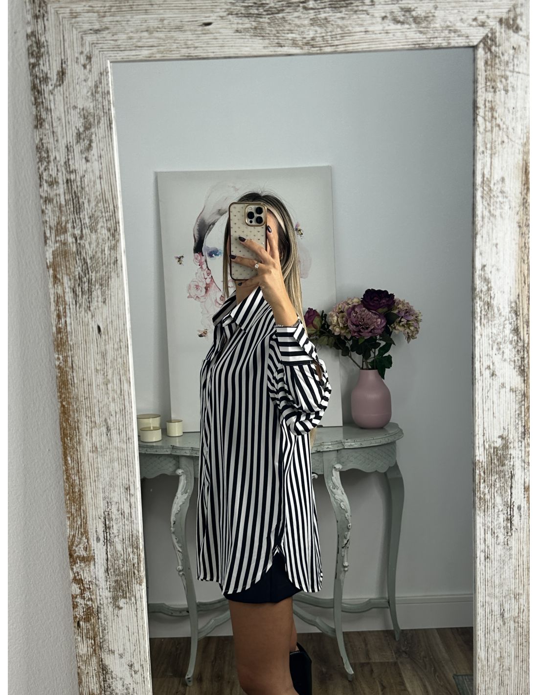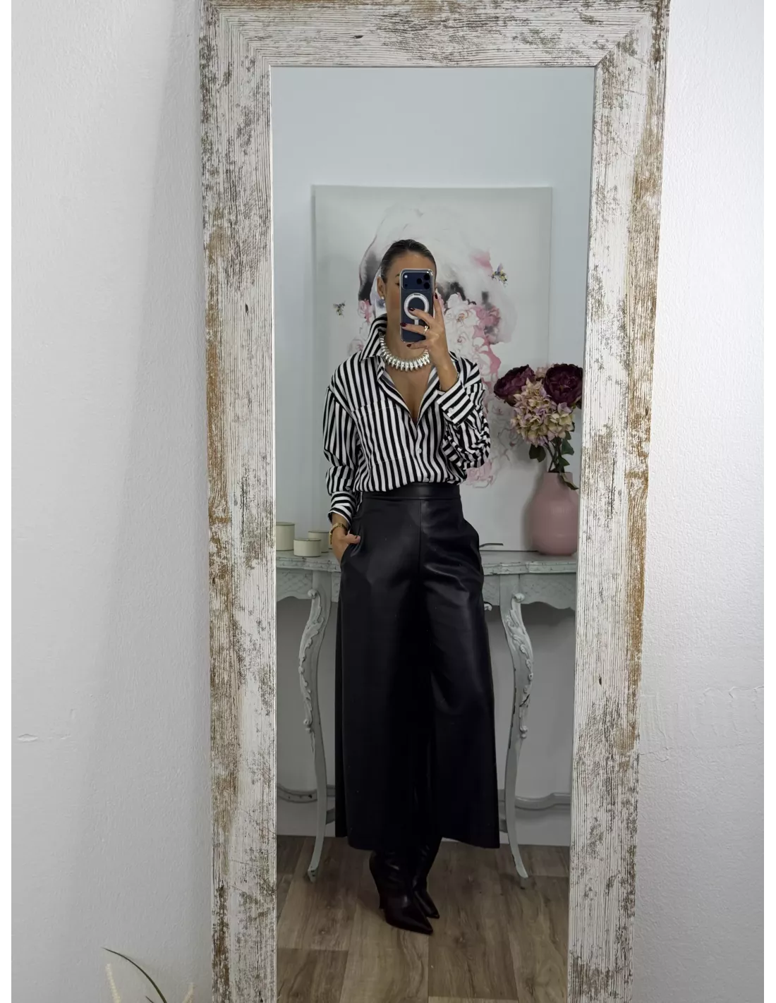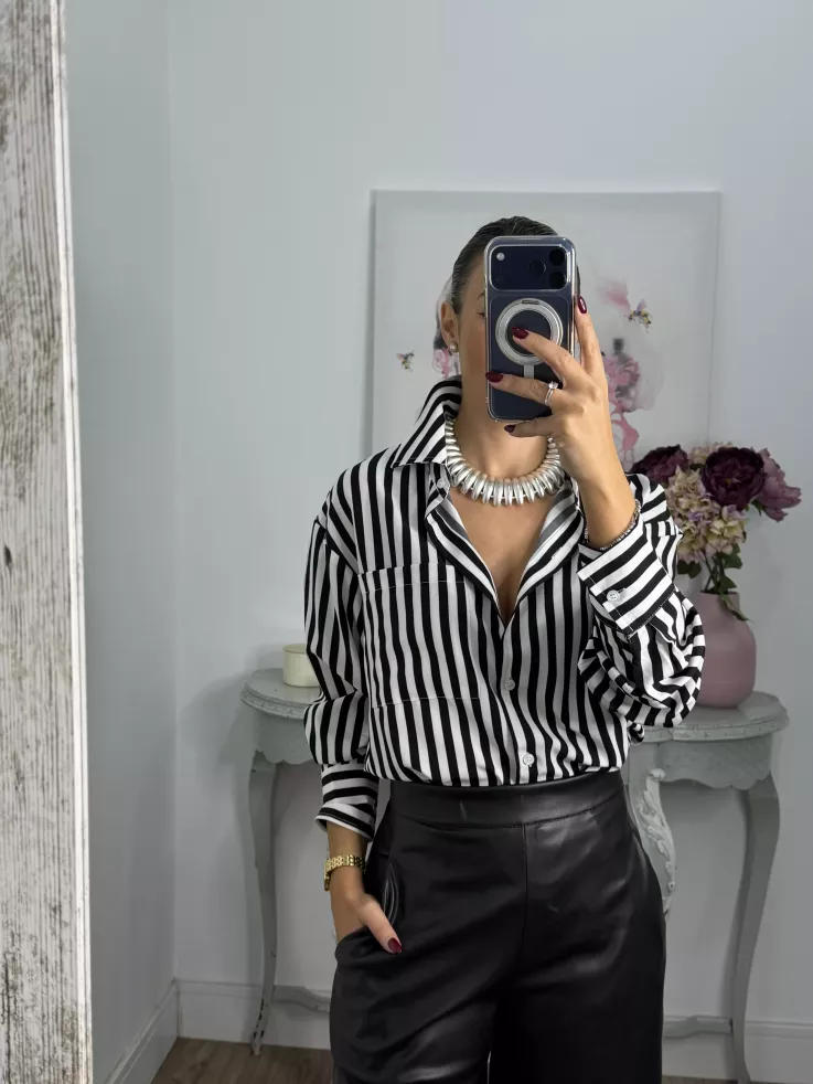 Camisa celeste que lleva volante en la zona del cuello, puños y el parte delantera. El corte es recto.