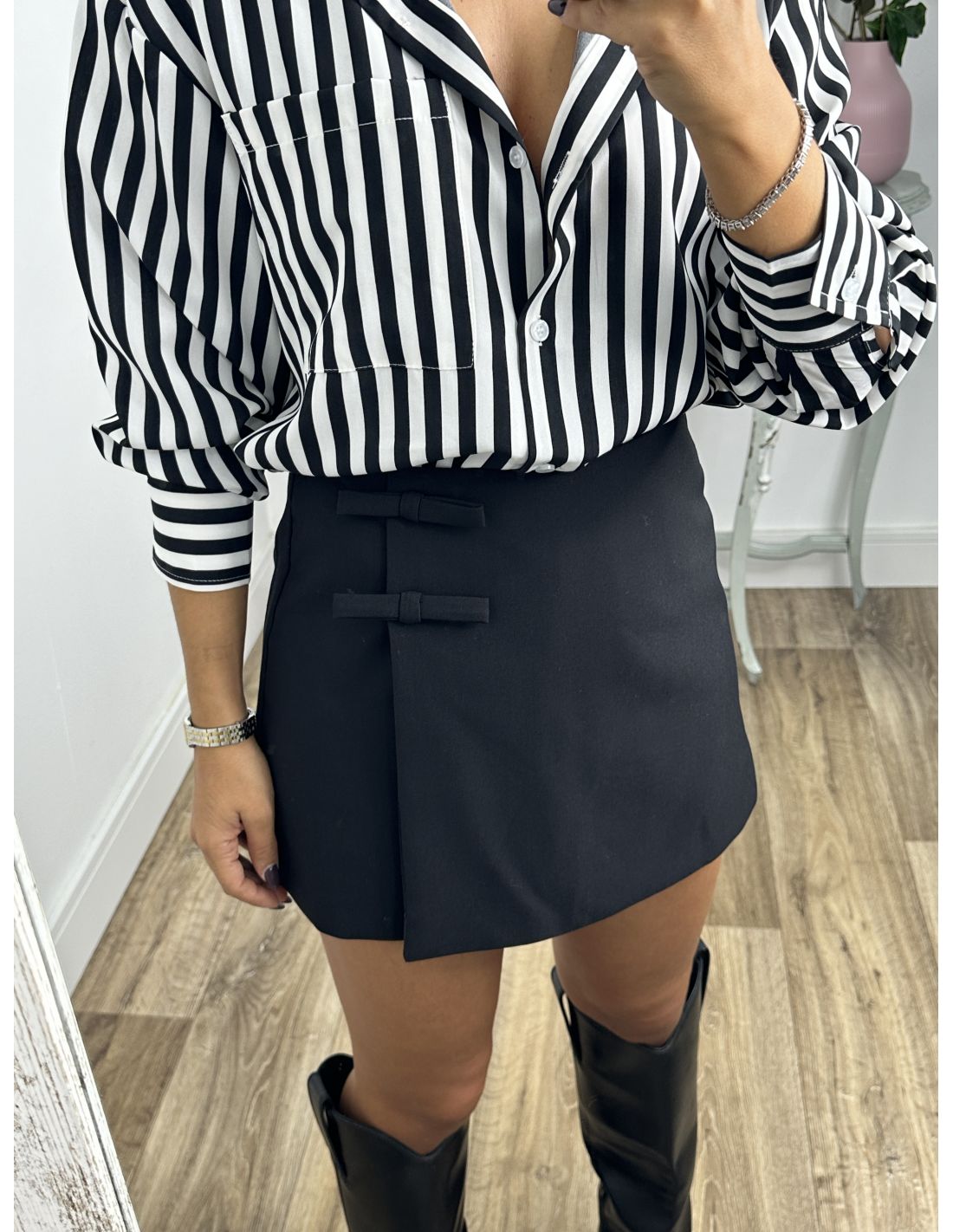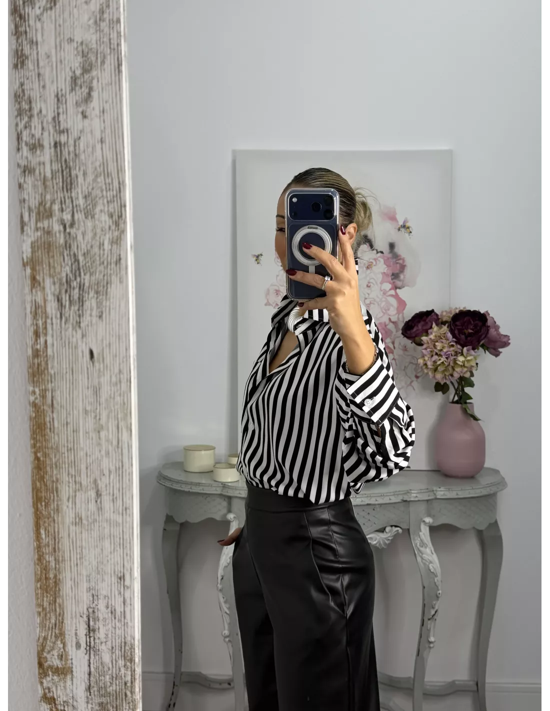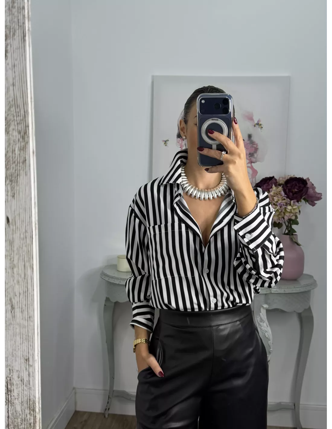 Camisa celeste que lleva volante en la zona del cuello, puños y el parte delantera. El corte es recto.