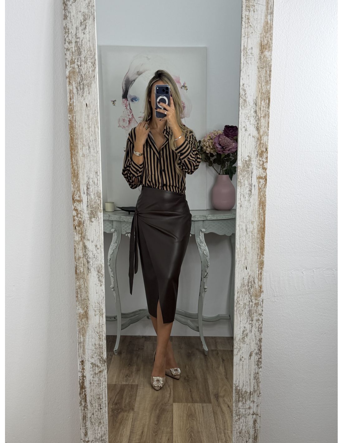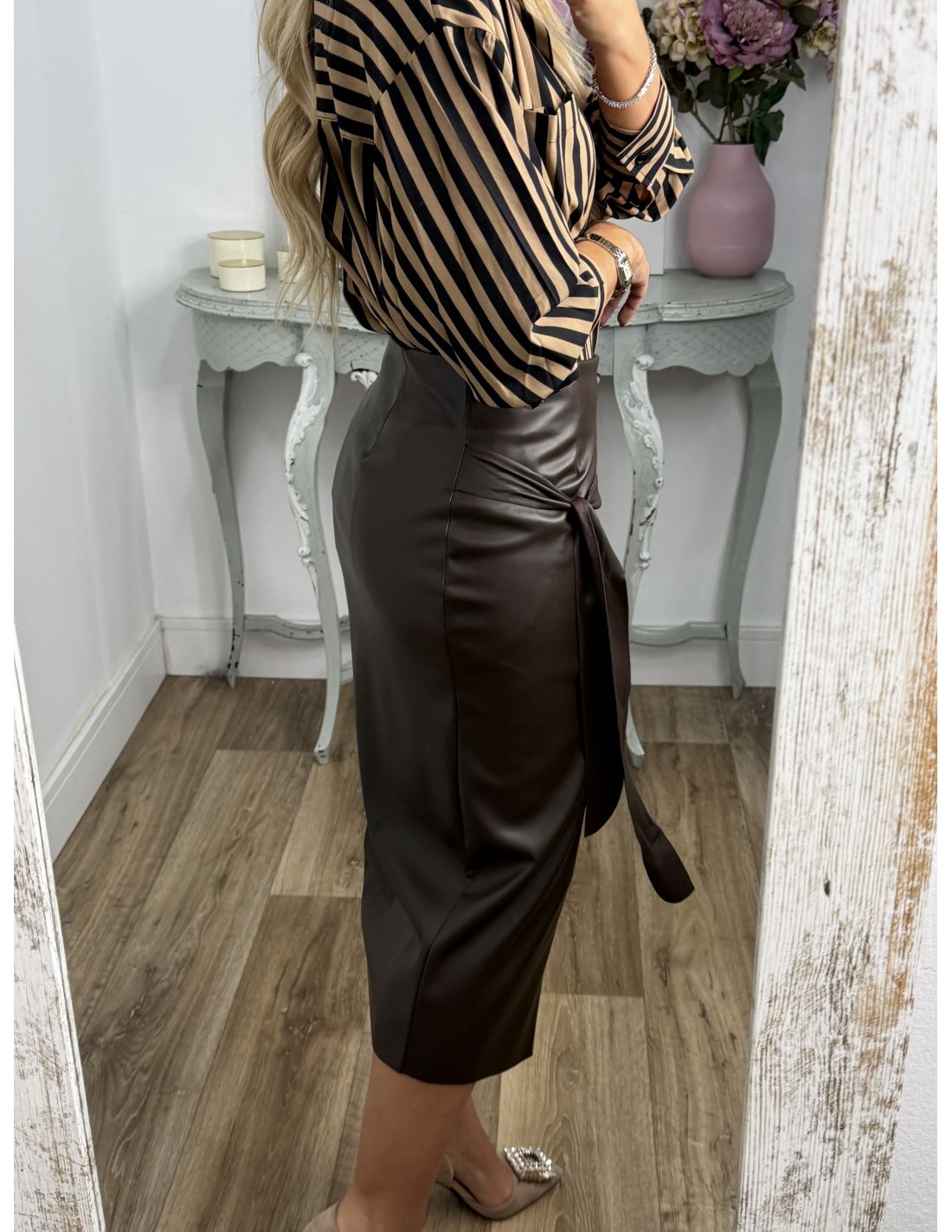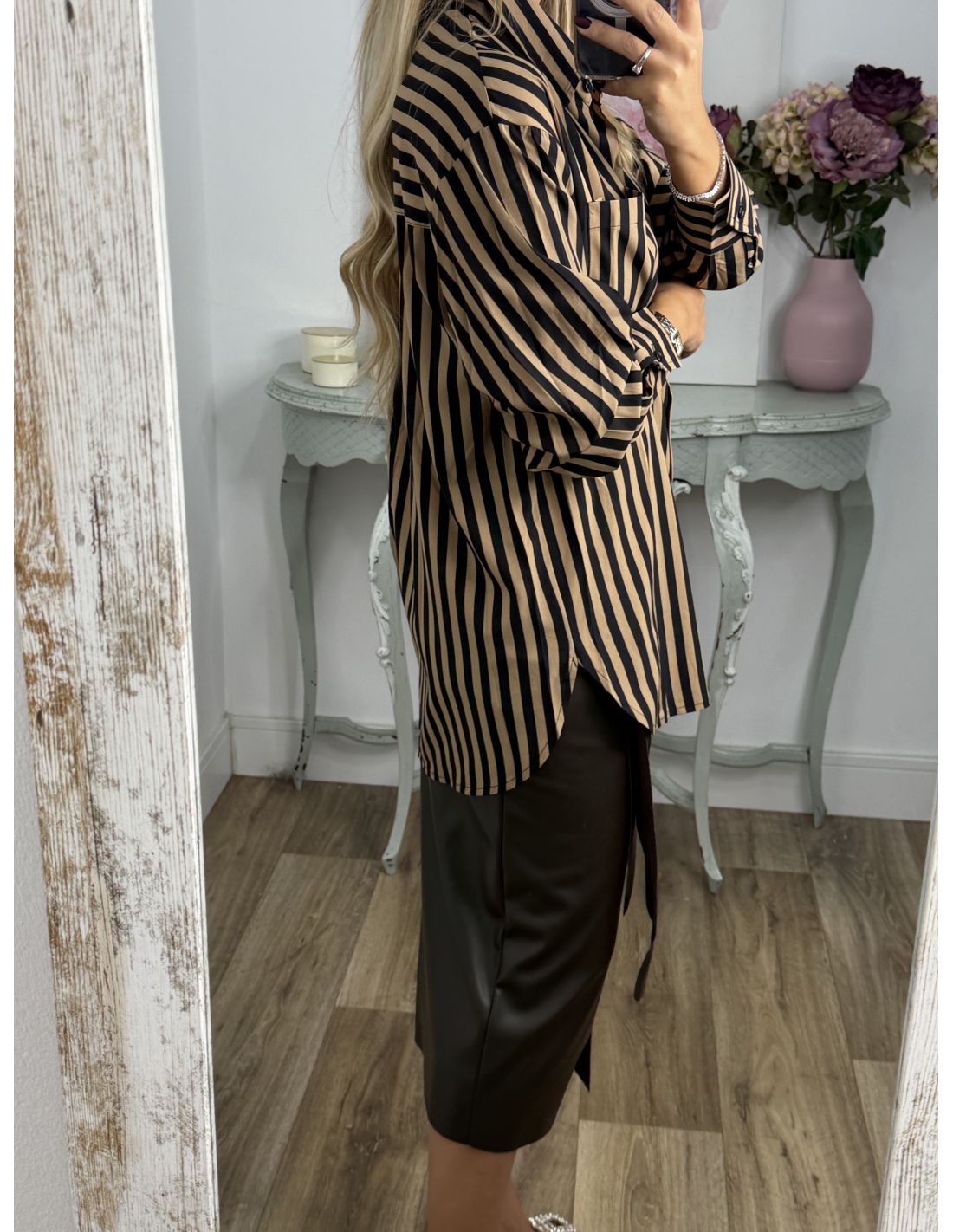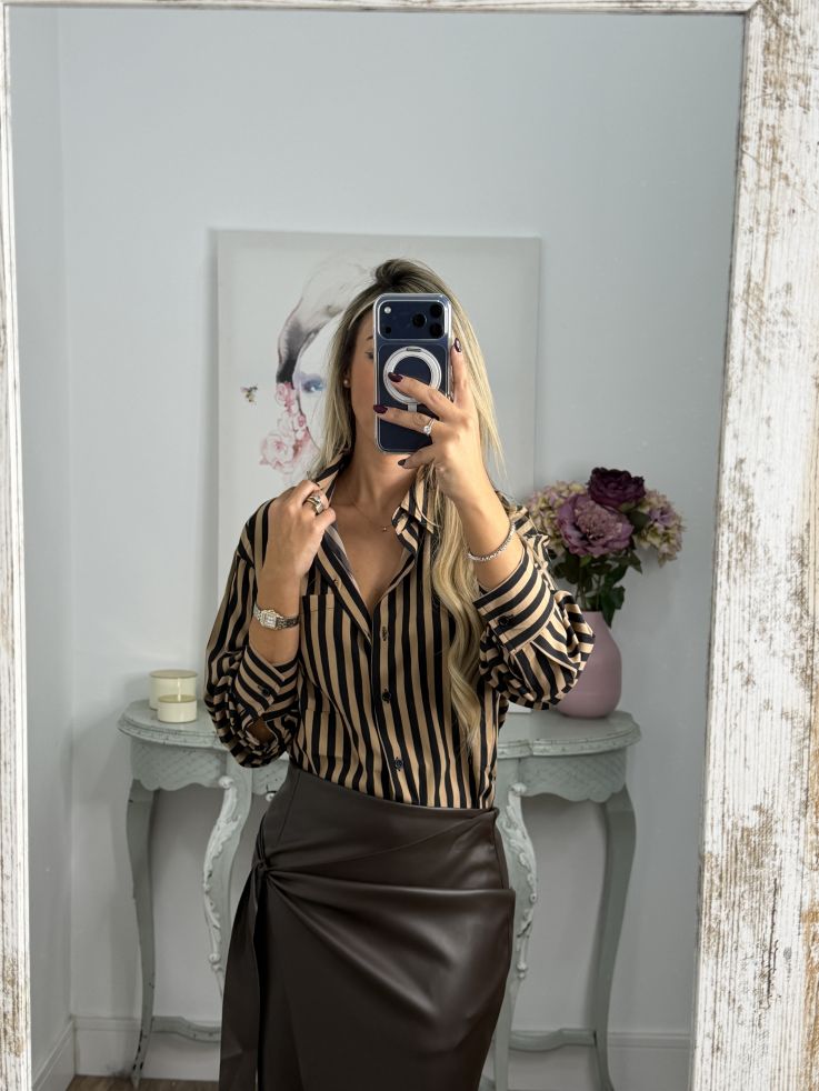 Camisa rayas camel y negra con bolsillo