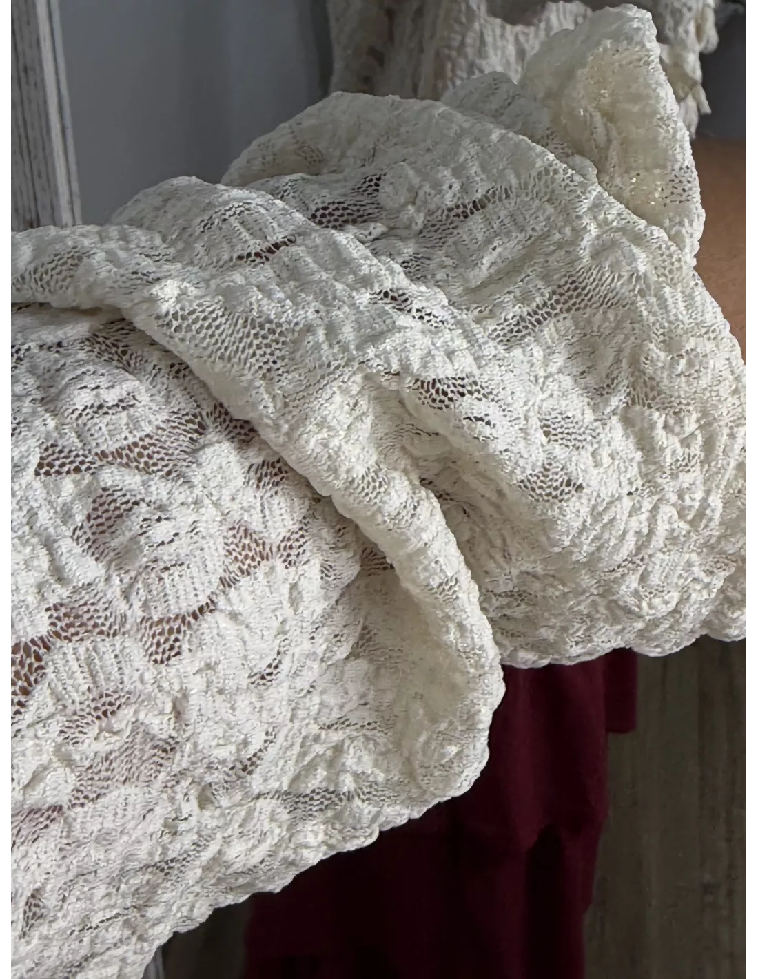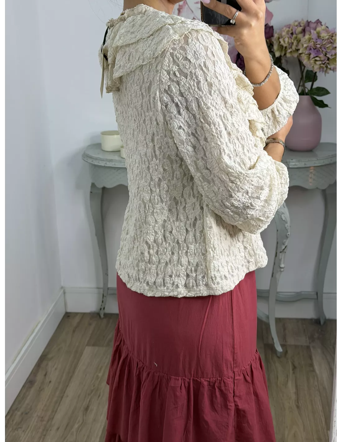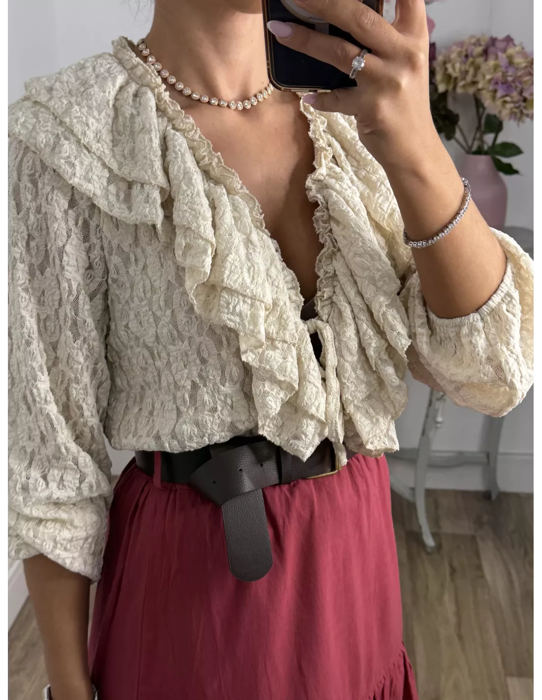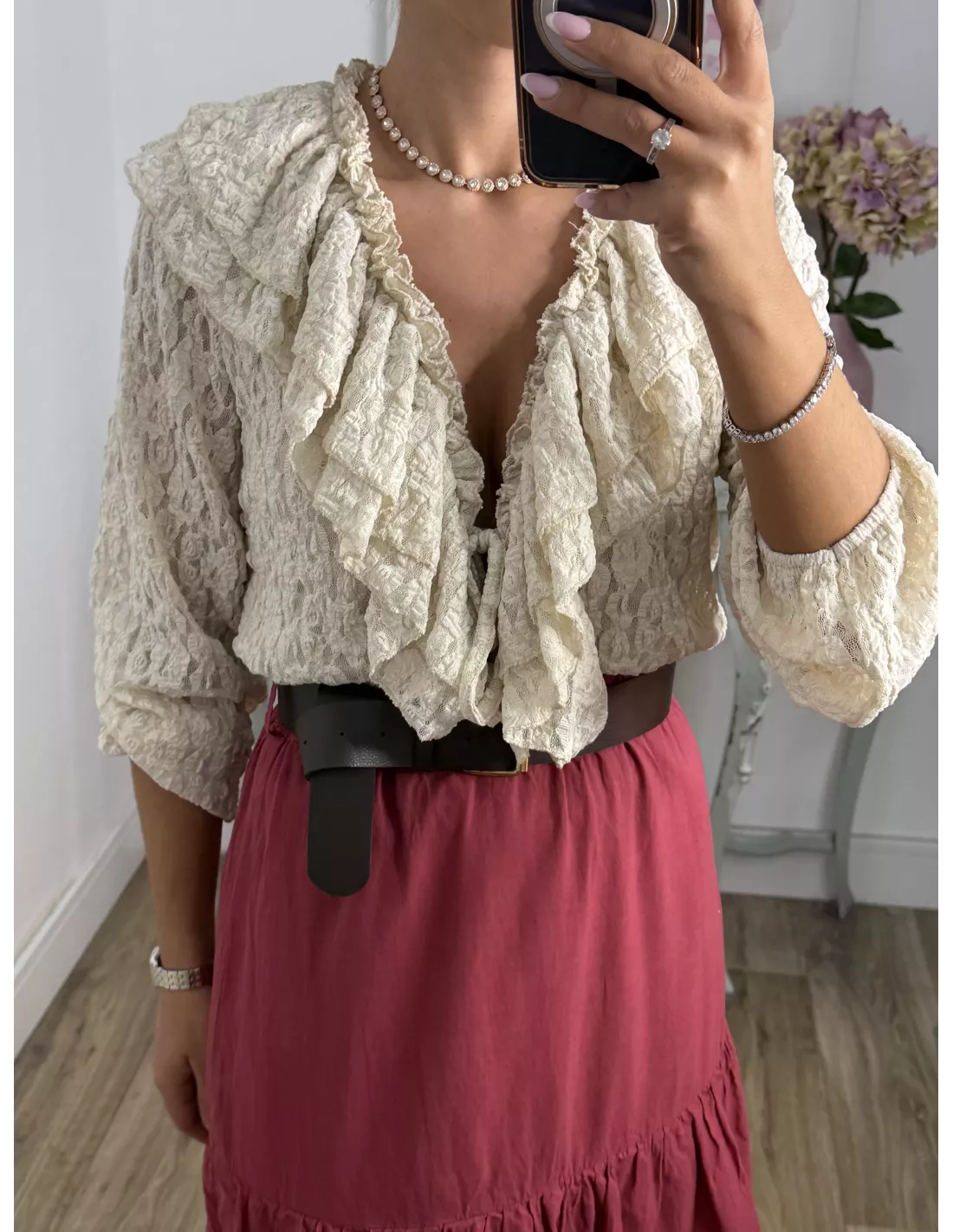 Camisa de puntilla que el tejido es elástico. Va forrada toda la parte delantera y la parte de atrás a excepción de las mangas. El corte es correcto.