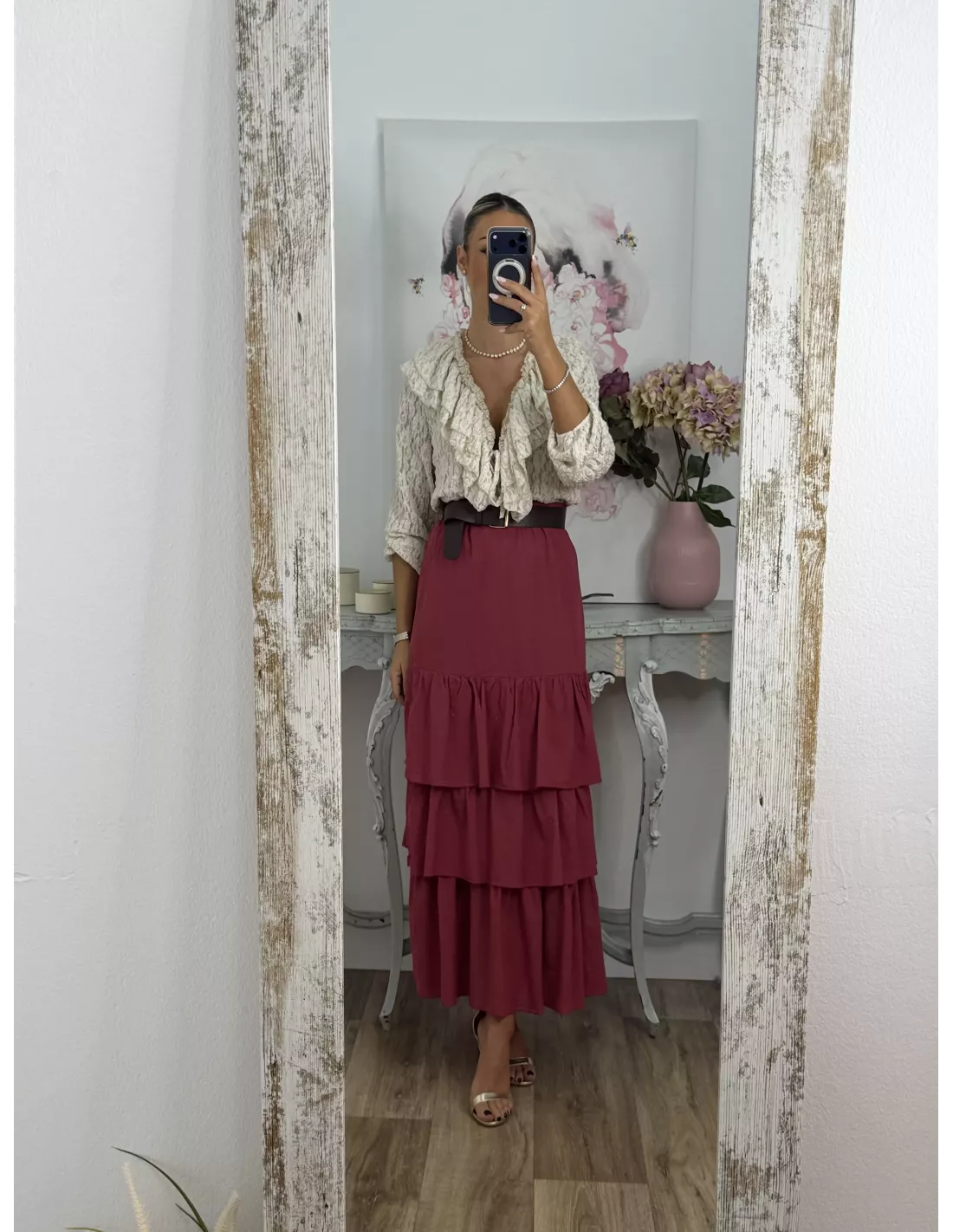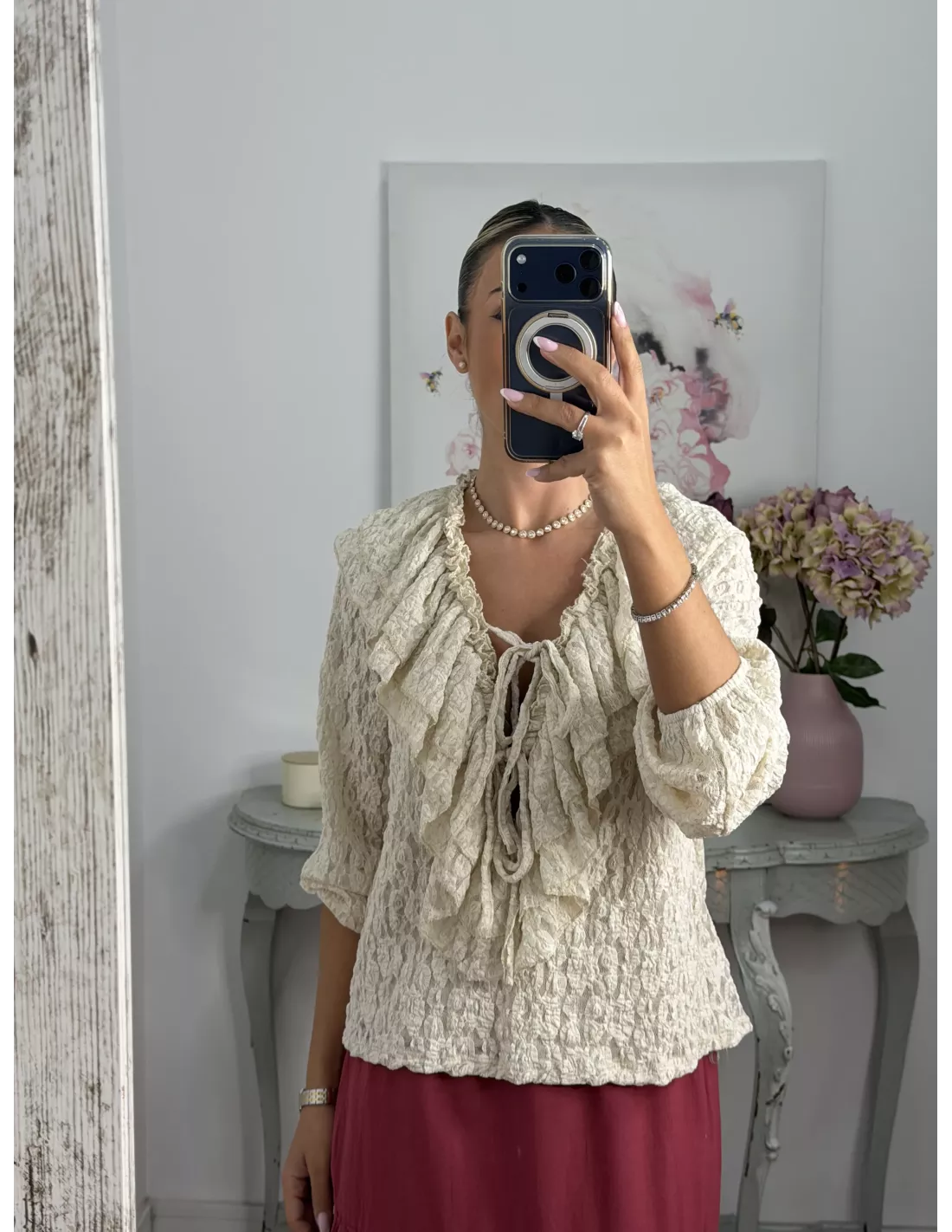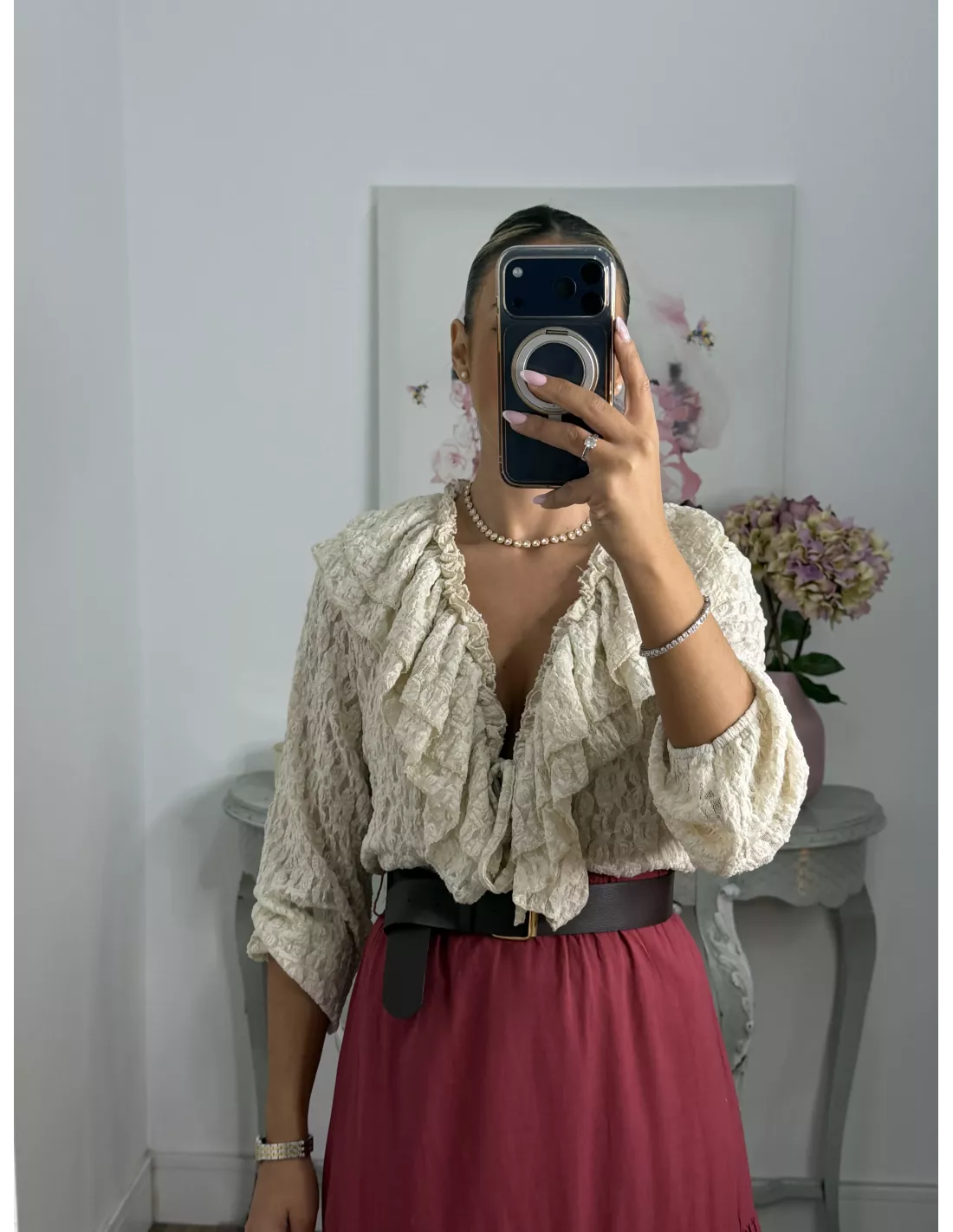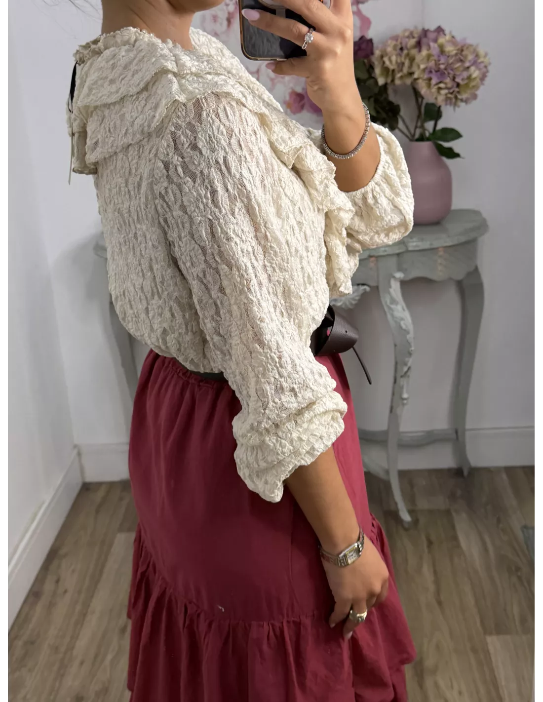Camisa de puntilla que el tejido es elástico. Va forrada toda la parte delantera y la parte de atrás a excepción de las mangas. El corte es correcto.
