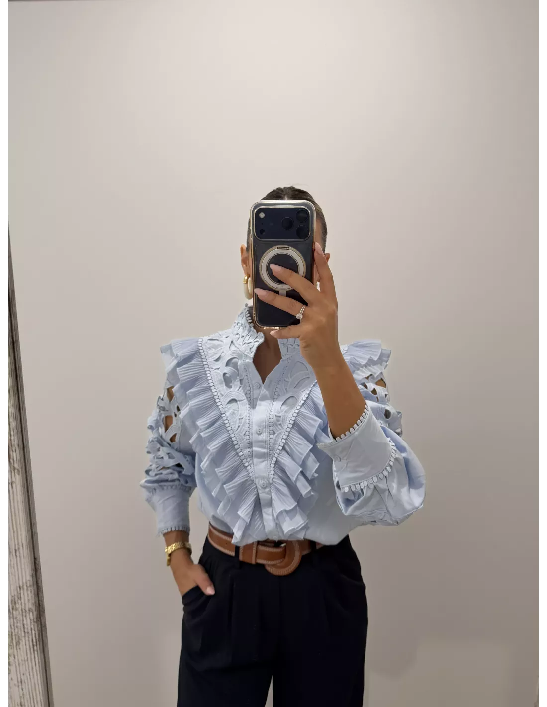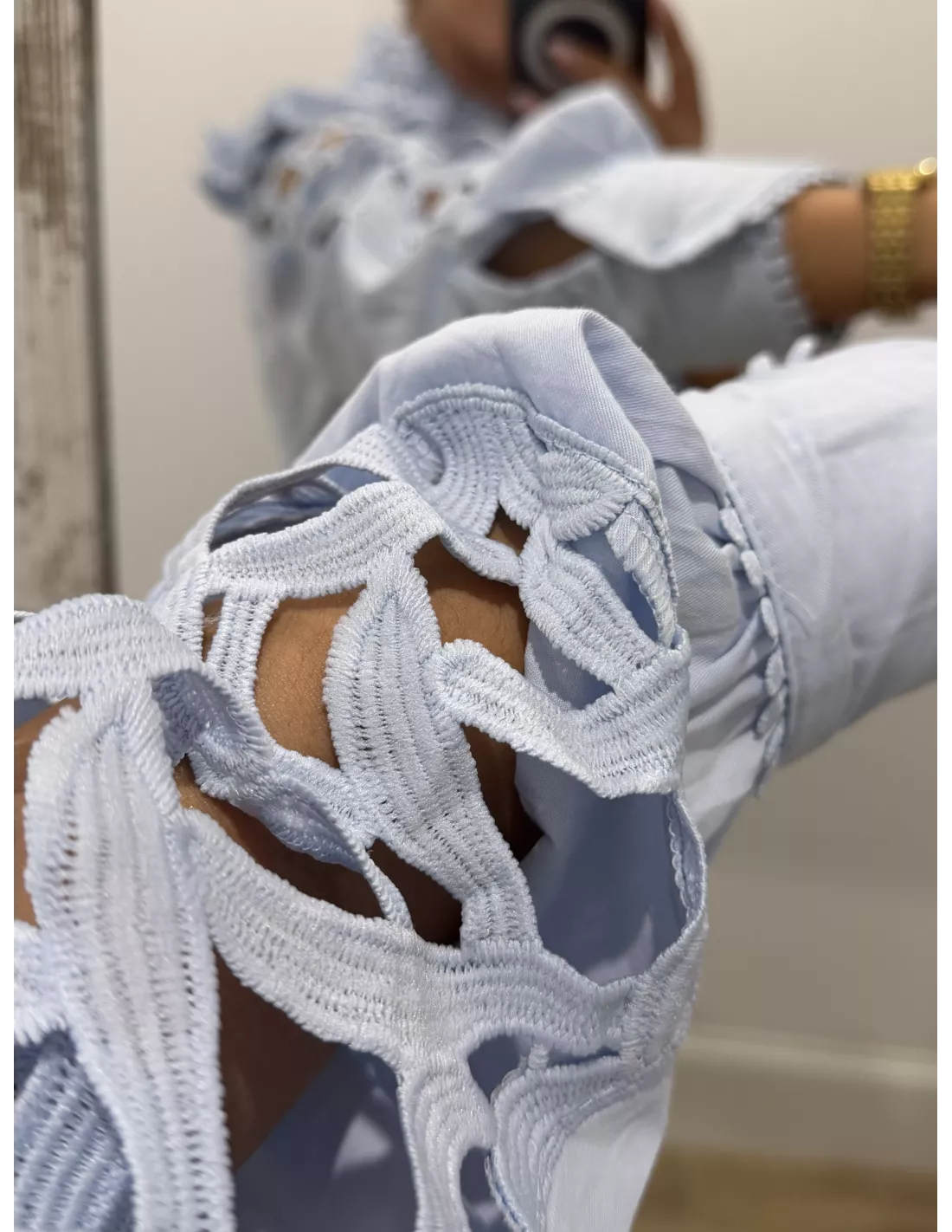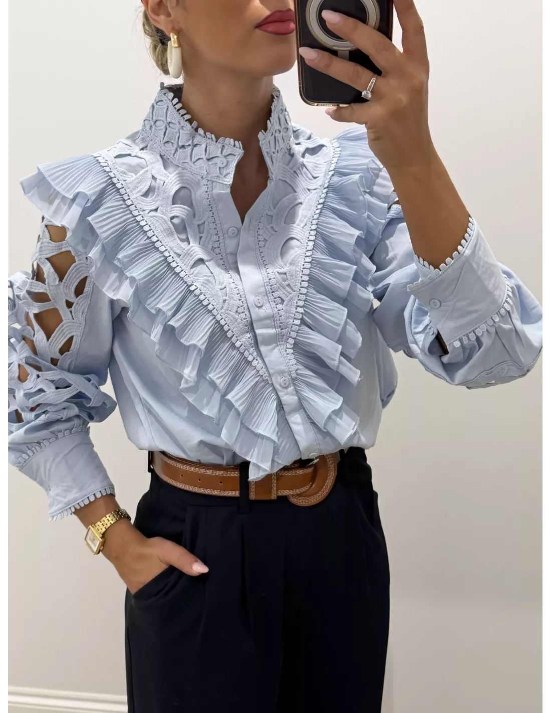Camisa rosa que va con volantes en la parte delantera. La manga es de un tejido perforado y tiene un puño ancho. Es de corte recto.