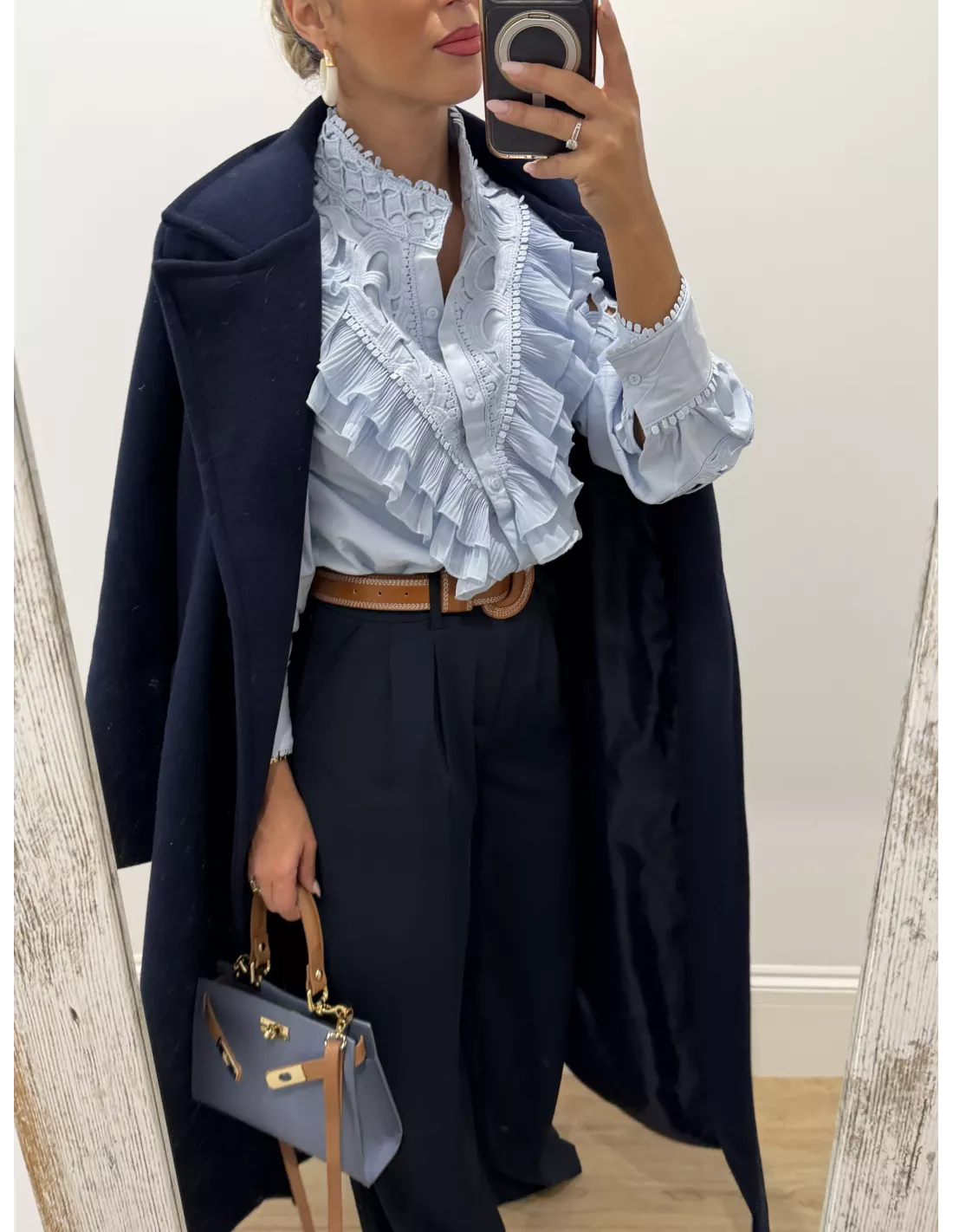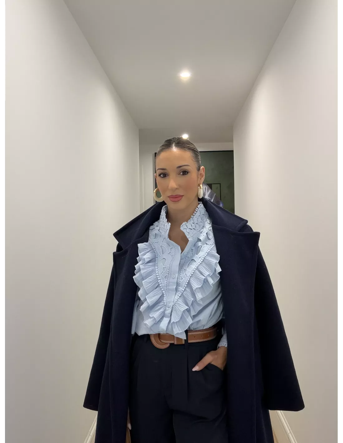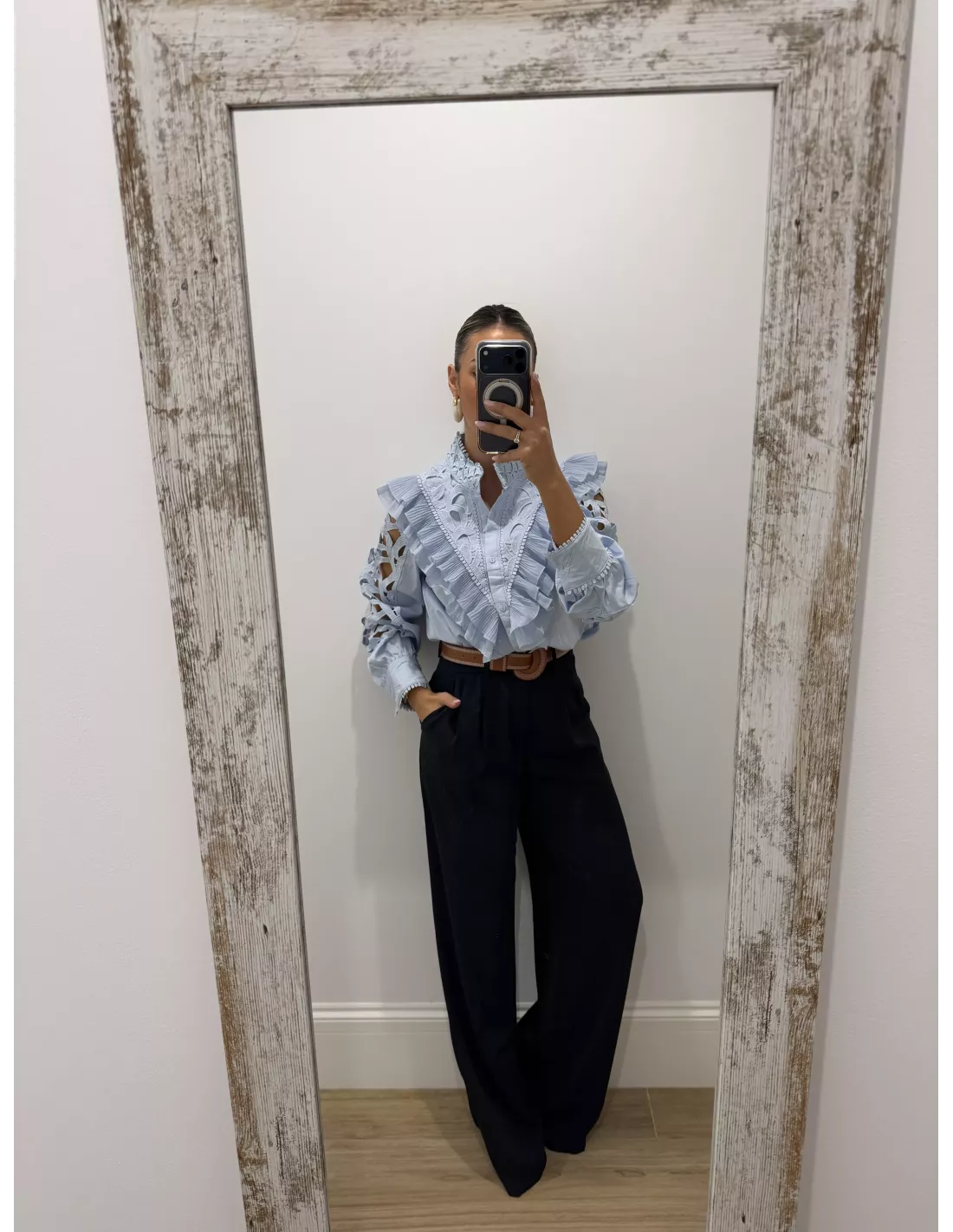 Camisa rosa que va con volantes en la parte delantera. La manga es de un tejido perforado y tiene un puño ancho. Es de corte recto.