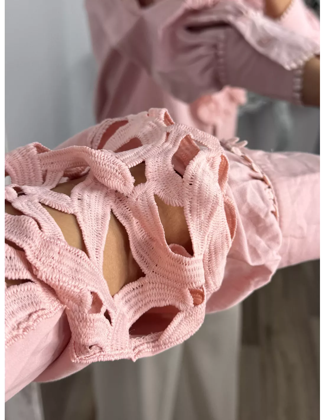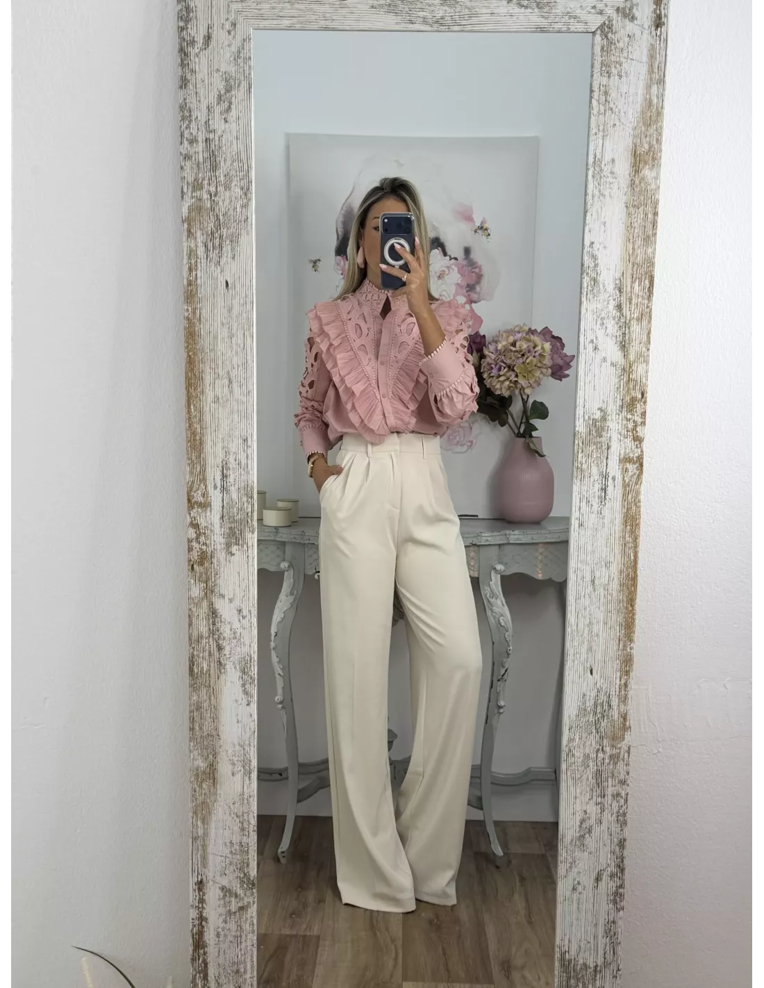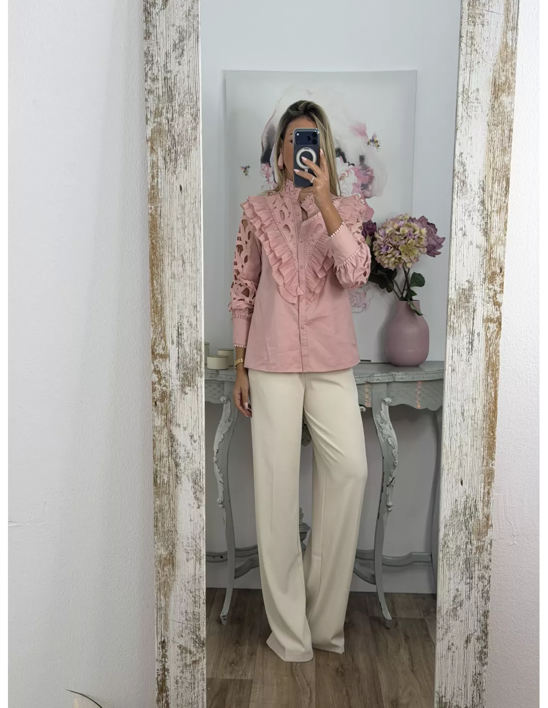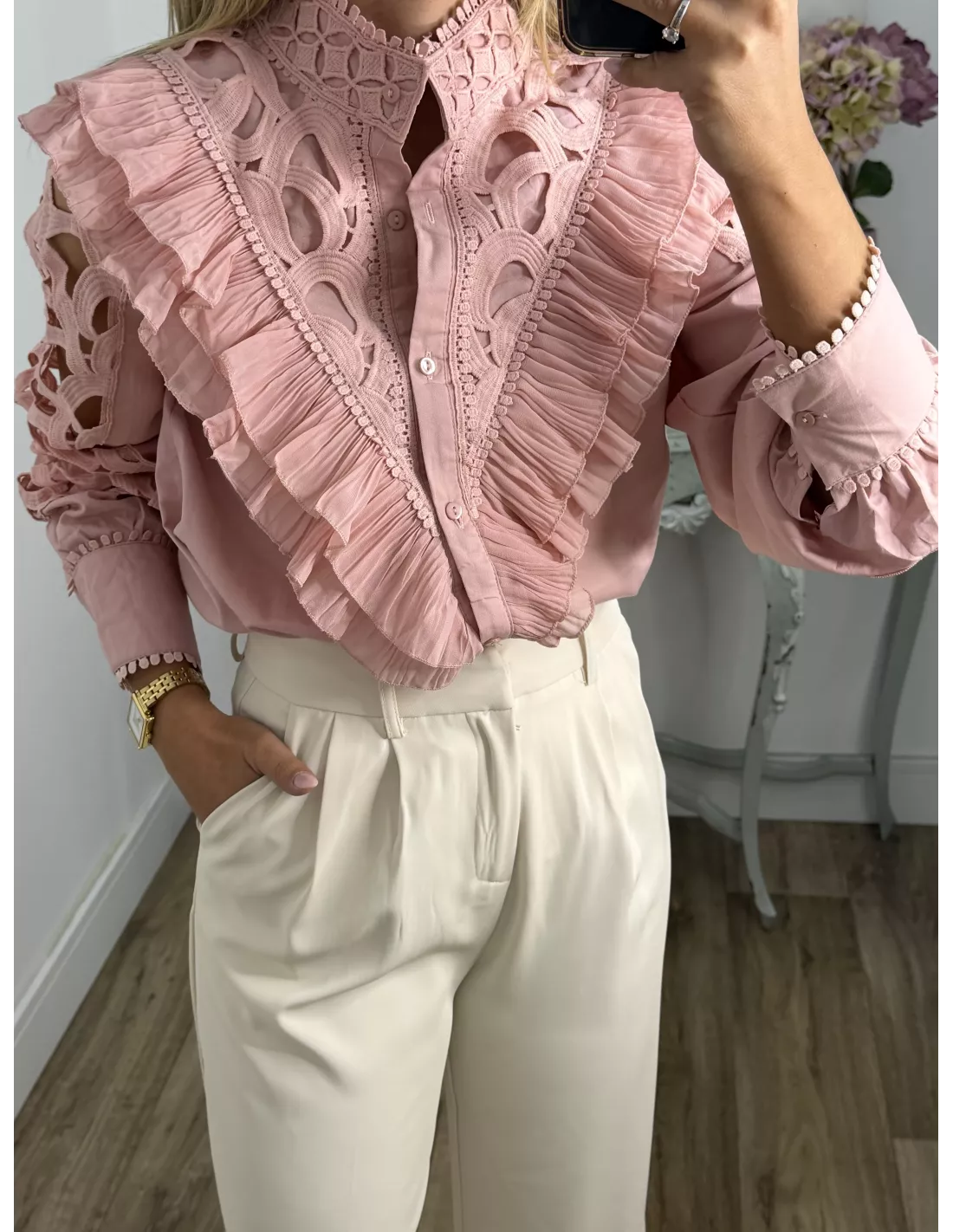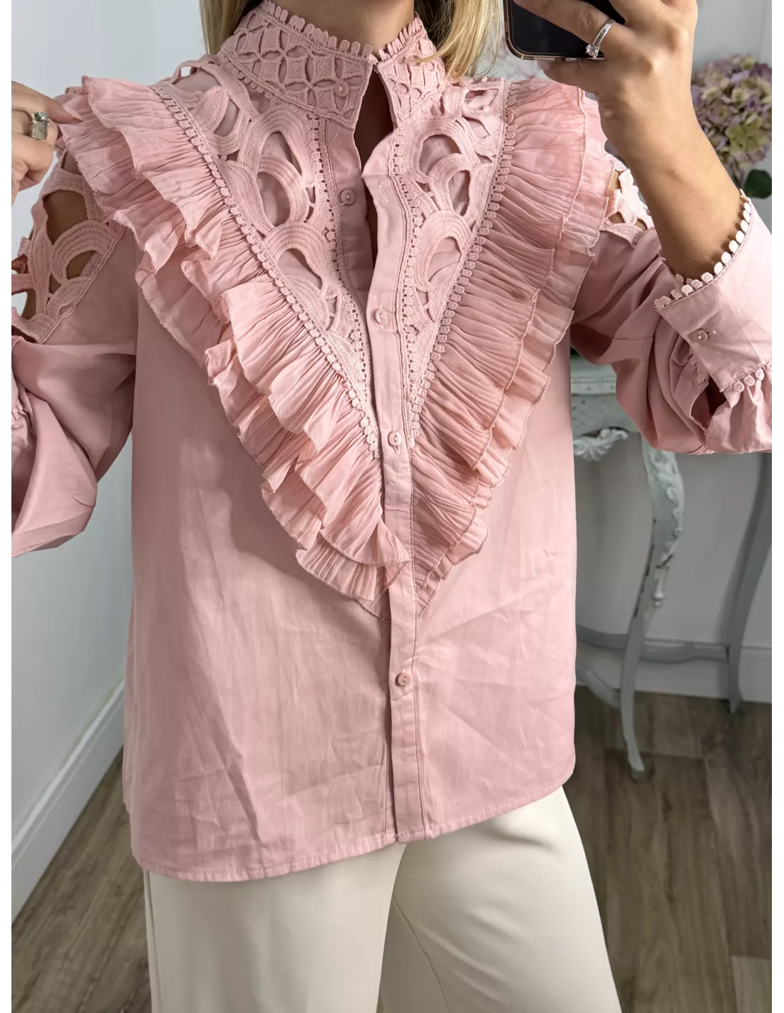 Camisa rosa que va con volantes en la parte delantera. La manga es de un tejido perforado y tiene un puño ancho. Es de corte recto.