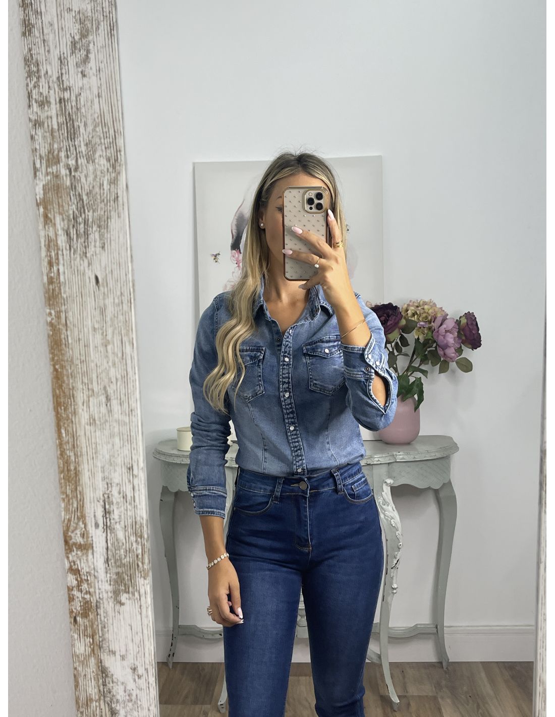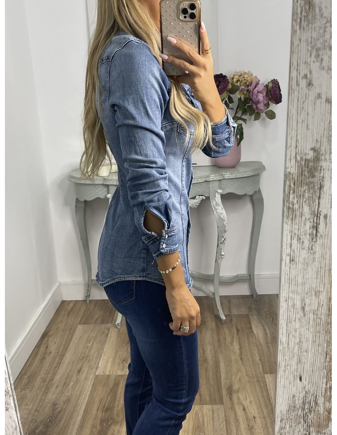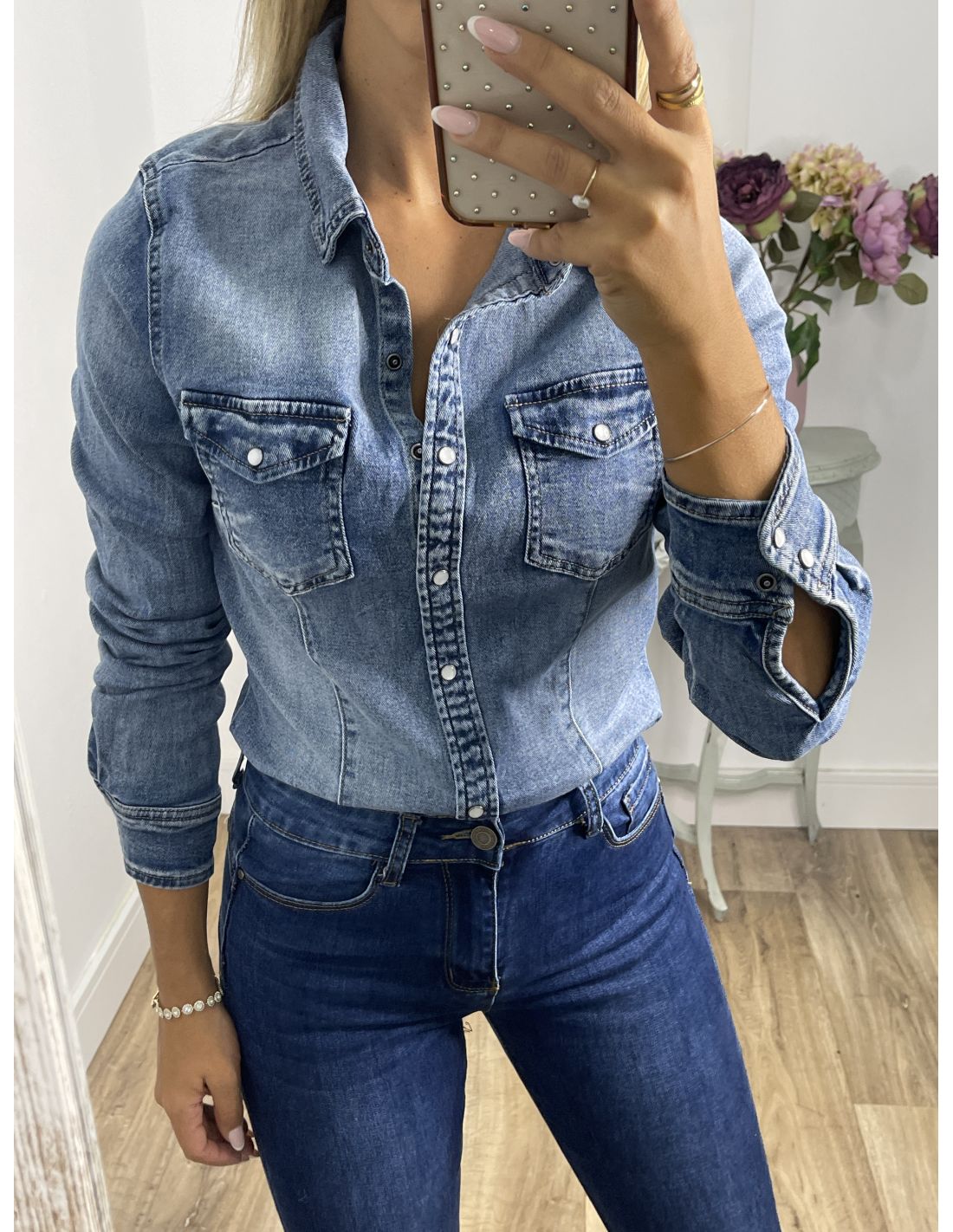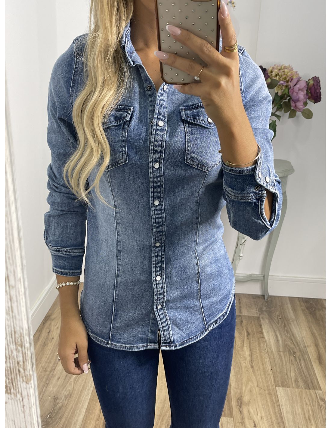 Camisa vaquera denim, efecto desgastado. De corte ajustada con botones de clips. Hace la forma de la cintura. Es elásticas.